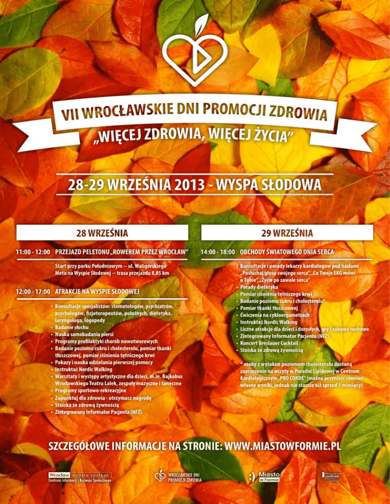 11:00 - 12:00 PRZEJAZD PELETONU „ROWEREM PRZEZ WROCŁAW” Start przy parku Południowym − ul. Waligórskiego Meta na Wyspie Słodowej − trasa przejazdu 8,85 km 12:00 - 17:00 ATRAKCJE NA WYSPIE SŁODOWEJ • Konsultacje specjalistów: stomatologów, psychiatrów, psychologów, fizjoterapeutów, położnych, dietetyka, laryngologa, logopedy • Badanie słuchu • Nauka samobadania piersi • Programy profilaktyki chorób nowotworowych • Badanie poziomu cukru i cholesterolu, pomiar tkanki tłuszczowej, pomiar ciśnienia tętniczego krwi • Pokazy i nauka udzielania pierwszej pomocy • Instruktaż Nordic Walking • Warsztaty i występy artystyczne dla dzieci, m.in. Bajkobus Wrocławskiego Teatru Lalek, zespoły muzyczne i taneczne • Programy sportowo-rekreacyjne • Zapunktuj dla zdrowia - otrzymasz nagrodę • Stoiska ze zdrową żywnością • Zintegrowany Informator Pacjenta (NFZ) 14:00 - 18:00 OBCHODY ŚWIATOWEGO DNIA SERCA • Konsultacje i porady lekarzy kardiologów pod hasłami „Posłuchaj głosu swojego serca”, „Co Twoje EKG mówi o Tobie”, „Życie po zawale serca” • Porady dietetyka • Pomiar ciśnienia tętniczego krwi • Badanie poziomu cukru i cholesterolu* • Pomiar tkanki tłuszczowej • Ćwiczenia na cykloergometrach • Instruktaż Nordic Walking • Liczne atrakcje dla dzieci i dorosłych, gry i zabawy ruchowe • Zintegrowany Informator Pacjenta (NFZ) • Koncert Breslauer Cocktail • Stoiska ze zdrową żywnością * osoby z wysokim poziomem cholesterolu dostaną zaproszenie na wizyty w Poradni Lipidowej w Centrum Kardiologicznym „PRO CORDE” (można przynieść również własne wyniki, jednak nie starsze niż sprzed 3 miesięcy) SZCZEGÓŁOWE INFORMACJE NA STRONIE: WWW.MIASTOWFORMIE.PL