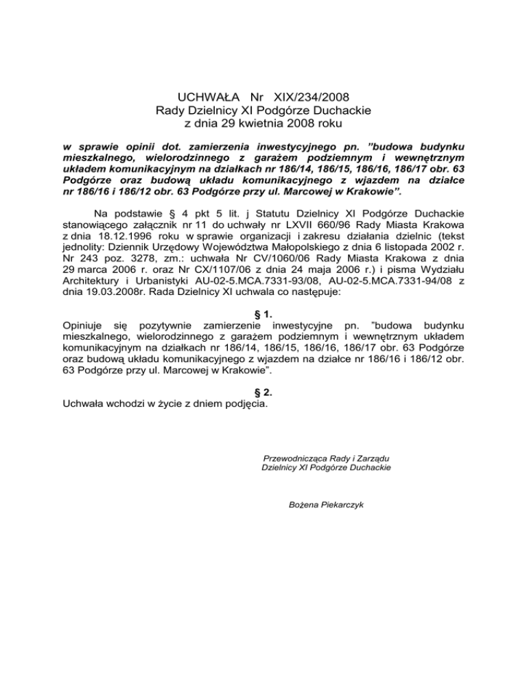 UCHWAŁA Nr XIX/234/2008 Rady Dzielnicy XI Podgórze Duchackie z dnia 29 kwietnia 2008 roku w sprawie opinii dot. zamierzenia inwestycyjnego pn. ”budowa budynku mieszkalnego, wielorodzinnego z gara em podziemnym i wewntrznym układem komunikacyjnym na działkach nr 186/14, 186/15, 186/16, 186/17 obr. 63 Podgórze oraz budow układu komunikacyjnego z wjazdem na działce nr 186/16 i 186/12 obr. 63 Podgórze przy ul. Marcowej w Krakowie”. Na podstawie § 4 pkt 5 lit. j Statutu Dzielnicy XI Podgórze Duchackie stanowi cego zał cznik nr 11 do uchwały nr LXVII 660/96 Rady Miasta Krakowa z dnia 18.12.1996 roku w sprawie organizacji i zakresu działania dzielnic (tekst jednolity: Dziennik Urz dowy Województwa Małopolskiego z dnia 6 listopada 2002 r. Nr 243 poz. 3278, zm.: uchwała Nr CV/1060/06 Rady Miasta Krakowa z dnia 29 marca 2006 r. oraz Nr CX/1107/06 z dnia 24 maja 2006 r.) i pisma Wydziału Architektury i Urbanistyki AU-02-5.MCA.7331-93/08, AU-02-5.MCA.7331-94/08 z dnia 19.03.2008r. Rada Dzielnicy XI uchwala co nast puje: § 1. Opiniuje si pozytywnie zamierzenie inwestycyjne pn. ”budowa budynku mieszkalnego, wielorodzinnego z garaem podziemnym i wewn trznym układem komunikacyjnym na działkach nr 186/14, 186/15, 186/16, 186/17 obr. 63 Podgórze oraz budow układu komunikacyjnego z wjazdem na działce nr 186/16 i 186/12 obr. 63 Podgórze przy ul. Marcowej w Krakowie”. § 2. Uchwała wchodzi w ycie z dniem podj cia. Przewodnicz ca Rady i Zarz du Dzielnicy XI Podgórze Duchackie Boena Piekarczyk Uzasadnienie: Realizuj c wniosek prywatnego inwestora o wydanie opinii dotycz cej zamierzenia inwestycyjnego pn. ”budowa budynku mieszkalnego, wielorodzinnego z garaem podziemnym i wewn trznym układem komunikacyjnym na działkach nr 186/14, 186/15, 186/16, 186/17 obr. 63 Podgórze oraz budow układu komunikacyjnego z wjazdem na działce nr 186/16 i 186/12 obr. 63 Podgórze przy ul. Marcowej w Krakowie” po przeprowadzeniu szczegółowej analizy ustalono co nast puje. Wyej wymieniona inwestycja ma zosta przeprowadzona na terenie s siaduj cym z terenami zabudowanymi zabudow wielorodzinn . W opinii Rady Dzielnicy XI na powołanych wyej działkach powinna powsta zabudowa dostosowana do istniej cej na terenach z ni s siaduj cych, planowane zamierzenie inwestycyjne spełnia w /w załoenie. Rada Dzielnicy XI stoi na stanowisku, i zarówno teren obj ty wnioskiem, jak i tereny przyległe powinny zosta racjonalnie zagospodarowane z zachowaniem struktury zabudowy odpowiedniej dla tego terenu. Po przeanalizowaniu ustalonego w omawianej sprawie stanu faktycznego stwierdzono, i przeprowadzenie w/w inwestycji ley równie w interesie społeczno ci lokalnej. Z powołanych wyej wzgl dów w opinii Rady Dzielnicy XI zasadnym jest pozytywne zaopiniowanie wniosku w sprawie zamierzenia inwestycyjnego pn. ”budowa budynku mieszkalnego, wielorodzinnego z garaem podziemnym i wewn trznym układem komunikacyjnym na działkach nr 186/14, 186/15, 186/16, 186/17 obr. 63 Podgórze oraz budow układu komunikacyjnego z wjazdem na działce nr 186/16 i 186/12 obr. 63 Podgórze przy ul. Marcowej w Krakowie”.