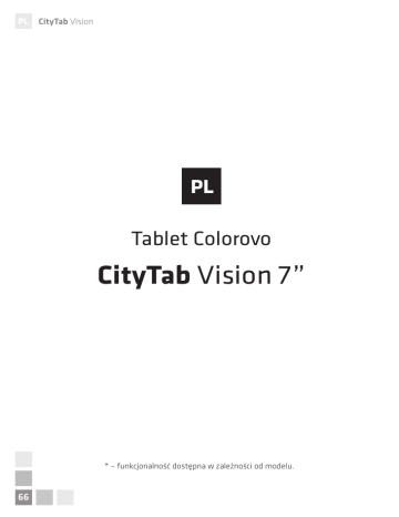 CityTab Vision Tablet Colorovo CityTab Vision 7” * – funkcjonalność dostępna w zależności od modelu. 66 CityTab Vision Instrukcja obsługi urządzenia Dziękujemy za zakup tabletu Colorovo CityTab Vision 7”. Jesteśmy przekonani, że spełni on Państwa oczekiwania. Przed rozpoczęciem użytkowania urządzenia prosimy o zapoznanie się z poniższą instrukcją obsługi. Informacje bezpieczeństwa Prosimy o stosowanie się do niniejszej instrukcji oraz oznaczeń umieszczonych na urządzeniu. Urządzenie należy eksploatować tylko i wyłącznie zgodnie z jego przeznaczeniem. Urządzenia nie przechowuj i nie używaj w skrajnie niskich lub wysokich temperaturach (tj. spoza zakresu 0°C – +40°C). Nie zostawiaj tabletu na dłuższy czas w samochodzie. Urządzenia nie przechowuj i nie używaj w warunkach o wysokim zapyleniu. Urządzenia nie przechowuj i nie używaj w warunkach o wysokiej wilgotności. Urządzenia nie przechowuj i nie używaj w pobliżu źródeł otwartego ognia. Chroń urządzenie przed bezpośrednim działaniem promieni słonecznych. Chroń urządzenie przed kontaktem z cieczami (np. wodą). Chroń urządzenie przed uderzeniami, upadkami oraz naprężeniami. Chroń urządzenie przed silnym promieniowaniem elektromagnetycznym oraz ładunkami elektrostatycznymi. Nie podłączaj urządzenia do zasilania mokrymi rękoma. Może to doprowadzić do jego uszkodzenia, porażenia prądem, zwarcia, a nawet pożaru. Nie obsługuj urządzenia mokrymi rękoma. Może to doprowadzić do jego uszkodzenia, porażenia prądem, zwarcia, a nawet pożaru. Nie obsługuj urządzenia podczas prowadzenia pojazdu. Może to doprowadzić do zagrożenia ruchu, a ponadto jest niezgodne z prawem w wielu krajach. Przestrzegaj ograniczeń dotyczących używania urządzeń elektronicznych oraz radiowych. Nie instaluj urządzenia w ograniczonej przestrzeni (np. poprzez zabudowanie). Zapewnij wentylację urządzenia. Urządzenie należy utylizować zgodnie z przepisami ochrony środowiska. Ładowarka może pracować tylko i wyłącznie w poprawnie funkcjonującej instalacji elektrycznej (230V ~50Hz). Ładowarka urządzenia jest produktem klasy II z podwójną izolacją, bez zewnętrznego uziemienia. Podczas transmisji danych nie odłączaj urządzenia od komputera lub nośnika pamięci. Regularnie wykonuj kopie zapasowe danych. 67 CityTab Vision Wadliwie funkcjonujące lub uszkodzone urządzenie niezwłocznie odłącz od zasilania i oddaj do serwisu gwaranta. Nie dokonuj samodzielnych napraw lub modyfikacji urządzenia oraz jego akcesoriów. Gwarant nie ponosi odpowiedzialności za uszkodzenie lub utratę danych. Informacje bezpieczeństwa dotyczące słuchu Urządzenie spełnia wymagania obowiązujących przepisów w sprawie ograniczenia głośności wyjściowej do bezpiecznego poziomu w konsumenckich urządzeniach audio. Odsłuch z urządzenia przy dużej głośności za pomocą słuchawek nausznych lub dousznych grozi trwałym uszkodzeniem słuchu. Nawet jeżeli użytkownik przyzwyczai się do odsłuchu dźwięku z dużą głośnością i jej poziom wydaje się mu normalny, nie wyklucza to ryzyka uszkodzenia słuchu. Należy zmniejszyć głośność urządzenia do rozsądnego poziomu, aby uniknąć trwałego uszkodzenia słuchu. W razie pojawienia się wrażenia „dzwonienia” w uszach, natychmiast zmniejsz głośność lub wyłącz urządzenie. Urządzenie zostało przebadane akustycznie po podłączeniu dołączonych do niego słuchawek. W celu ochrony słuchu używaj wyłącznie następujących modeli słuchawek: słuchawek spełniających wymagania obowiązujących przepisów. Inne rodzaje słuchawek mogą generować wyższy poziom dźwięku (dłuższe słuchanie dźwięku z maksymalną głośnością grozi uszkodzeniem słuchu). Dźwięki mogą zaburzać orientację. Nie używaj urządzenia podczas prowadzenia pojazdu. Może to doprowadzić do zagrożenia ruchu, a ponadto jest niezgodne z prawem w wielu krajach. Zachowaj najwyższą ostrożność podczas użytkowania urządzenia w sytuacjach niebezpiecznych, spowodowanych ograniczoną zdolnością słuchową, lub przerwij na jakiś czas korzystanie z urządzenia. Jeżeli słuchawki mają „otwartą” budowę, tj. umożliwiają odbiór dźwięków otoczenia, nie zwiększaj głośności na tyle, aby dźwięk ze słuchawek zagłuszał dźwięki otoczenia. Poziom „komfortowego słyszenia” przystosowuje się z biegiem czasu do większej głośności. Siła dźwięku, która wydaje się wówczas użytkownikowi „normalna”, może w rzeczywistości być bardzo duża i szkodzić słuchowi. Należy zabezpieczyć się przed tym zjawiskiem, ustawiając bezpieczną siłę dźwięku urządzenia zanim słuch użytkownika przystosuje się do głośności. Aby ustawić bezpieczną głośność: 1. Włącz odtwarzanie dźwięku przy niskiej głośności. 2. Powoli zwiększaj głośność do poziomu, przy którym dźwięk słychać wyraźnie, bez zakłóceń i nie jest uciążliwy. Jest to komfortowa głośność dźwięku i nie należy jej zmieniać. 68 CityTab Vision Opisy symboli bezpieczeństwa iorun ze strzałką wewnątrz trójkąta równobocznego ostrzega użytkownika P o występowaniu wewnątrz obudowy urządzenia nieizolowanych elementów pod napięciem, mogących stanowić ryzyko porażenia prądem. Aby zmniejszyć ryzyko porażenia prądem, nie należy zdejmować pokrywy (tyłu) urządzenia, ponieważ wewnątrz obudowy nie ma elementów wymienialnych przez użytkownika. Serwis należy powierzyć osobom wykwalifikowanym. Wykrzyknik wewnątrz trójkąta równobocznego ostrzega użytkownika, że w dokumentacji dołączonej do urządzenia znajdują się ważne informacje dotyczące obsługi i konserwacji. Prawidłowa utylizacja produktu. Urządzenia nie należy wyrzucać do zwykłych pojemników na odpady komunalne. Aby zapobiec potencjalnym zagrożeniom dla środowiska i zdrowia ludzkiego spowodowanym nieprawidłową utylizacją odpadów, n