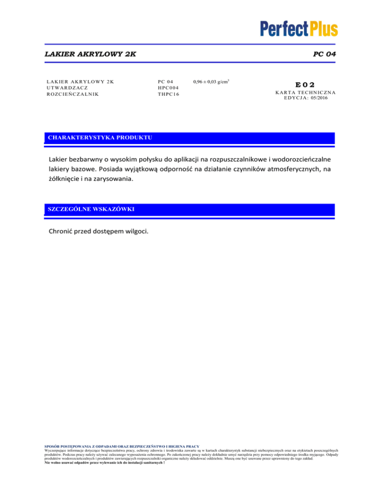 LAKIER AKRYLOWY 2K L A K IE R A K R Y L O W Y 2 K U T W AR D Z AC Z R O Z C IE Ń C Z A L N IK PC 04 PC 04 HPC004 THPC16 0,96 ± 0,03 g/cm3 E02 K A R T A T E C H N IC Z N A E D Y C J A : 05/2016 CHARAKTERYSTYKA PRODUKTU Lakier bezbarwny o wysokim połysku do aplikacji na rozpuszczalnikowe i wodorozcieńczalne lakiery bazowe. Posiada wyjątkową odporność na działanie czynników atmosferycznych, na żółknięcie i na zarysowania. SZCZEGÓLNE WSKAZÓWKI Chronić przed dostępem wilgoci. SPOSÓB POSTĘPOWANIA Z ODPADAMI ORAZ BEZPIECZEŃSTWO I HIGIENA PRACY Wyczerpujące informacje dotyczące bezpieczeństwa pracy, ochrony zdrowia i środowiska zawarte są w kartach charakterystyk substancji niebezpiecznych oraz na etykietach poszczególnych produktów. Podczas pracy należy używać zalecanego wyposażenia ochronnego. Po zakończonej pracy należy dokładnie umyć narzędzia przy pomocy odpowiedniego środka myjącego. Odpady produktów wodorozcieńczalnych i produktów zawierających rozpuszczalniki organiczne należy składować oddzielnie. Muszą one być usuwane przez uprawniony do tego zakład. Nie wolno usuwać odpadów przez wylewanie ich do instalacji sanitarnych ! LAKIER AKRYLOWY 2K PC 04 GRUBOŚĆ SUCHEJ CHARAKTERYSTYKA akryl POWŁOKI CZAS ODPAROWANIA CZĘŚCI STAŁE [%] w 20°C KOLOR ZAWARTOŚĆ LZO 50-60 μm na zamówienie 2 0 0 4 / 4 2 / W E I IB (e) (840) 630 10-15 min PYŁOSUCHOŚĆ w 20°C SUCHY W DOTYKU w 20°C GOTOWY DO MONTAŻU w 20°C STOSUNEK MIESZANIA OBJĘTOŚCIOWY PC 04 HPC004 THPC16 100 50 0-10 6-7 h w 20°C 30 min w 60°C CAŁKOWICIE WYSUSZONY CZAS PRZYDATNOŚCI NASTĘPNA POWŁOKA DO UŻYCIA w 20°C LEPKOŚĆ ROBOCZA w 20°C SZLIFOWANIE RĘCZNE 14-15 s DIN4 NA SUCHO SZLIFOWANIE RĘCZNE 1,2-1,3 mm NA MOKRO DYSZA PISTOLETU GRAWITACYJNEGO 2,5-3,5 bar SZLIFOWANIE MECHANICZE NA SUCHO SZLIFOWANIE MECHANICZE NA 1,4-1,5 mm DYSZA PISTOLETU PODCIŚNIENIOWEGO MOKRO 3,5-5 bar WYDAJNOŚĆ LICZBA WARSTW 2 MAGAZYNOWANIE 24 miesiące w suchym i chłodnym miejscu (5°C-35°C) PRODUKT PRZEZNACZONY TYLKO DO UŻYTKU PROFESJONALNEGO ! Podane informacje są jedynie wskazówką do prawidłowego zastosowania produktu. Wszystkie osoby stosujące niniejszy produkt bez uprzedniego zapoznania się z dalszymi informacjami i profesjonalnego przeszkolenia, czynią na własne ryzyko. Firma PRONET COLOR Sp. z o.o. nie ponosi w takim przypadku żadnej odpowiedzialności za powstający efekt końcowy oraz szkody spowodowane niewłaściwym użyciem produktu. Zawarte w niniejszej karcie informacje mogą być na bieżąco uaktualniane zgodnie z naszą dewizą stałego udoskonalania produktu. Podane w niniejszej karcie parametry stosowania produktu są zależne od czynników zewnętrznych, takich jak: temperatura otoczenia, wilgotność, grubość aplikowanych warstw oraz parametrów pracy kabiny. Pronet-Color Sp. z o.o. Turkusowa 12A 81-158 Gdynia TEL. 58 625 09 99 FAX 58 665 39 99 E-MAIL [email protected]