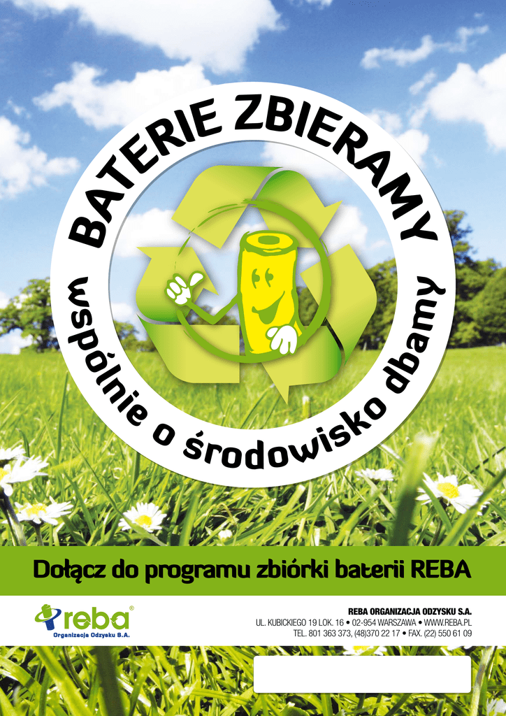 ln oś s i ro d o w i e db wspó amy Bat y am b z i e e i r r e o k Dołącz do programu zbiórki baterii REBA REBA Organizacja Odzysku S.A. ul. Kubickiego 19 lok. 16 • 02-954 Warszawa • www.reba.pl tel. 801 363 373, (48)370 22 17 • fax. (22) 550 61 09