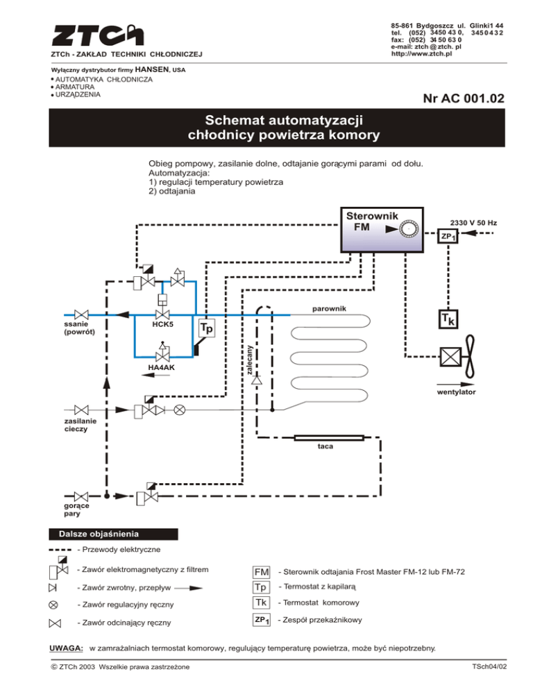 85-861 Bydgoszcz ul. Glinki1 44 tel. (052) 3450 43 0, 3 45 0 4 3 2 fax: (052) 34 50 63 0 e-mail: ztch @ ztch. pl http://www.ztch.pl ZTCh - ZAK£AD TECHNIKI CH£ODNICZEJ Wy³¹czny dystrybutor firmy HANSEN, USA AUTOMATYKA CH£ODNICZA ARMATURA URZ¥DZENIA Nr AC 001.02 Schemat automatyzacji ch³odnicy powietrza komory Obieg pompowy, zasilanie dolne, odtajanie gor¹cymi parami od do³u. Automatyzacja: 1) regulacji temperatury powietrza 2) odtajania Sterownik FM 2330 V 50 Hz ZP1 parownik HCK5 Tk Tp HA4AK zalecany ssanie (powrót) wentylator zasilanie cieczy taca gor¹ce pary Dalsze objaœnienia - Przewody elektryczne - Zawór elektromagnetyczny z filtrem FM - Sterownik odtajania Frost Master FM-12 lub FM-72 - Zawór zwrotny, przep³yw Tp - Termostat z kapilar¹ - Zawór regulacyjny rêczny Tk - Termostat komorowy - Zawór odcinaj¹cy rêczny ZP1 - Zespó³ przekaŸnikowy UWAGA: w zamra¿alniach termostat komorowy, reguluj¹cy temperaturê powietrza, mo¿e byæ niepotrzebny. ZTCh 2003 Wszelkie prawa zastrze¿one TSch04/02