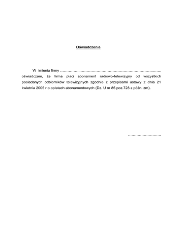 Oświadczenie W imieniu firmy ……………..…………………………………………………..……. oświadczam, że firma płaci abonament radiowo-telewizyjny od wszystkich posiadanych odbiorników telewizyjnych zgodnie z przepisami ustawy z dnia 21 kwietnia 2005 r o opłatach abonamentowych (Dz. U nr 85 poz.728 z późn. zm). ………………………