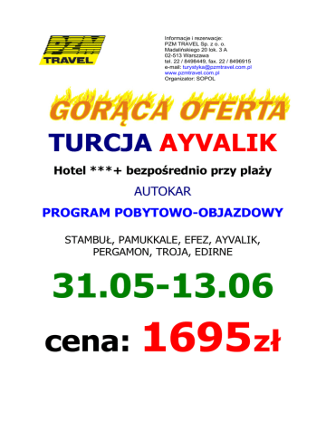Informacje i rezerwacje: PZM TRAVEL Sp. z o. o. Madalińskiego 20 lok. 3 A 02-513 Warszawa tel. 22 / 8498449, fax. 22 / 8496915 e-mail: [email protected] www.pzmtravel.com.pl Organizator: SOPOL TURCJA AYVALIK Hotel ***+ bezpośrednio przy plaży AUTOKAR PROGRAM POBYTOWO-OBJAZDOWY STAMBUŁ, PAMUKKALE, EFEZ, AYVALIK, PERGAMON, TROJA, EDIRNE 31.05-13.06 cena: 1695 zł PROGRAM IMPREZY: Dzień 1. Wyjazd z Polski w godzinach rannych wg .rozkładu jazdy. Przejazd przez Słowację, Węgry. Dzień 2. Dalszy przejazd tranzytowy przez Bułgarię, Turcję. Przyjazd do Istambułu w godz. wieczornych. Zakwaterowanie w hotelu, obiadokolacja, nocleg. Dzień 3. niadanie. Zwiedzanie Istambułu-bazylika Hagia Sophia, hipodrom, podziemna cysterna Yerebatan Saray, pałac Topkapi, Błękitny Meczet, Kryty Bazar, Bazar Egipski. Dla chętnych rejs po Bosforze (dodatkowo płatny). Obiadokolacja, nocleg. 4 dzień Śniadanie. Wyjazd do PAMUKKALE . Zwiedzanie HIERAPOLIS - antycznego uzdrowiska, odwiedzanego podobno przez Kleopatrę - ruiny miasta z bogato zdobionym teatrem oraz pozostałości jednej z największych starożytnych nekropoli w Azji Mniejszej, zakwaterowanie w hotelu. Obiadokolacja. Nocleg. Dzień 5-12. Wypoczynek w Ayvaliku z możliwością korzystania z wycieczek fakultatywnych. Dzień 12. Śniadanie. Wyjazd do Edirne, po drodze zwiedzanie legendarnej Troi. Przejazd do cieśniny Dardanele. Przeprawa promowa na stronę europejską. Przyjazd do Edirne. Zakwaterowanie w hotelu, obiadokolacja, nocleg. Dzien 13. Śniadanie. Zwiedzanie meczetu w Edirne, będącego jednym z najwspanialszych dzieł Sinana - nadwornego architekta Sulejmana Wspaniałego. Wyjazd do Polski. Przejazd tranzytowy przez Bułgarię i Serbię. Dzień 14. Dalszy przejazd tranzytowy przez Węgry, Słowację. Przyjazd do Polski w godzinach wieczornych. WYCIECZKI FAKULTATYWNE PERGAMON niegdyś stolica potężnego Królestwa Pergamonu, później rzymskiej prowincji, gdzie znajdował się monumentalny Ołtarz Zeusa, jeden z siedmiu cudów starożytnego świata (dziś znajduje się w Muzeum Pergamońskim w Berlinie); tu wynaleziono pergamin i stworzono jedną z największych bibliotek starożytnych, konkurującą z nawet z biblioteką aleksandryjską, zwiedzanie ruin antycznego miasta – Akropol, Asklepiejon – starożytne centrum medyczne. Czerwona Bazylika. WYSPA ALIBEY połączona groblą z lądem, z wieloma pozostałościami typowej greckiej architektury. Wzgórze SEYTAN – SOFRASI czyli „Wzgórze Szatana”, gdzie wg legendy jest odbita stopa szatana, stamtąd rozpościera się wspaniałą panorama na grecka wyspę Lesbos. WYCIECZKA MORSKA całodzienny rejs statkiem wycieczkowym wśród malowniczych zatoczek i licznych wysepek z możliwością kąpieli morskich z Lunchem na pokładzie. BAZAR orientalny bazar w Ayvaliku, na którym można zaopatrzyć się zarówno w modna odzież jak i aromatycznie pachnące miejscowe przyprawy. Cena od osoby zawiera: 2 noclegi w Istambule, 1 nocleg w Pamukkale, 7 noclegów w Ayvaliku, 1 nocleg w Edirne, 11 śniadań i obiadokolacji, transport autokarowy (autokar komfortowy z klimatyzacją, video, barkiem, wc), opiekę pilota i rezydenta, ubezpieczenie NW i KL. Cena nie zawiera: Wizy tureckiej - 15 EUR, biletów wstępu do zwiedzanych obiektów, napoi do obiadokolacji. Dopłaty za miejsce wyjazdu WARSZAWA (dopłata 90,00 zł) WROCŁAW (dopłata 80,00 zł) KATOWICE KRAKÓW POZNAŃ (dopłata 100,00 zł) LESZNO (dopłata 90,00 zł) ŁÓDŹ (dopłata 70,00 zł) RADOM (dopłata 80,00 zł) RZESZÓW (dopłata 70,00 zł) TARNÓW (dopłata 50,00 zł) LUBLIN (dopłata 100,00 zł) KIELCE (dopłata 60,00 zł) BIELSKO-BIAŁA PIOTRKÓW TRYBUNALSKI (dopłata 70,00 zł) CZĘSTOCHOWA (dopłata 60,00 zł) OPOLE (dopłata 70,00 zł) DĘBICA (dopłata 70,00 zł) Hotel BUYUK BERK***+ Lokalizacja- położony w Ayvaliku – Sarimsakli, obok lokalnego centrum z licznymi sklepami i dyskoteką. Ok. 140 km od Izmiru. Usługi hotelowe- 2 baseny, brodzik dla dzieci, zjeżdżalnie wodne, 2 restauracje, 2 bary przy basenach, sauna, siłownia, sklepiki, kantor wymiany walut w recepcji, tenis stołowy, bilard. Pokoje: 2,3,4 osobowe z pełnym węzłem sanitarnym, telewizja satelitarna, telefon, indywidualnie sterowana klimatyzacja. Wyżywienie- 2 razy dziennie; śniadania i obiadokolacje w formie bufetu ( możliwość dopłaty do ALL INCLUSIVE na miejscu w hotelu) Plaża- szeroka, piaszczysta 30m od hotelu. Parasole i leżaki na plaży i przy basenie bezpłatne.