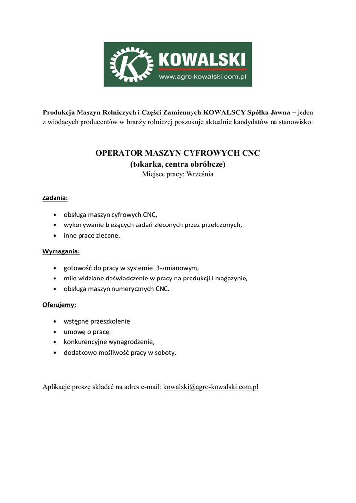 Produkcja Maszyn Rolniczych i Części Zamiennych KOWALSCY Spółka Jawna – jeden z wiodących producentów w branży rolniczej poszukuje aktualnie kandydatów na stanowisko: OPERATOR MASZYN CYFROWYCH CNC (tokarka, centra obróbcze) Miejsce pracy: Września Zadania:    obsługa maszyn cyfrowych CNC, wykonywanie bieżących zadań zleconych przez przełożonych, inne prace zlecone. Wymagania:    gotowość do pracy w systemie 3-zmianowym, mile widziane doświadczenie w pracy na produkcji i magazynie, obsługa maszyn numerycznych CNC. Oferujemy:     wstępne przeszkolenie umowę o pracę, konkurencyjne wynagrodzenie, dodatkowo możliwość pracy w soboty. Aplikacje proszę składać na adres e-mail: [email protected]