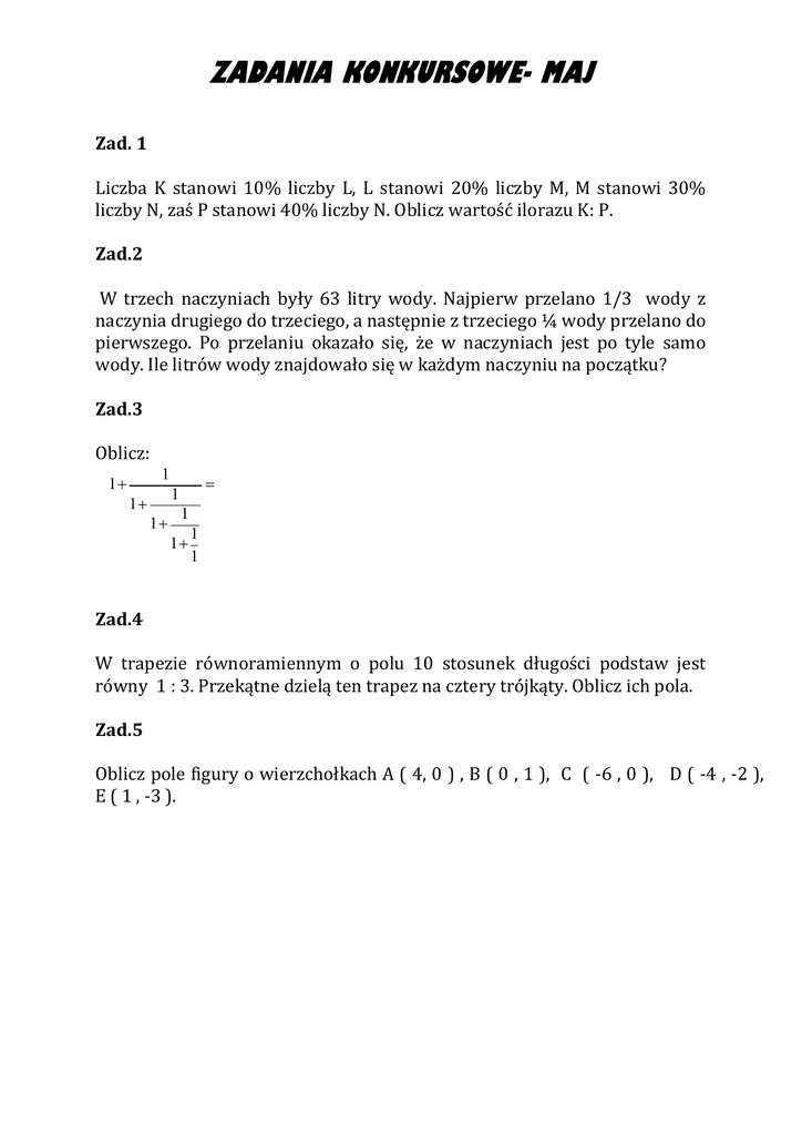 ZADANIA KONKURSOWE- MAJ Zad. 1 Liczba K stanowi 10% liczby L, L stanowi 20% liczby M, M stanowi 30% liczby N, zaś P stanowi 40% liczby N. Oblicz wartość ilorazu K: P. Zad.2 W trzech naczyniach były 63 litry wody. Najpierw przelano 1/3 wody z naczynia drugiego do trzeciego, a następnie z trzeciego ¼ wody przelano do pierwszego. Po przelaniu okazało się, że w naczyniach jest po tyle samo wody. Ile litrów wody znajdowało się w każdym naczyniu na początku? Zad.3 Oblicz: 1 1+ = 1 1+ 1+ 1 1+ 1 1 Zad.4 W trapezie równoramiennym o polu 10 stosunek długości podstaw jest równy 1 : 3. Przekątne dzielą ten trapez na cztery trójkąty. Oblicz ich pola. Zad.5 Oblicz pole figury o wierzchołkach A ( 4, 0 ) , B ( 0 , 1 ), C ( -6 , 0 ), D ( -4 , -2 ), E ( 1 , -3 ).