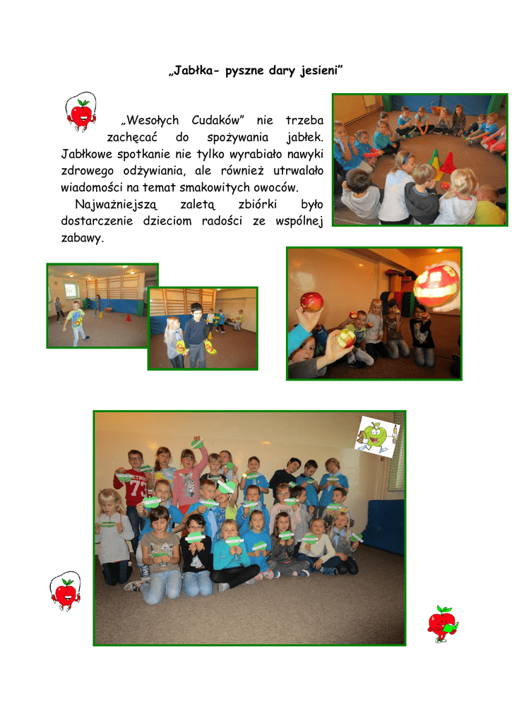 „Jabłka- pyszne dary jesieni” „Wesołych Cudaków” nie trzeba zachęcać do spożywania jabłek. Jabłkowe spotkanie nie tylko wyrabiało nawyki zdrowego odżywiania, ale również utrwalało wiadomości na temat smakowitych owoców. Najważniejszą zaletą zbiórki było dostarczenie dzieciom radości ze wspólnej zabawy.