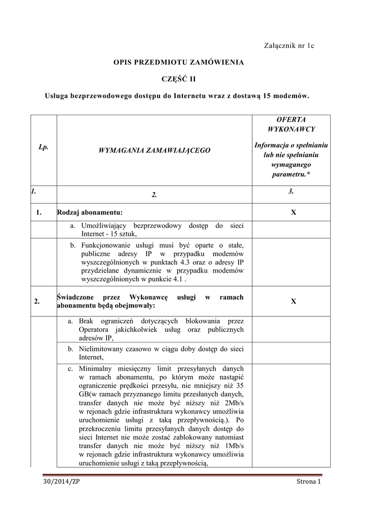Załącznik nr 1c OPIS PRZEDMIOTU ZAMÓWIENIA CZĘŚĆ II Usługa bezprzewodowego dostępu do Internetu wraz z dostawą 15 modemów. OFERTA WYKONAWCY Lp. 1. 1. Informacja o spełnianiu lub nie spełnianiu wymaganego parametru.* WYMAGANIA ZAMAWIAJĄCEGO 3. 2. Rodzaj abonamentu: X a. Umożliwiający bezprzewodowy dostęp Internet - 15 sztuk, do sieci b. Funkcjonowanie usługi musi być oparte o stałe, publiczne adresy IP w przypadku modemów wyszczególnionych w punktach 4.3 oraz o adresy IP przydzielane dynamicznie w przypadku modemów wyszczególnionych w punkcie 4.1 . 2. Świadczone przez Wykonawcę abonamentu będą obejmowały: usługi w ramach X a. Brak ograniczeń dotyczących blokowania przez Operatora jakichkolwiek usług oraz publicznych adresów IP, b. Nielimitowany czasowo w ciągu doby dostęp do sieci Internet, c. Minimalny miesięczny limit przesyłanych danych w ramach abonamentu, po którym może nastąpić ograniczenie prędkości przesyłu, nie mniejszy niż 35 GB(w ramach przyznanego limitu przesłanych danych, transfer danych nie może być niższy niż 2Mb/s w rejonach gdzie infrastruktura wykonawcy umożliwia uruchomienie usługi z taką przepływnością.). Po przekroczeniu limitu przesyłanych danych dostęp do sieci Internet nie może zostać zablokowany natomiast transfer danych nie może być niższy niż 1Mb/s w rejonach gdzie infrastruktura wykonawcy umożliwia uruchomienie usługi z taką przepływnością, 30/2014/ZP Strona 1 d. Dostęp: X i. Zamawiający wymaga, aby usługa była świadczona we wszystkich gminach, o których mowa w obwieszczeniu Prezesa Rady Ministrów z dnia 29 czerwca 2010 r. w sprawie wykazu gmin i powiatów wchodzących w skład województw (M.P. Nr 48, poz. 654). przy czym Zamawiający nie wymaga, aby usługa była dostępna na obszarze całej gminy, a jedynie, w co najmniej jednym punkcie w każdej gminie, ii. poza obszarem Polski - na zasadach nie gorszych niż oferowane dla innych klientów biznesowych. e. Usługa w chwili uruchomienia musi być zablokowana poza granicami Rzeczpospolitej Polskiej. Zamawiający musi mieć możliwość odblokowania funkcjonowania usługi poza granicami RP, f. Usługa obejmuje wyłącznie dostęp do Internetu. Zamawiający wymaga zablokowania połączeń telefonicznych, SMS, g. Możliwość uzyskania stałego, publicznego adresu IP. Koszt usługi nie wyższy niż w cenniku obowiązującym dla firm w sieci Wykonawcy na dzień podpisania umowy. Cennik zostanie dostarczony w dniu podpisania umowy. 3. Wykonawca zapewni w ramach zaoferowanego abonamentu: X a. nowe karty SIM oraz ich aktywację, b. utrzymanie kart SIM w stałej gotowości do świadczenia usług, c. urządzenia dostępowe zgodnie z specyfikacją poniżej, d. wymianę kart SIM w przypadku uszkodzenia, kradzieży, utraty lub zablokowania, e. opiekuna technicznego i handlowego w celu zapewnienia bieżącej obsługi. 4. Parametry techniczne urządzeń dostępowych: X 4.1 Parametry techniczne dla 7 urządzeń: X a. Urządzenie fabrycznie nowe, b. Min. 24 miesięczna gwarancja, liczona od momentu dostarczenia urządzenia do siedziby Zamawiającego, c. Urządzenie musi współpracować prawidłowo z następującymi systemami operacyjnymi min.: Windows XP, Windows Vista, Windows 7, Windows 8, 30/2014/ZP Strona 2 d. W zestawie z modemem muszą się znajdować aktualne sterowniki dla w/w systemów operacyjnych, e. Modem musi umożliwiać dostęp do sieci Internet przewodowo poprzez port USB komputera oraz działając jako bezprzewodowy punkt dostępu do sieci WLAN tzw. „Hotspot" - modem musi pełnić również rolę routera, f. Modem obsługuje następujące technologie przesyłania danych: 4.1.1 i. GPRS, ii. EDGE, iii. UMTS, iv. HSPA+, v. WLAN - min. standard IEEE 802.11 b/g, vi. LTE. g. Modem po zalogowaniu do sieci musi wybierać automatycznie technologię przesyłania danych umożliwiającą najszybszy transfer w miejscu użytkowania, h. Modem posiada wbudowany akumulator umożliwiający poprawną pracę przez min. 2 h. Modem musi mieć możliwość pracy w następujących trybach: a. Jako modem USB podłączony do komputera bez sieci WLAN, b. Jako mobilny „HOTSPOT" bez konieczności podłączania do komputera poprzez port USB - min. 3 użytkowników korzystających z dostępu do sieci Internet, c. jednoczesnej pracy (sieć WLAN oraz komputera podłączonego przez port USB) min. 3 użytkowników korzystających z dostępu do sieci Internet, d. Modem musi posiadać konfigurowalną usługę serwera DHCP od strony sieci WLAN, X e. Modem musi posiadać wbudowaną antenę, f. Modem musi posiadać możliwość podłączenia zewnętrznej anteny, g. Zasięg działania sieci WLAN: okrąg o promieniu min. 3m. (w ramach jednego pomieszczenia), h. Modem musi posiadać wbudowany wyświetlacz, który po uruchomieniu urządzenia wyświetla min. następujące informacje: 30/2014/ZP Strona 3 i. stan akumulatora, ii. informację o sile sygnału. i. Ładowanie akumulatora urządzenia poprzez min. port USB, j. Obudowa musi posiadać włącznik/wyłącznik urządzenia. 4.1.2 Wyposażenie zestawu: a. Modem, b. Sterowniki dla wymienionych w pkt. 4, ppkt. 4.1 lit. c systemów operacyjnych na płycie CD/DVD lub na nośniku zainstalowanym w modemie, Kabel do ładowania akumulatora modemu z komputera poprzez port USB, Kabel do podłączenia modemu i udostępniania dostępu do sieci Internet dla komputera PC poprzez port USB. c. d. X 4.2 UCHYLONY X 4.3 Parametry techniczne dla 8 urządzeń: X a. Urządzenie fabrycznie nowe, b. Min. 24 miesięczna gwarancja, liczona od momentu dostarczenia urządzenia do siedziby Zamawiającego, c. Urządzenie musi współpracować prawidłowo z następującymi systemami operacyjnymi min: Windows XP, Windows Vista, Windows 7, Windows 8 d. W zestawie z modemem muszą się znajdować aktualne sterowniki dla w/w systemów operacyjnych, e. Modem musi umożliwiać dostęp do sieci Internet przewodowo poprzez port USB komputera oraz działając