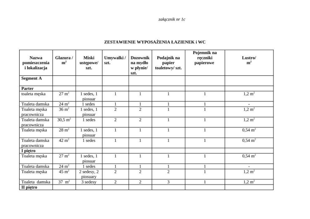 załącznik nr 1c ZESTAWIENIE WYPOSAŻENIA ŁAZIENEK i WC Nazwa pomieszczenia i lokalizacja Pojemnik na ręczniki papierowe Lustro/ m2 Glazura / m2 Miski ustępowe/ szt. Umywalki / szt. Dozownik na mydło w płynie/ szt. Podajnik na papier toaletowy/ szt. 27 m2 1 sedes, 1 piosuar 1 sedes 1 sedes, 1 piosuar 1 sedes 1 1 1 1 1,2 m2 1 2 1 2 1 1 1 1 1,2 m2 2 2 1 1 1,2 m2 1 sedes, 1 piosuar 1 sedes 1 1 1 1 0,54 m2 1 1 1 1 0,54 m2 1 sedes, 1 piosuar 1 sedes 2 sedesy, 2 piosuary 3 sedesy 1 1 1 1 0,54 m2 1 2 1 2 1 2 1 1 1,2 m2 2 2 3 1 1,2 m2 Segment A Parter toaleta męska Toaleta damska Toaleta męska pracownicza Toaleta damska pracownicza Toaleta męska 24 m2 36 m2 30,5 m2 28 m2 Toaleta damska pracownicza I piętro Toaleta męska 42 m2 Toaleta damska Toaleta męska 24 m2 45 m2 Toaleta damska II piętro 37 m2 27 m2 Toaleta męska 27 m2 Toaleta damska Toaleta męska 24 m2 45 m2 Toaleta damska III piętro Toaleta męska 37 m2 Toaleta damska Toaleta męska 24 m2 45 m2 Toaleta damska Segment B umywalnia 37 m2 Toaleta damska Toaleta męska 11,5 m2 11,5 m2 Segment C Toaleta damska Toaleta męska II piętro Toaleta damska Toaleta męska Łączna ilość: 1 sedes, 1 piosuar 1 sedes 2 sedesy, 2 piosuary 3 sedesy 1 1 1 1 0,54 m2 1 2 1 2 1 2 1 1 1,2 m2 2 2 3 1 1,2 m2 1 sedes, 1 piosuar 1 sedes 2 sedesy, 2 piosuary 3 sedesy 1 1 1 1 0,54 m2 1 2 1 2 1 2 1 1 1,2 m2 2 2 3 1 1,2 m2 1 prysznic, 1 sedes 1 sedes, 1 pisuar, 1 sedes 3 3 1 1 1,2 m2 1 1 1 1 1 1 1 1 0,54 m2 0,54 m2 36 m2 36 m2 2 sedesy 1 pisuar, 1 sedes 1 1 1 1 2 1 1 1 0,72 m2 0,72 m2 36 m2 36 m2 2 sedesy 1 sedes , 1 pisuar 1 1 1 1 2 1 1 1 0,72 m2 0,72 m2 776,5 m2 52 szt. 35 szt. 35 szt. 35 szt. 25 szt 27 m2 23 m2 18,66 m2