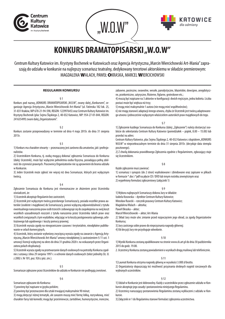 KONKURS DRAMATOPISARSKI „W.O.W” Centrum Kultury Katowice im. Krystyny Bochenek w Katowicach oraz Agencja Artystyczna „Marcin Wiercichowski Art-Mania” zapraszają do udziału w konkursie na najlepszy scenariusz teatralny, dedykowany tercetowi aktorskiemu w składzie premierowym: MAGDALENA WALACH, PAWEŁ OKRASKA, MARCEL WIERCICHOWSKI REGULAMIN KONKURSU §1 Konkurs pod nazwą „KONKURS DRAMATOPISARSKI „W.O.W”, zwany dalej „Konkursem”, organizuje Agencja Artystyczna „Marcin Wiercichowski Art-Mania” (ul. Fatimska 182 lok. 25, 31-831 Kraków, NIP 678-21-94-598, REGON: 122997645) oraz Centrum Kultury Katowice im. Krystyny Bochenek (plac Sejmu Śląskiego 2, 40-032 Katowice, NIP: 954-27-01-844, REGON: 241635499) zwani dalej „Organizatorami”. §2 Konkurs zostanie przeprowadzony w terminie od dnia 4 maja 2015r. do dnia 31 sierpnia 2015r. §3 1] Konkurs ma charakter otwarty – przeznaczony jest zarówno dla amatorów, jak i profesjonalistów. 2] Uczestnikiem Konkursu, tj. osobą mogącą dokonać zgłoszenia Scenariusza do Konkursu (dalej: Uczestnik), może być wyłącznie pełnoletnia osoba fizyczna, posiadająca pełną zdolność do czynności prawnych. Pracownicy Organizatorów nie są uprawnieni do brania udziału w Konkursie. 3] Jeden Uczestnik może zgłosić nie więcej niż dwa Scenariusze, których jest wyłącznym twórcą. §4 Zgłoszenie Scenariusza do Konkursu jest równoznaczne ze złożeniem przez Uczestnika oświadczeń, że: 1] Uczestnik akceptuje Regulamin bez zastrzeżeń; 2] Uczestnik jest wyłącznym twórcą przesłanego Scenariusza/y, posiada wszelkie prawa autorskie (osobiste i majątkowe) do Scenariusza/y, ponosi wyłączną odpowiedzialność z tytułu ewentualnego naruszenia praw osób trzecich i zobowiązuje się do zaspokojenia na swój koszt wszelkich uzasadnionych roszczeń z tytułu naruszenia przez Uczestnika takich praw oraz wszelkich związanych z tym wydatków, włączając w to koszty postępowania sądowego, arbitrażowego lub ugodowego i koszty pomocy prawnej; 3] Uczestnik wyraża zgodę na nieograniczone czasowo i terytorialnie, nieodpłatne publikowanie w celach komercyjnych, 4] Uczestnik, który zostanie wyłoniony zwycięzcą wyraża zgodę na zawarcie z Agencją Artystyczną „Marcin Wiercichowski Art-Mania” umowy nieodpłatnej (z zastrzeżeniem § 11 ust. 1 umowy) licencji wyłącznej na okres do dnia 31 grudnia 2020 r. na wskazanych przez Organizatora polach eksploatacji. 5] Uczestnik wyraża zgodę na przetwarzanie danych osobowych na potrzeby Konkursu zgodnie z ustawą z dnia 29 sierpnia 1997 r. o ochronie danych osobowych (tekst jednolity Dz. U. z 2002 r. Nr 101, poz. 926 z póz. zm.). zabawne, pocieszne, swawolne, wesołe, parodystyczne, błazeńskie, dowcipne, anegdotyczne, przekomiczne, satyryczne, filuterne, figlarne, groteskowe etc.; 4] muszą być rozpisane na 3 aktorów w konfiguracji: dwóch mężczyzn, jedna kobieta. Liczba postaci może być większa niż trzy; 5] mogą mieć maksymalnie 1 autora (nie mogą mieć współtwórców); 6] nie mogą stanowić adaptacji innego utworu, chyba że Uczestnik jest twórcą adaptowanego utworu i jednocześnie wyłącznym właścicielem autorskich praw majątkowych do tego. §7 1] Zgłoszenie każdego Scenariusza do Konkursu (dalej: „Zgłoszenie”) należy dostarczyć osobiście do sekretariatu Centrum Kultury Katowice (poniedziałek – piątek, 8.00 – 15.00) lub przesłać na adres: Centrum Kultury Katowice, plac Sejmu Śląskiego 2, 40-032 Katowice z dopiskiem „KONKURS W.O.W” w nieprzekraczalnym terminie do dnia 31 sierpnia 2015r. (decyduje data stempla pocztowego). 2] Z chwilą dokonania prawidłowego Zgłoszenia zgodnie z Regulaminem, zgłaszający staje się Uczestnikiem. §8 Każde zgłoszenie musi zawierać: 1] scenariusz i synopsis (do 2 stron) wydrukowane i zbindowane oraz zapisane w plikach w formacie *.doc i *pdf na płycie CD / DVD lub innym nośniku zewnętrznym oraz 2] wypełniony formularz zgłoszeniowy (załącznik 1) §9 1] Wyboru najlepszych Scenariuszy dokona Jury w składzie: Izabela Kosowska – dyrektor Centrum Kultury Katowice; Mirosław Rusecki – rzecznik prasowy Centrum Kultury Katowice; Magdalena Walach – aktorka; Paweł Okraska – aktor; Marcel Wiercichowski – aktor; Art-Mania 2] Skład Jury może ulec zmianie przed rozpoczęciem jego obrad, za zgodą Organizatorów Konkursu; 3] Jury zastrzega sobie prawo do nieprzyznania nagrody głównej; 4] Od decyzji Jury nie przysługuje odwołanie. § 10 1] Wyniki Konkursu zostaną opublikowane na stronie www.ck.art.pl do dnia 30 października 2015 do godz. 19.00. 2. Uczestnicy Konkursu zostaną powiadomieni o wynikach drogą mailową lub telefonicznie. §5 Scenariusze zgłoszone przez Uczestników do udziału w Konkursie nie podlegają zwrotowi. § 11 1] Laureat Konkursu otrzyma nagrodę główną w wysokości 3.000 zł brutto. 2] Organizatorzy dopuszczają też możliwość przyznania drobnych nagród rzeczowych dla wybranych uczestników. §6 Scenariusze zgłaszane do Konkursu: 1] powinny być napisane w języku polskim; 2] powinny być przeznaczone dla sztuki trwającej maksymalnie 90 minut; 3] mogą dotyczyć różnej tematyki, ale zarazem muszą mieć formę lekką, rozrywkową, mieć charakter farsy lub komedii; mogą być prześmiewcze, żartobliwe, humorystyczne, ironiczne, § 12 1] Udział w Konkursie jest dobrowolny. Każdy z uczestników przez zgłoszenie udziału w Konkursie akceptuje jego zasady i postanowienia niniejszego Regulaminu. 2] Uczestnicy naruszający postanowienia Regulaminu zostaną wykluczeni z udziału w Konkursie. 3] Załącznik nr 1 do Regulaminu stanowi formularz zgłoszenia uczestnictwa. ZAŁĄCZNIK NR 1 ZGŁOSZENIE KONKURS DRAMATOPISARSKI „W.O.W” TYTUŁ SCENARIUSZA: ...............................................................................................................................................................................................
