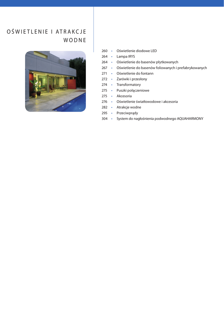 O Ś W I E T L E N I E I AT R A K C J E WODNE 260 264 264 267 271 272 274 275 275 276 282 295 304 • • • • • • • • • • • • • Oświetlenie diodowe led Lampa irys Oświetlenie do basenów płytkowanych Oświetlenie do basenów foliowanych i prefabrykowanych Oświetlenie do fontann Żarówki i przesłony Transformatory Puszki połączeniowe Akcesoria Oświetlenie światłowodowe i akcesoria Atrakcje wodne Przeciwprądy System do nagłośnienia podwodnego AQUAHARMONY oświetlenie i atrakcje wodne Oświetlenie DIODOWE LED Oświetlenie typu LED zapewnia kolorową, relaksującą poświatę na całej powierzchni basenu. System oświetlenia LED zapewnia maksymalne właściwości świetlne wykorzystując czerwone, zielone i niebieskie diody. Lampy LED dostępne są w wersji z niszą oraz w wersji płaskiej, nie wymagające niszy. Do istniejących basenów, lampy LED mogą być zamontowane poprzez wymianę wkładu lampy, który jest kompatybilny z niszą do lamp Standard300W AstralPool. Również istniejąca instalacja elektryczna i transformatory nie muszą być wymieniane. Żywotność lamp LED wynosi 10.000 godzin podczas gdy dla lamp standardowych jest to 1.000 godzin. Lampy diodowe występują również w wersji Mini do wanien Spa oraz małych basenów. Podobnie jak standardowe lampy LED pozwalają na wyświetlanie 12 kolorów w 9 różnych fabrycznie zaprogramowanych sekwencjach. Lampa MiniLED składa się z dwóch diod niebieskiej i zielonej o mocy 3W oraz jednej czerwonej o mocy 1W. Źródłem napięcia do lamp MiniLED jest zasilacz o kodzie 32640. Do zmiany kolorów oraz sekwencji służy przycisk o kodzie 32458 lub modulator 41988. Opcjonalnie każdy układ oświetlenia diodowego można wyposażyć w pilot zdalnego sterowania 27817. Lampy LumiPlus mogą pracować w 3 różnych systemach (każdy system wymaga instalacji transformatora): – ColourPlus ECO – wersja ekonomiczna sterowania przy użyciu włącznika NC. Każde przyciśnięcie powoduje zmianę zaprogramowanego koloru. ColourPlus ECO oferuje 7 kolorów i 7 sekwencji. – ColourPlus TOP – system zawiera modulator. Oferuje 12 kolorów i 8 sekwencji, a także możliwość zmiany prędkości sekwencji oraz ustawienia czasu wyłączenia. – ColourPlus DMX – system daje możliwość nieograniczonego sterowania światłem – ponad 16 milinów kolorów i nieskończona ilość sekwencji. Lampy diodowe LED LumiPlus PAR56 2.0 70 W - 12V AC - 50Hz - IPX8 Nowa linia lamp LED 2.0 jest ulepszoną wersją lamp LED seria 1.0. Lampy LumiPlus 2.0 charakteryzują się 3 razy większą efektywnością i mocą świecenia, niż poprzednia seria. LumiPlus 2.0 światło białe posiadają 4320 lumenów w porównaniu do poprzednich 1215 lumenów. Do instalacji lamp typu DMX wymagany jest modulator 41107. Nisze do lamp LumiPlus 2.0 należy zakupić osobno. Kod Waga kg LumiPlus PAR56 2.0 - oświetlenie zmienno-kolorowe (2544 lumenów) Żarówka LED PAR56 2.0 43411 7,50 / 6 szt. Żarówka LED PAR56 DMX 2.0 45637 7,50 / 6 szt. Lampy LumiPlusPAR56 2.0 bez niszy (2544 lumenów) Lampa do montażu w niszy NF z obręczą z białego ABS 43413 10,60 / 4 szt. Lampa do montażu w niszy NF z obręczą ze stali nierdzewnej 43414 12,20 / 4 szt. Lampa do montażu w niszy STANDARD z obręczą z białego ABS 45619 10,60 / 4 szt. Lampa do montażu w niszy STANDARD z obręczą ze stali nierdzewnej 45620 12,20 / 4 szt. Lampa DMX do montażu w niszy NF z obręczą z białego ABS 45638 10,60 / 4 szt. Lama DMX do montażu w niszy NF z obręczą ze stali nierdzewnej 45639 12,20 / 4 szt. Lampa DMX do montażu w niszy STANDARD z obręczą z białego ABS 45640 10,60 / 4 szt. Lama DMX do montażu w niszy STANDARD z obręczą ze stali nierdzewnej 45641 12,20 / 4 szt. LumiPlus PAR56 2.0 – światło białe (4320 lumenów) Żarówka LED PAR56 2.0 43412 7,50 / 6 szt. LumiPlusPAR56 bez niszy (4320 lumenów) Lampa do montażu w niszy NF z obręczą z białego ABS 43415 10,60 / 4 szt. Lampa do montażu w niszy NF z obręczą ze stali nierdzewnej 43416 12,20 / 4 szt. Lampa do montażu w niszy STANDARD z obręczą z białego ABS 45621 10,60 / 4 szt. Lampa do montażu w niszy STANDARD z obręczą ze stali nierdzewnej 45622 12,20 / 4 szt. Nisze Nisze typu NF Nisza NF do basenów płytkowanych 37175 5,60 / 6 szt. Nisza NF do basenów foliowanych z zaczepami 37176 6,25 / 6 szt. Nisza NF do basenów foliowanych bez zaczepów 37177 6,25 / 6 szt. Nisza NF do basenów panelowych z zaczepami 37178 8,88 / 4 szt. Nisza NF do basenów panelowych bez zaczepów 37179 8,88 / 4 szt. Nisze typu STANDARD Nisza STANDARD do basenów płytkowanych 00349 4,66 / 6 szt. Nisza STANDARD do basenów płytkowanych z zaczepami 00364 6,24 / 6 szt. Nisza STANDARD do basenów płytkowanych bez zaczepów 28887 6,40 / 6 szt. Nisza STANDARD do basenów panelowych z zaczepami 23671 8,88 / 4 szt. Nisza STANDARD do basenów panelowych bez zaczepów 23670 8,88 / 4 szt. 260 Objętość m3 0,015 0,015 0,069 0,069 0,069 0,069 0,069 0,069 0,069 0,069 0,015 0,069 0,069 0,069 0,069 0,069 0,069 0,069 0,069 0,069 0,069 0,069 0,069 0,069 0,069 oświetlenie i atrakcje wodne Oświetlenie DIODOWE LED Lampy diodowe LED LumiPlus FLAT 2.0 70 W - 12V AC - 50Hz - IPX8 Nowa linia lamp LED 2.0 jest ulepszoną wersją lamp LED seria 1.0. Lamy LumiPlus 2.0 charakteryzują się 3 razy większą efektywnością i mocą świecenia, niż poprzednia seria. LumiPlus 2.0 światło białe posiadają 4320 lumenów w porównaniu do poprzednich 1215 lumenów. Do instalacji lamp typu DMX wymagany jest modulator 41107. Kod LumiPlus FLAT 2.0 - oświetlenie zmienno-kolorowe (2544 lumenów) Lampa LED FLAT do basenów płytkowanych z obręczą z białego ABS Lampa LED FLAT do basenów płytkowanych z obręczą ze stali nierdzewnej Lampa LED FLAT do basenów foliowanych z obręczą z białego ABS Lampa LED FLAT do basenów foliowanych z obręczą ze stali nierdzewnej Lampa LED FLAT DMX do basenów płytkowanych z obręczą z białego ABS