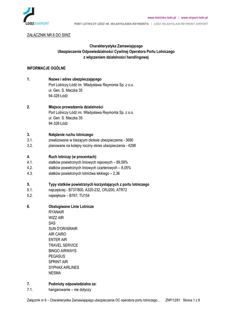 ZAŁĄCZNIK NR 6 DO SIWZ Charakterystyka Zamawiającego Ubezpieczenie Odpowiedzialności Cywilnej Operatora Portu Lotniczego z włączeniem działalności handlingowej INFORMACJE OGÓLNE 1. Nazwa i adres ubezpieczającego Port Lotniczy Łódź im. Władysława Reymonta Sp. z o.o. ul. Gen. S. Maczka 35 94-328 Łódź 2. Miejsce prowadzenia działalności Port Lotniczy Łódź im. Władysława Reymonta Sp. z o.o. ul. Gen. S. Maczka 35 94-328 Łódź 3. 3.1. 3.2. Natężenie ruchu lotniczego zrealizowane w bieżącym okresie ubezpieczenia - 3690 planowane na kolejny roczny okres ubezpieczenia - 4298 4. 4.1. 4.2. 4.3. Ruch lotniczy (w procentach) statków powietrznych liniowych rejsowych – 89,59% statków powietrznych liniowych czarterowych – 8,05% statków powietrznych lotnictwa lekkiego – 2,36 5. 5.1. 5.2. Typy statków powietrznych korzystających z portu lotniczego najczęściej - B737/800, A320-232, CRJ200, ATR72 największe – B767, TU154 6. Obsługiwane Linie Lotnicze RYANAIR WIZZ AIR SAS SUN D'OR/ISRAIR AIR CAIRO ENTER AIR TRAVEL SERVICE BINGO AIRWAYS PEGASUS SPRINT AIR SYPHAX AIRLINES NESMA 7. 7.1. Podmioty odpowiedzialne za: hangarowanie – nie dotyczy Załącznik nr 6 – Charakterystka Zamawiającego ubezpieczenie OC operatora portu lotniczego… ZNP/12/61 Strona 1 z 9 7.2. 7.3. 7.4. 7.5. 7.6. wieżę kontrolną – podmiot zewnętrzny - Państwowa Agencja Żeglugi Powietrznej obsługę płytową – Port Lotniczy Łódź tankowanie i przechowywanie paliwa - podmiot zewnętrzny Petrolot, Port Lotniczy Łódź planuje w 2. połowie 2013 r. uruchomić bazę paliw. catering – nie dotyczy (Port Lotniczy Łódź jedynie pośredniczy, tj. realizuje zlecenia przewoźników) obsługę towarów i poczty – Port Lotniczy Łódź 8. 8.1. 8.1.1. 8.1.2. 8.2. 8.2.1. 8.2.2. Szacunkowe wpływy za usługi świadczone przez port lotniczy w podziale na: wpływy za usługi świadczone przez port lotniczy zrealizowane w bieżącym okresie ubezpieczenia – 10,5 mln PLN planowane na kolejny roczny okres ubezpieczenia – 9,6 mln PLN wpływy od koncesjonowanych podmiotów świadczących usługi w porcie lotniczym zrealizowane w bieżącym okresie ubezpieczenia – 93 tys PLN planowane na kolejny roczny okres ubezpieczenia – 64 tys PLN 9. Czy ubezpieczający jest odpowiedzialny za konserwację i utrzymanie lotniska - TAK 10. 10.1. Dane dotyczące lotniska: położenie w terenie, wymiary Deklinacja magnetyczna: 4o E Lokalizacja: 51º43’18.77’N, 019º23’53.28’E Odległość, kierunek od miasta: 6 km Wzniesienie lotniska: 185 m 10.2. długość i kierunek pasów startowych i dróg kołowania Główna droga startowa: 07L-25R (066°-246°) -2500m x 45m Pas trawiasty: 07R-25L (066°-246°)- 700m x 175m Drogi kołowania: A, B, C- długość- brak danych 10.3. oznakowanie ICAO- EPLL IATA- LCJ 11. Czy ubezpieczający jest odpowiedzialny za obsługę pasażerów i/lub bagażu przylatujących i/lub odlatujących - TAK 12. Czy hangary są dostępne dla publicznego hangarowania? Jeśli tak, jaka jest szacunkowa wartość hangarowanych samolotów w ciągu roku - NIE 13. Czy ubezpieczający obsługuje, utrzymuje lub naprawia samoloty - NIE 14. Czy ubezpieczający prowadzi catering dla osób z zewnątrz? Jeśli tak, jakie są przybliżone roczne obroty z tytułu prowadzenia tej działalności – NIE Załącznik nr 6 – Charakterystka Zamawiającego ubezpieczenie OC operatora portu lotniczego… ZNP/12/61 Strona 2 z 9 BEZPIECZEŃSTWO 15. Czy teren portu lotniczego jest ogrodzony? Jeśli tak, w jaki sposób TAK- siatka ogrodzeniowa z drutu ocynkowanego o wysokości 2,4m, uwieńczona na całej długości (na górze i na dole), zwojami koncentriny wykonane z drutu ostrzowego. 16. Ile jest wejść na teren portu lotniczego i jakie środki bezpieczeństwa obowiązują w tym zakresie 9 bram ewakuacyjnych, 1 brama główna wjazdowa na teren portu, wszystkie bramy zabezpieczone są mechanicznie (kłódka lub łańcuch z kłódką) zaplombowane. Do tego dochodzą punkty kontroli bezpieczeństwa pasażerów i osób niebędących pasażerami, łącznie 8 punktów. Każda osoba udająca się do strefy krytycznej poddawana jest kontroli bezpieczeństwa przez pracowników SOL. 17. Czy lotnisko jest dostępne dla osób z zewnątrz i czy mogą one poruszać się swobodnie po terenie lotniska Tylko po uprzednim uzyskaniu zezwolenia, otrzymaniu przepustki i pod nadzorem osoby upoważnionej. 18. Jakiego rodzaju kontroli bezpieczeństwa na terenie terminalu poddawani są wylatujący pasażerowie Kontrola bezpieczeństwa obejmuje sprawdzenie bagażu podręcznego, rejestrowanego przy pomocy urządzeń RTG oraz kontroli manualnej, jaką jest zespół czynności kontroli bezpieczeństwa wykonywanych ręcznie bez ingerencji w wewnętrzne powłoki ciała oraz w sposób powodujący w jak najmniejszym stopniu naruszenie intymności, w celu wykrycia w odzieży lub na ciele oraz w przedmiotach osobistych kontrolowanej osoby zabronionych przedmiotów, urządzeń lub za zgodą kontrolowanej osoby kontrola ta może być przeprowadzana przez pracownika służby ochrony lotniska odmiennej płci niż kontrolowana osoba, lub w szczególnych przypadkach za zgodą kontrolowanej osoby kontrola manualna może także obejmować dokonanie oglądu powierzchni jej ciała przez pracownika służby ochrony lotniska tej samej płci, w warunkach gwarantujących zachowanie intymności. Za zgodą kontrolowanej osoby czynność ta może być dokonana przez pracownika służby ochrony lotniska odmiennej płci niż kontrolowana osoba. 19. Jakiego rodzaju sprzęt jest używany do obsługi bagażu pasażerów i towarów? Hi-Scan 10080 EDtS – 2 szt. Hi-Scan 130130T2is – 2 szt. Hi-Scan 100100V2is – 5 szt. Hi-Scan 6040 aX – 8 szt. AutoClear 6040 – 2 szt. IONSCAN 500DT – 2 szt. Responder BLS – 5 szt. RESPONDER RCI – 3 szt. Ręczne monitory promieniowania (HDS-101GN +RDS-80) – 3 szt. Jeszcze jest Rapiscan na cargo i Hi-Scan 100100 na termi