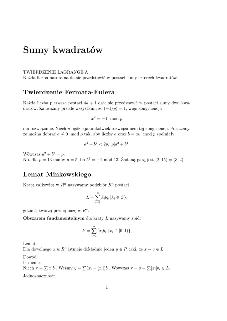 parzystej potędze, to n daje się przedstawić w postaci sumy dwu kwadratów.