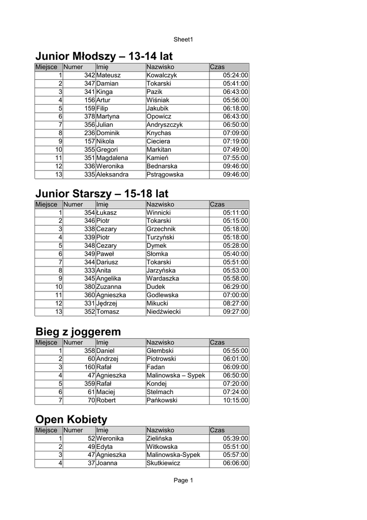 Sheet1 Junior Młodszy – 13-14 lat Miejsce Numer Imię 1 342 Mateusz 2 347 Damian 3 341 Kinga 4 156 Artur 5 159 Filip 6 378 Martyna 7 356 Julian 8 236 Dominik 9 157 Nikola 10 355 Gregori 11 351 Magdalena 12 336 Weronika 13 335 Aleksandra Nazwisko Kowalczyk Tokarski Pazik Wiśniak Jakubik Opowicz Andryszczyk Knychas Cieciera Markitan Kamień Bednarska Pstrągowska Czas 05:24:00 05:41:00 06:43:00 05:56:00 06:18:00 06:43:00 06:50:00 07:09:00 07:19:00 07:49:00 07:55:00 09:46:00 09:46:00 Junior Starszy – 15-18 lat Miejsce Numer Imię 1 354 Łukasz 2 346 Piotr 3 338 Cezary 4 339 Piotr 5 348 Cezary 6 349 Paweł 7 344 Dariusz 8 333 Anita 9 345 Angelika 10 380 Zuzanna 11 360 Agnieszka 12 331 Jędrzej 13 352 Tomasz Nazwisko Winnicki Tokarski Grzechnik Turzyński Dymek Słomka Tokarski Jarzyńska Wardaszka Dudek Godlewska Mikucki Niedźwiecki Czas 05:11:00 05:15:00 05:18:00 05:18:00 05:28:00 05:40:00 05:51:00 05:53:00 05:58:00 06:29:00 07:00:00 08:27:00 09:27:00 Bieg z joggerem Miejsce Numer Imię 1 358 Daniel 2 60 Andrzej 3 160 Rafał 4 47 Agnieszka 5 359 Rafał 6 61 Maciej 7 70 Robert Nazwisko Czas Głembski 05:55:00 Piotrowski 06:01:00 Fadan 06:09:00 Malinowska – Sypek 06:50:00 Kondej 07:20:00 Stelmach 07:24:00 Pańkowski 10:15:00 Open Kobiety Miejsce Numer 1 2 3 4 Imię 52 Weronika 49 Edyta 47 Agnieszka 37 Joanna Nazwisko Zielińska Witkowska Malinowska-Sypek Skutkiewicz Page 1 Czas 05:39:00 05:51:00 05:57:00 06:06:00 Sheet1 5 6 7 8 9 10 11 12 13 14 15 16 17 18 19 20 21 22 23 24 25 26 27 28 29 30 31 32 33 232 Dorota 40 Magdalena 67 Olga 244 Sylwia 55 Anna 251 Katarzyna 365 Izabela 57 Ewa 46 Monika 240 Alicja 54 Maria 76 Adriana 381 Beata 69 Ula 73 Elżbieta 261 Karina 260 Katarzyna 50 Daria 39 Agata 6 242 Joanna 257 Anna 243 Anna 364 Agata 7 Maria 267 Monika 234 Dorota 357 Izabela 43 Karolina Kamień Skarzyńska Pechcin Liśkiewicz Pawłowska-Pojawa Kossakowska Rynkiewicz Witek-Piotrowska Stańska Defratyka Wacławska Smokowska Sadowska Molduano-Klein Mzyk Kunkiewicz Bagilc Pustówka Rogóyska Dziwisińska Grabek Jakubik Kościkiewicz Dawi Kilian Knychas Andryszczyk Rubin 06:09:00 06:09:00 06:10:00 06:18:00 06:32:00 06:41:00 06:45:00 07:04:00 07:09:00 07:10:00 07:13:00 07:16:00 07:18:00 07:19:00 07:43:00 07:44:00 07:45:00 07:46:00 07:55:00 08:02:00 08:04:00 08:07:00 08:23:00 09:10:00 10:01:00 10:03:00 10:36:00 11:07:00 11:15:00 Nazwisko Żebrowski Jendrych Świątkowski Wojtkowski Leśniak Łasiński Winnicki Krysik Łabuz Krzywania Turski Zwierzchoń Szymborski Piotrowski Łukasik Kącki Suchocki Rachwał Czas 04:28:00 04:35:00 04:47:00 04:54:00 04:58:00 05:00:00 05:03:00 05:09:00 05:14:00 05:14:00 05:34:00 05:35:00 05:36:00 05:39:00 05:44:00 05:47:00 05:55:00 05:56:00 Open Mężczyźni Miejsce Numer Imię 1 41 Krzysztof 2 250 Marek 3 64 Bartosz 4 66 Jan 5 350 Kamil 6 254 Michał 7 353 Kamil 8 256 Marcin 9 231 Przemek 10 249 Bartłomiej 11 56 Artur 12 58 Grzegorz 13 68 Rafał 14 60 Andrzej 15 262 Marcin 16 382 Paweł 17 74 Michał 18 53 Michał Page 2 Sheet1 19 20 21 22 23 24 25 26 27 28 29 30 31 32 33 34 35 36 37 38 38 39 40 41 42 43 44 45 46 47 48 49 50 51 52 53 54 55 56 51 Tomasz 376 Damian 78 Michał 36 Patryk 253 Paweł 71 Marcin 384 Przemysław 38 Wojciech 375 Mateusz 233 Dariusz 14 77 Tomasz 10 Łukasz 13 Marcin 263 Piotr 44 Tomasz 65 Mariusz 248 Paweł 265 Robert 38 Wojciech 259 Jakub 62 Tomasz 12 Radosław 252 Michał 266 Daniel 183 Philippe 42 Łukasz 239 Rafał 247 Paweł 63 Szymon 237 Dameon 171 Andrzej 255 Jan 258 Radek 361 Bartłomiej 379 Eryk 237 Dameon 264 Krystian 246 Artur Pustówka Stobiecki Sztubecki Żmija Łasiński Świerczewski Nowicki Wydmuch Turzyński Knychas Smokowski Trałka Żewłakow Lewandowski Siedlecki Zwoliński Bernaciak Józwik Wydmuch Aksamit Pojawa Majdan Czarnecki Kilian Robert Szymański Garbat Gulina Szymański Allen Żerdzicki Dubaniewicz Grabek Wyszkowski Buczyński Allen Kościjański Łebek 05:57:00 05:58:00 06:04:00 06:04:00 06:05:00 06:06:00 06:09:00 06:15:00 06:15:00 06:18:00 06:18:00 06:19:00 06:19:00 06:21:00 06:21:00 06:21:00 06:27:00 06:29:00 06:39:00 06:15:00 06:40:00 06:41:00 06:41:00 06:44:00 06:50:00 06:52:00 06:54:00 06:56:00 07:02:00 07:07:00 07:08:00 07:09:00 07:31:00 07:42:00 07:51:00 08:21:00 08:26:00 09:49:00 10:01:00 Masters Kobiety Miejsce Numer Imię 1 332 Marzena 2 368 Anna 3 164 Małgorzata 4 385 Katarzyna 5 79 Katarzyna 6 168 Beata 7 185 Irina 8 238 Dianne Nazwisko Opowicz Bielinska Niedziółka Sokołowska Mirecka Jarząbek Hulanicka Francis Page 3 Czas 06:10:00 06:20:00 06:50:00 07:53:00 08:01:00 08:14:00 09:19:00 10:13:00 Sheet1 Masters Mężczyźni Miejsce Numer Imię 1 184 Tomasz 2 173 Wojciech 3 158 Andrzej 4 367 Piotr 5 166 Ryszard 6 45 Jacek 7 170 Paweł 8 163 Sławomir 9 160 Janusz 10 180 Zbigniew 11 182 Mariusz 12 362 Andrzej 13 172 Ludwik 14 366 Tomasz 15 174 16 169 Andrzej 17 80 Paweł 18 165 Jacek 19 321 Krzysztof 20 167 Wojciech 21 337 Andrzej 22 383 Paweł 23 181 Andrzej 24 162 Jan 25 186 Andrzej 26 75 Piotr 27 171 Adrzej 28 363 Marek 29 161 30 340 Leszek 31 343 Henryk Nazwisko Lipiec Starzyński Andryszczyk Bieliński Łukaszewicz Nowocień Kunachowicz Stański Tomasik Zawadzak Januła Wojakowski Kozłowski Bujnowski Brzozowski Roerych Niedziółka Przybysz Jarząbek Wardaszka Poncyliusz Grendziński Szweda Hulanicki Narożnik Żerdzicki Kościkiewicz Pinkosz Bartkowiak Page 4 Czas 04:59:00 05:04:00 05:16:00 05:20:00 05:23:00 05:32:00 05:40:00 05:47:00 05:49:00 05:49:00 05:50:00 05:51:00 06:04:00 06:07:00 06:09:00 06:19:00 06:20:00 06:24:00 06:25:00 06:32:00 06:35:00 06:44:00 06:55:00 06:58:00 07:02:00 07:17:00 07:20:00 07:30:00 08:29:00 08:33:00 10:40:00