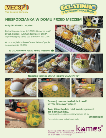 NIESPODZIANKA W DOMU PRZED MECZEM Lody GELATINHO... w piłce! Do każdego zestawu GELATINHO można kupić 60 szt. (karton) kulistych termosów SFERA w promocyjnej cenie 120 zł netto + VAT 23%. W promocji dodatkowo "mundialowy" papier do pakowania GRATIS. Tu GELATINHO w naszej nowej lodziarni Napełnij termos SFERA lodami GELATINHO*) Zamknij termos dokładnie i zawiń w "mundialowy" papier. Twój klient będzie miał świetny prezent dla domowników. /sugerowana cena za napełniony termos - 25 zł/ Smacznego! *)oczywiście mogą to być każde lody Dystrybucja MEC3 w Polsce od 1991 Kames Sp. z o.o. 03-160 Warszawa, ul. Fletniowa 47 tel. 22 676 52 53, www.kames.pl