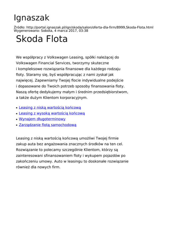 Ignaszak Źródło: http://portal.ignaszak.pl/ign/skoda/salon/oferta-dla-firm/8999,Skoda-Flota.html Wygenerowano: Sobota, 4 marca 2017, 03:38 Skoda Flota We współpracy z Volkswagen Leasing, spółki należącej do Volkswagen Financial Services, tworzymy skuteczne i kompleksowe rozwiązania finansowe dla każdego rodzaju floty. Staramy się, byś współpracując z nami zyskał jak najwięcej. Zapewniamy Twojej flocie indywidualne podejście i dopasowane do Twoich potrzeb sposoby finansowania floty. Naszą ofertę dedykujemy małym i średnim przedsiębiorstwom, a także dużym Klientom korporacyjnym. ● Leasing z niską wartością końcową ● Leasing z wysoką wartością końcową ● Wynajem długoterminowy ● Zarządzanie flotą samochodową Leasing z niską wartością końcową umożliwi Twojej firmie zakup auta bez angażowania znacznych środków na ten cel. Rozwiązanie to polecamy szczególnie Klientom, którzy są zainteresowani sfinansowaniem floty i wykupem pojazdów po zakończeniu umowy. Auto w leasingu to doskonałe rozwiązanie również dla nowych firm. Samochody ŠKODA leasing - korzyści: ● zwiększasz płynność finansową firmy, nie rezygnując z pozostałych inwestycji, ● nie angażujesz znacznych środków na zakup samochodu na firmę, ● oszczędzasz czas dzięki prostym procedurom i minimalnym formalnościom, ● wysokość rat leasingowych dopasowujesz do możliwości finansowych firmy, ● raty leasingu wliczasz do kosztów uzyskania przychodu, ● korzystasz z atrakcyjnych pakietów ubezpieczeń komunikacyjnych. Leasing z niską wartością końcową - kalkulator leasingowy Zobacz przykład finansowania samochodu Miesięczna rata Leasing operacyjny (netto) 1 867,79 PLN okres leasingu opłata wstępna wartość wykupu całkowity koszt leasingu Zapytaj doradcę o ofertę dla Ciebie 3 lata 10% 1,00% 107,99% *Oferta dla przedsiębiorców, przygotowana przez Volkswagen Leasing GmbH Sp. z o.o. Oddział w Polsce. Szczegółowe warunki określone są w umowie. Niniejsza informacja nie stanowi oferty w rozumieniu kodeksu cywylnego. Pod nazwą Volkswagen Financial Services oferowane są usługi bankowe (przez Volkswagen Bank Polska S.A.), usługi leasingowe i mobilność (przez Volkswagen Leasing GmbH Sp. z o.o. Oddział w Polsce) oraz usługi ubezpieczeniowe (przez Volkswagen Bank Polska S.A. oraz Volkswagen Serwis Ubezpieczeniowy Sp. z o.o. działające jako agenci ubezpieczeniowi). Ubezpieczenie ŠKODA Flota oferuje przygotowane we współpracy z Volkswagen Leasing Polska ubezpieczenie, które zapewni firmowej flocie samochodów uprzywilejowane warunki cenowe oraz proceduralne, związane z likwidacją szkód komunikacyjnych. ŠKODA Ubezpieczenia to kompleksowa oferta dedykowana samochodom tej marki, dzięki której zyskasz: Bogaty pakiet ubezpieczeń komunikacyjnych: ● ubezpieczenie odpowiedzialności cywilnej, ● pełną ochronę ubezpieczeniową autocasco z ryzykiem kradzieży, ● ubezpieczenie następstw nieszczęśliwych wypadków, ● assistance na terenie całej Europy, ● honorowanie najwyższych zniżek z OC lub AC z poprzedniego towarzystwa ubezpieczeniowego, ● szeroki wybór opcji dodatkowych. Preferencyjne stawki*: ● promocyjną stawkę ubezpieczeniową niezależną od wartości pojazdu w pierwszym roku (zobacz przykładowe kalkulacje stawki), ● promocyjną stawkę ubezpieczeniową już od 3,49% wartości samochodu w drugim roku i 3,99% w trzecim roku. *Promocyjne stawki mają zastosowanie pod warunkiem braku szkód w ciągu ostatnich 12 miesięcy (II i III rok). Gwarancję stawki: ● ubezpieczając samochód fabrycznie nowy oraz w drugim roku użytkowania, otrzymujesz promocyjny pakiet ubezpieczeń i, co najważniejsze, gwarancję stawki na kolejny rok, ● w przypadku ubezpieczenia samochodu na trzeci rok otrzymasz preferencyjny pakiet ubezpieczeń, ● możliwość kontynuacji ubezpieczenia aż do 10. roku eksploatacji samochodu. Serwisowanie na najwyższym poziomie: ● profesjonalne przeglądy tylko u Autoryzowanych Partnerów Serwisowych ŠKODA, ● wykonanie ewentualnych napraw z wykorzystaniem wyłącznie nowych i oryginalnych części zamiennych. Bezpieczeństwo i wygodę likwidacji szkody: ● zwrot pełnej wartości pojazdu z dnia zawarcia umowy ubezpieczenia w przypadku kradzieży lub szkody całkowitej do 3. roku eksploatacji, ● brak udziałów własnych oraz dopłat po szkodach, ● pełna ochrona autocasco z ryzykiem kradzieży, ● assistance, holowanie, samochód zastępczy (aż do 30 dni), ● zgłoszenie i bezgotówkową likwidację szkody u Dealera ŠKODA. Rozszerzoną ochronę: Zapewniamy szeroki wybór dodatkowych opcji ubezpieczenia: utraty zniżki, szyb, ochrony prawnej, bagażu oraz ubezpieczenie od szkód wynikających z nierówności na drodze. Zniżki przy zawieraniu umowy ubezpieczenia na kolejny rok: ● dla samochodów regularnie serwisowanych w ASO, ● dla samochodów wyposażonych w systemy bezpiecznej jazdy.