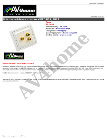 Informacje o produkcie Utworzono 04-03-2017 Gniazdo naścienne - zestaw VIDEO RCA, 2RCA Cena : 39,36 zł Gniazdo naścienne - zestaw VIDEO RCA, 2RCA om e Nr katalogowy : IM Z116 Producent : Kontakt Simon Dostępność : Dostępny Stan magazynowy : bardzo wysoki Średnia ocena : brak recenzji 4h Seria BASIC moduł to innowacyjna linia osprzętu elektroinstalacyjnego, która umożliwia rozbudowę instalacji teletechnicznej o dodatkowe rozwiązania. Poza łącznikami i gniazdami elektrycznymi seria BASIC moduł pozwala na wyposażenie gniazda naściennego w moduły multimedialne HDMI, VGA, RCA i inne. Dzięki temu panele tej serii znajdą zastosowanie w wymagających instalacjach domowego systemu audio-video oraz w biurach i zapewnią funkcjonalność i wyjątkowy wygląd. IM Z116 Gniazdo naścienne - zestaw VIDEO RCA, 2RCA Kontakt Simon AV Sklep oferuje pełny asortyment produktów marki Kontakt Simon. Zapraszamy do zapoznania się z katalogiem produktów Kontakt Simon i skontaktowania się z nami w celu ustalenia zamówienia. Wygenerowano w programie www.oscGold.com