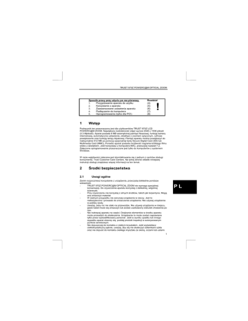 TRUST 970Z POWERC@M OPTICAL ZOOM Sposób pracy przy użyciu po raz pierwszy Przygotowanie aparatu do użytku Korzystanie z aparatu Zaawansowane ustawienia aparatu Podłączanie do komputera Oprogramowanie (tylko dla PC!) 1. 2. 3. 4. 5. 1 Rozdział (4) (5) (6) (7) (8) ! Wstęp Podręcznik ten przeznaczony jest dla użytkowników TRUST 970Z LCD POWERC@M ZOOM. Największa rozdzielczość zdjęć wynosi 2048 x 1536 pikseli (3.3 Mpikseli). Aparat posiada 8 MB wewnętrznej pamięci fleszowej, funkcję kamery internetowej, automatyczne ustawienie, obiektyw z zoomem optycznym, cyfrowe powiększenie oraz funkcję lampy błyskowej. Pamięć aparatu można powiększyć do maksymalnie 512 MB za pomocą opcjonalnej karty Secure Digital Card (SD) lub Multimedia Card (MMC). Ponadto aparat posiada możliwość nagrania krótkiego filmu wideo z dźwiękiem. Jeśli korzystasz z komputera MAC, przeczytaj rozdział 7.2. Załączone oprogramowanie przeznaczone jest tylko do komputerów z systemem Windows. W razie wątpliwości zalecane jest skontaktowanie się z jednym z centrów obsługi konsumenta, Trust Customer Care Centers. Na tylnej stronie okładki niniejszej instrukcji obsługi znajdziesz więcej informacji na ten temat. 2 2.1 Środki bezpieczeństwa Uwagi ogólne Zanim rozpoczniesz korzystanie z urządzenia, przeczytaj dokładnie poniższe wskazówki. TRUST 970Z POWERC@M OPTICAL ZOOM nie wymaga specjalnej konserwacji. Do czyszczenia aparatu korzystaj z delikatnej, wilgotnej ściereczki. Przy czyszczeniu nie korzystaj z silnych środków, takich jak terpentyna. Mogą one zniszczyć materiał. W żadnym przypadku nie zanurzaj urządzenia w cieczy. Jest to niebezpieczne i prowadzi do zniszczenia urządzenia. Nie używaj urządzenia w pobliżu wody. Uważaj, żeby nic nie stało na przewodzie. Nie używaj urządzenia w miejscu, gdzie kabel może się zniszczyć lub zostać uszkodzony wskutek chodzenia po nim. Nie rozkręcaj aparatu na części. Dotykanie elementów w środku aparatu może prowadzić do skaleczenia. Urządzenie to może zostać naprawiane tylko przez wykwalifikowany personel. Jeśli w wyniku upadku lub innego wypadku aparat otworzy się, poddaj produkt inspekcji w autoryzowanym punkcie serwisowym. Nie dopuszczaj do kontaktu z ciekłym kryształem. Jeśli wyświetlacz ciekłokrystaliczny pęknie, uważaj, aby się nie skaleczyć odłamkami szkła oraz nie dopuść do kontaktu ciekłego kryształu ze skórą, oczami lub ustami. 1 PL TRUST 970Z POWERC@M OPTICAL ZOOM Nie patrz na słońce przez wizjer. Oglądanie słońca lub innego mocnego źródła światła przez wizjer może doprowadzić do stałego uszkodzenia wzroku. Nie używaj aparatu w pobliżu gazu palnego. Korzystanie z aparatury elektronicznej w pobliżu gazu palnego może doprowadzić do wybuchu lub pożaru. Zachowaj ostrożność korzystając z lampy błyskowej Nie korzystaj z lampy błyskowej w pobliżu oczu fotografowanej osoby. Może to spowodować chwilowe zakłócenie wzroku. Szczególną ostrożność należy zachować podczas fotografowania niemowląt – lampa błyskowa powinna być oddalona przynajmniej 1 metr od oczu niemowlęcia. - 2.2 Baterie Zachowaj środki ostrożności podczas korzystania z baterii. Korzystaj tylko z baterii alkalicznych AA. Baterie mogą ciec lub wybuchnąć, jeśli nie są używane w prawidłowy sposób. Baterie alkaliczne dostarczone wraz z aparatem nie nadają się do ponownego naładowania. Nie próbuj ich ładować, ponieważ może prowadzić to do wybuchu. Usuń baterie (oraz kartę pamięci) z aparatu, jeśli nie używasz aparatu przez dłuższy czas. Zanim wymienisz baterie upewnij się, że aparat jest wyłączony. Nie wkładaj baterii w niewłaściwy sposób. Nie próbuj otwierać baterii. Nie przechowuj baterii w pobliżu ognia lub źródła gorąca. Nie zanurzaj baterii w wodzie. Nigdy nie wrzucaj baterii do ognia. Baterie mogą wybuchnąć. Przechowuj baterie poza zasięgiem małych dzieci. Natychmiast przerwij używanie baterii, jeśli zauważysz jakieś zmiany, takie jak przebarwienie, deformację lub wyciek. Kiedy baterie alkaliczne są wyczerpane, dowiedz się, gdzie w Twojej okolicy znajduje się punkt, gdzie można je oddawać. - Uwaga: Baterie alkaliczne lub NiMH typu AA nadają się do wykorzystania w tym urządzeniu. Uwaga: Nie wykorzystuj starych baterii wraz z nowymi, ponieważ stare baterie mogą wyczerpać nowe. Uwaga: Usuń baterie z aparatu, jeśli nie korzystasz z niego przez dłuższy czas. Oszczędzisz w ten sposób baterie. 3 3.1 Opis aparatu Przednia strona aparatu Korzystaj z tabeli 1 w połączeniu z rysunkiem 1. Elem Opis Funkcja ent 2 1 Przycisk spustu migawki 2 Wbudowana lampa błyskowa Naciśnij ten przycisk, aby zrobić zdjęcie lub wybrać opcje menu. Przeznaczona do robienia zdjęć przy niewystarczającej ilości światła. Lampa błyskowa posiada maksymalny zasięg TRUST 970Z POWERC@M OPTICAL ZOOM Elem ent Opis Funkcja 3 Kontrolka samowyzwalacza 4 Czujnik światła 5 Wizjer optyczny 6 Obiektyw 7 Mikrofon działania wynoszący 3 metry. Jeśli tryb ustawiony jest na Pre-set, a opcja samowyzwalacza jest użyta przed naciśnięciem przycisku spustu migawki, kontrolka będzie pulsować przez 10 sekund, zanim aparat zrobi zdjęcie. Aparat cyfrowy automatycznie odczytuje poziom światła i decyduje, czy lampa błyskowa powinna być użyta. Za pomocą tego czujnika mierzone jest naświetlenie. Pamiętaj, aby nie zasłaniać tego czujnika podczas robienia zdjęć. Wizjer optyczny pomaga w kadrowaniu zdjęć. Jednak zdjęcie robione jest obiektywem, a nie wizjerem. Obiektyw gromadzi światło do cyfrowego zapisu zdjęcia. Aby uzyskać lepsze wyniki, obiektyw nie powinien być zakurzony, nie powinien zawierać odcisków placów oraz nie powinien być porysowany. Przy nagrywaniu 1 minutowych filmów zapisuje dźwięk. Tabela 1: Funkcje przedniej części aparatu 3.2 Tylna strona aparatu Korzystaj z tabeli 2 w połączeniu z rysunkiem 2. Elem Opis Funkcja ent 1 2 