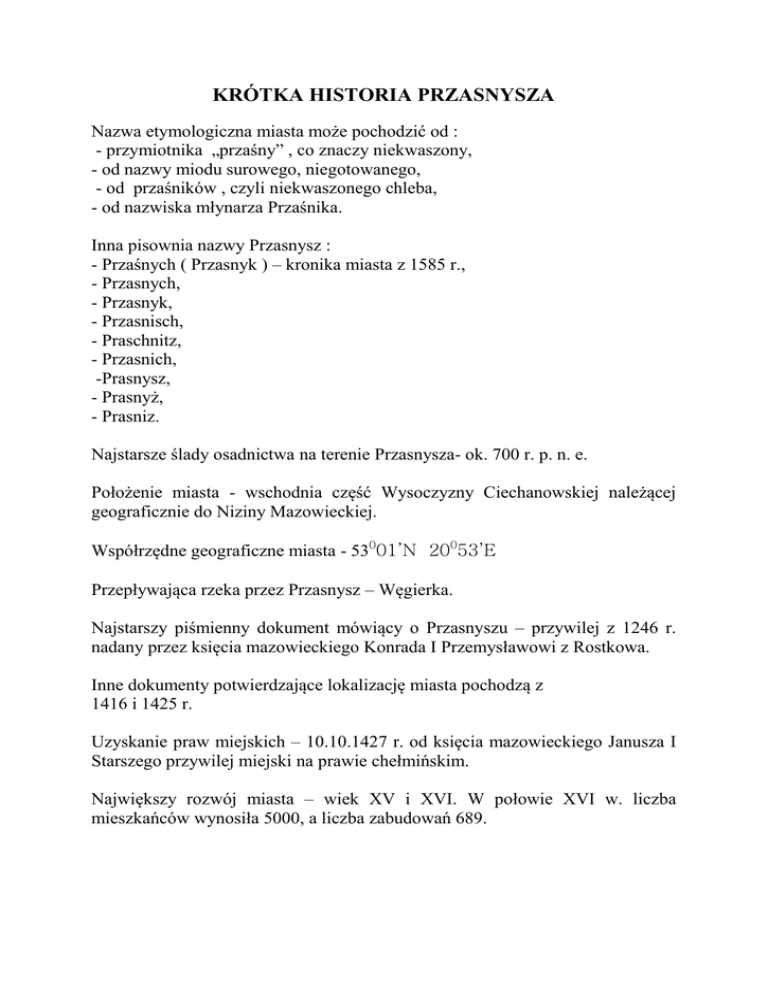 KRÓTKA HISTORIA PRZASNYSZA Nazwa etymologiczna miasta może pochodzić od : - przymiotnika „przaśny” , co znaczy niekwaszony, - od nazwy miodu surowego, niegotowanego, - od przaśników , czyli niekwaszonego chleba, - od nazwiska młynarza Przaśnika. Inna pisownia nazwy Przasnysz : - Przaśnych ( Przasnyk ) – kronika miasta z 1585 r., - Przasnych, - Przasnyk, - Przasnisch, - Praschnitz, - Przasnich, -Prasnysz, - Prasnyż, - Prasniz. Najstarsze ślady osadnictwa na terenie Przasnysza- ok. 700 r. p. n. e. Położenie miasta - wschodnia część Wysoczyzny Ciechanowskiej należącej geograficznie do Niziny Mazowieckiej. Współrzędne geograficzne miasta - 53001’N 20053’E Przepływająca rzeka przez Przasnysz – Węgierka. Najstarszy piśmienny dokument mówiący o Przasnyszu – przywilej z 1246 r. nadany przez księcia mazowieckiego Konrada I Przemysławowi z Rostkowa. Inne dokumenty potwierdzające lokalizację miasta pochodzą z 1416 i 1425 r. Uzyskanie praw miejskich – 10.10.1427 r. od księcia mazowieckiego Janusza I Starszego przywilej miejski na prawie chełmińskim. Największy rozwój miasta – wiek XV i XVI. W połowie XVI w. liczba mieszkańców wynosiła 5000, a liczba zabudowań 689. Administracyjnie Przasnysz przynależał do: Mazowsza, w drugiej połowie XV w. wszedł w skład ziemi ciechanowskiej, w 1526 r. został włączony do Korony i wszedł w skład województwa mazowieckiego, od 1576 był siedzibą starostwa niegrodowego przasnyskiego, w 1648 r. jako nagrodę starostwo przasnyskie otrzymał książę Jeremi Wiśniowiecki, w 1793 na sejmie grodzieńskim dokonano zmian administracyjnych i Przasnysz wszedł w skład ziemi różańskiej, po 1795 r. został przyłączony do Nowych Prus Wschodnich ( zabór pruski), od 1807 do 1815 Przasnysz wchodził w skład departamentu płockiego Księstwa Warszawskiego ; 30 stycznia 1807 r. w Przasnyszu nocował Napoleon I Bonaparte, od 1815 r. miasto weszło w skład Królestwa Polskiego (zabór rosyjski), na mocy ustawy z 19 (31) .12.1866 r. Przasnysz wszedł w skład guberni płockiej, w okresie międzywojennym 1918-1939 Przasnysz przynależał administracyjnie do województwa warszawskiego, po klęsce wrześniowej 1939 r. do 1945 został włączony do Rzeszy jako część Prus Południowo-Wschodnich, od 1945 do 1975 Przasnysz wchodziła w skład województwa warszawskiego, w wyniku kolejnej reformy administracyjnej z 1975 r. Przasnysz wszedł jako gmina w skład województwa ostrołęckiego, ostatnia reforma obowiązująca od 1.01. 1999 r. przyłączyła Przasnysz do województwa mazowieckiego. Upadek znaczenia Przasnysza przypada na wiek XVII i następne. Przyczyniły się do tego: epidemie – 1604 r., 1652 r., 1667 r., pożary - 1613 r., 1615 r., 1716 r., 1875 r., najazd Szwedów – 26.01.1657 r. ( 11 dni wojska szwedzkie stacjonowały w Przasnyszu). Ponowny rozwój miasta zaczyna się dopiero w 2 połowie XVIII w. O rozwoju miasta świadczy zarówno wzrost ilości mieszkańców jak i budowanie różnego rodzaju obiektów: w 1797 r. liczba mieszkańców Przasnysza wynosiła 1398 osób, zmienił się także skład narodowościowy- zaczęła się osiedlać ludność żydowska i Prusacy, w 1807 r. miasto liczyło 2059 mieszkańców, w 1827 r. liczba mieszkańców zwiększyła się do 3580 osób, w 1872 r. przasnyszan jest już 6250. W tym okresie czasu w mieście były: szpital, katolicka prywatna szkoła elementarna, szkoła elementarna ewangelicka, szkoła żydowska, szkoła rzemieślnicza, sąd gminny, sąd pokoju, zarząd powiatowy, urząd miejski, stacja poczty i telegrafów, dwa browary, dwie mydlarnie, fabryka cykorii, cztery olejarnie, cztery fabryki octu, fabryka miodu i świec, klasztor męski i żeński, kościół parafialny, w 1878 r. założono trzyklasową szkołę męską i czteroklasową szkołę żeńską, według spisu z 1890 r. w Przasnyszu mieszkało wówczas 4480 Żydów i 4049 Polaków, szybki przyrost mieszkańców utrzymywał się nadal i w 1910 r. wynosił już 10431 osób, z czego najliczniejszą grupę stanowili Żydzi (5224), na drugim miejscu byli Polacy ( 5108), natomiast pozostałe grupy narodowościowe były nieliczne, okres międzywojenny to czas rozwoju miasta – odbudowano rynek, ratusz, kościoły, pobudowano elektrownię, budynek szkoły rolniczej i gimnazjum, szkołę powszechną, teatr miejski, stadion i dom sportowy, a liczba przasnyszan w 1938 wynosiła 8 000 mieszkańców, w tym ok. 3 000 Żydów, od 1945 do 1975 r. następuje dalszy rozwój miasta, reforma z 1975 r. zahamowała ten rozwój. Sławne bitwy : 1863 r. – w okolicach miasta stoczono kilka potyczek z oddziałami wojska rosyjskiego, 14 .11.1863 r. w Przasnyszu dokonano publicznej egzekucji powstańca Stefana Cieleckiego „Orlika” – na miejscu egzekucji stoi teraz pomnik poświęcony jego pamięci, w czasie I wojny światowej 1914 -1915 pod Przasnyszem toczyły się ciężkie walki pomiędzy wojskami rosyjskimi i niemieckimi : luty 1915 r. – najciekawsza bitwa I wojny światowej, lipiec 1915 r. – Niemcy zajęli Przasnysz, w wyniku działań wojennych zniszczeniu uległo 70% zabudowy Przasnysza, sierpień 1920 r. okupacja miasta przez wojska sowieckie,-w okresie okupacji 1939-1945 r. na terenie powiatu i Przasnysza działały organizacje konspiracyjne i oddziały partyzanckie ( AK, NSZ). W dniu 17. 06.1942 r. Niemcy rozstrzelali za miastem 20 zakładników ( grzebowisko końskie), a 17.12.1942 r. na rynku dokonali publicznej egzekucji przez powieszenie 5 członków sztabu Obwodu ZWZ-AK,- 17.01.1945.r wojska okupanta opuściły Przasnysz, a w dniu następnym ( 18 stycznia) wkroczyły wojska radzieckie. Herb miasta : popiersie biskupa św. Wojciecha, od XVI w. – mur forteczny z trzema basztami białymi na tle czerwonym z bramą u dołu i z napisem w otoku „ Sigilum Civitatis Psasnensis”, w okresie Księstwa Warszawskiego usunięto herb z pieczęci i zastąpiono go godłem Królestwa Warszawskiego, p