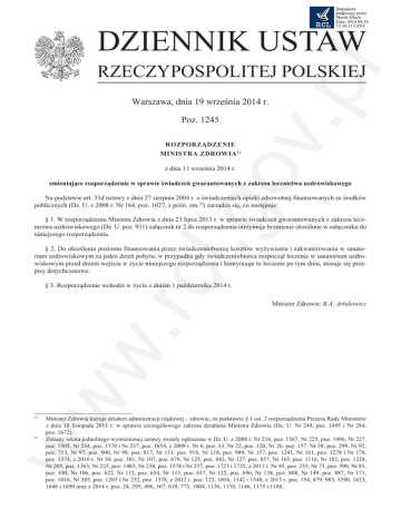 Dokument podpisany przez Marek Głuch Data: 2014.09.19 15:16:11 CEST DZIENNIK USTAW v.p l RZECZYPOSPOLITEJ POLSKIEJ Warszawa, dnia 19 września 2014 r. Poz. 1245 ROZPORZĄDZENIE MINISTRA ZDROWIA 1) .go z dnia 11 września 2014 r. zmieniające rozporządzenie w sprawie świadczeń gwarantowanych z zakresu lecznictwa uzdrowiskowego Na podstawie art. 31d ustawy z dnia 27 sierpnia 2004 r. o świadczeniach opieki zdrowotnej finansowanych ze środków publicznych (Dz. U. z 2008 r. Nr 164, poz. 1027, z późn. zm.2)) zarządza się, co następuje: § 1. W rozporządzeniu Ministra Zdrowia z dnia 23 lipca 2013 r. w sprawie świadczeń gwarantowanych z zakresu lecznictwa uzdrowiskowego (Dz. U. poz. 931) załącznik nr 2 do rozporządzenia otrzymuje brzmienie określone w załączniku do niniejszego rozporządzenia. w. rcl § 2. Do określenia poziomu finansowania przez świadczeniobiorcę kosztów wyżywienia i zakwaterowania w sanatorium uzdrowiskowym za jeden dzień pobytu, w przypadku gdy świadczeniobiorca rozpoczął leczenie w sanatorium uzdrowiskowym przed dniem wejścia w życie niniejszego rozporządzenia i kontynuuje to leczenie po tym dniu, stosuje się przepisy dotychczasowe. ww § 3. Rozporządzenie wchodzi w życie z dniem 1 października 2014 r. 1) 2) Minister Zdrowia: B.A. Arłukowicz Minister Zdrowia kieruje działem administracji rządowej – zdrowie, na podstawie § 1 ust. 2 rozporządzenia Prezesa Rady Ministrów z dnia 18 listopada 2011 r. w sprawie szczegółowego zakresu działania Ministra Zdrowia (Dz. U. Nr 248, poz. 1495 i Nr 284, poz. 1672). Zmiany tekstu jednolitego wymienionej ustawy zostały ogłoszone w Dz. U. z 2008 r. Nr 216, poz. 1367, Nr 225, poz. 1486, Nr 227, poz. 1505, Nr 234, poz. 1570 i Nr 237, poz. 1654, z 2009 r. Nr 6, poz. 33, Nr 22, poz. 120, Nr 26, poz. 157, Nr 38, poz. 299, Nr 92, poz. 753, Nr 97, poz. 800, Nr 98, poz. 817, Nr 111, poz. 918, Nr 118, poz. 989, Nr 157, poz. 1241, Nr 161, poz. 1278 i Nr 178, poz. 1374, z 2010 r. Nr 50, poz. 301, Nr 107, poz. 679, Nr 125, poz. 842, Nr 127, poz. 857, Nr 165, poz. 1116, Nr 182, poz. 1228, Nr 205, poz. 1363, Nr 225, poz. 1465, Nr 238, poz. 1578 i Nr 257, poz. 1723 i 1725, z 2011 r. Nr 45, poz. 235, Nr 73, poz. 390, Nr 81, poz. 440, Nr 106, poz. 622, Nr 112, poz. 654, Nr 113, poz. 657, Nr 122, poz. 696, Nr 138, poz. 808, Nr 149, poz. 887, Nr 171, poz. 1016, Nr 205, poz. 1203 i Nr 232, poz. 1378, z 2012 r. poz. 123, 1016, 1342 i 1548, z 2013 r. poz. 154, 879, 983, 1290, 1623, 1646 i 1650 oraz z 2014 r. poz. 24, 295, 496, 567, 619, 773, 1004, 1136, 1138, 1146, 1175 i 1188. I II III IV V VI 1 2 3 4 5 6 Lp. w. rcl 10,5 9,4 pokój wieloosobowy bez pełnego węzła higieniczno-sanitarnego 11,0 A pokój wieloosobowy z pełnym węzłem higieniczno-sanitarnym B pokój wieloosobowy w studiu 12,5 14,6 17,3 –2– 10,5 12,0 13,1 17,3 22,0 24,1 29,3 33,0 36,1 v.p l .go pokój dwuosobowy bez pełnego węzła higieniczno-sanitarnego B pokój dwuosobowy w studiu A pokój dwuosobowy z pełnym węzłem higieniczno-sanitarnym 22,0 23,0 28,8 II sezon rozliczeniowy (w złotych) od dnia 1 maja do dnia 30 września Dziennik Ustaw pokój jednoosobowy bez pełnego węzła higieniczno-sanitarnego B pokój jednoosobowy w studiu A pokój jednoosobowy z pełnym węzłem higieniczno-sanitarnym Poziom I sezon rozliczeniowy (w złotych) od dnia 1 października do dnia 30 kwietnia Poziom finansowaniaPRZEZ przez ŚWIADCZENIOBIORCĘ świadczeniobiorcę kosztów wyżywienia i zakwaterowania w sanatorium uzdrowiskowym za jeden dzień POZIOM FINANSOWANIA KOSZTÓW WYŻYWIENIA I ZAKWATEROWANIA W SANATORIUM UZDROWISKOWYM ZA JEDEN DZIEŃ POBYTU pobytu ww Załącznik do rozporządzenia Ministra Zdrowia Załącznik do rozporządzenia Ministra Zdrowia z dnia 11z dnia września 2014 (poz. …) 11 września 2014r. r. (poz. 1245) Poz. 1245