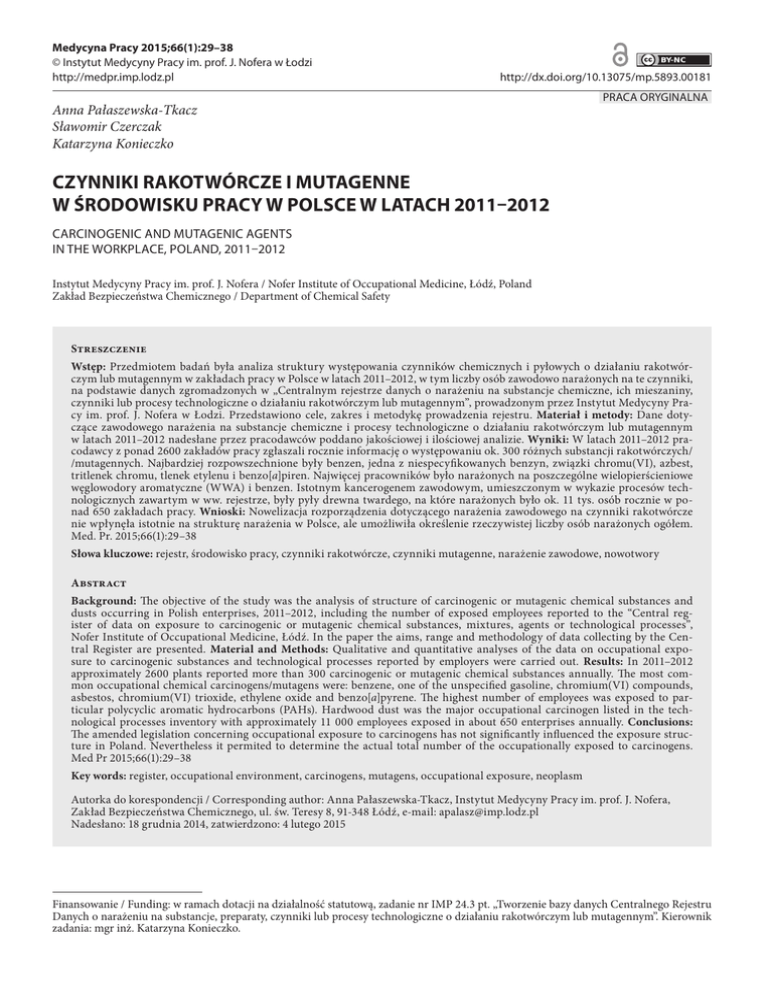 Medycyna Pracy 2015;66(1):29–38 © Instytut Medycyny Pracy im. prof. J. Nofera w Łodzi http://medpr.imp.lodz.pl http://dx.doi.org/10.13075/mp.5893.00181 Anna Pałaszewska-Tkacz Sławomir Czerczak Katarzyna Konieczko PRACA ORYGINALNA CZYNNIKI RAKOTWÓRCZE I MUTAGENNE W ŚRODOWISKU PRACY W POLSCE W LATACH 2011–2012 CARCINOGENIC AND MUTAGENIC AGENTS IN THE WORKPLACE, POLAND, 2011–2012 Instytut Medycyny Pracy im. prof. J. Nofera / Nofer Institute of Occupational Medicine, Łódź, Poland Zakład Bezpieczeństwa Chemicznego / Department of Chemical Safety Streszczenie Wstęp: Przedmiotem badań była analiza struktury występowania czynników chemicznych i pyłowych o działaniu rakotwórczym lub mutagennym w zakładach pracy w Polsce w latach 2011–2012, w tym liczby osób zawodowo narażonych na te czynniki, na podstawie danych zgromadzonych w „Centralnym rejestrze danych o narażeniu na substancje chemiczne, ich mieszaniny, czynniki lub procesy technologiczne o działaniu rakotwórczym lub mutagennym”, prowadzonym przez Instytut Medycyny Pracy im. prof. J. Nofera w Łodzi. Przedstawiono cele, zakres i metodykę prowadzenia rejestru. Materiał i metody: Dane dotyczące zawodowego narażenia na substancje chemiczne i procesy technologiczne o działaniu rakotwórczym lub mutagennym w latach 2011–2012 nadesłane przez pracodawców poddano jakościowej i ilościowej analizie. Wyniki: W latach 2011–2012 pracodawcy z ponad 2600 zakładów pracy zgłaszali rocznie informację o występowaniu ok. 300 różnych substancji rakotwórczych/ /mutagennych. Najbardziej rozpowszechnione były benzen, jedna z niespecyfikowanych benzyn, związki chromu(VI), azbest, tritlenek chromu, tlenek etylenu i benzo[a]piren. Najwięcej pracowników było narażonych na poszczególne wielopierścieniowe węglowodory aromatyczne (WWA) i benzen. Istotnym kancerogenem zawodowym, umieszczonym w wykazie procesów technologicznych zawartym w ww. rejestrze, były pyły drewna twardego, na które narażonych było ok. 11 tys. osób rocznie w ponad 650 zakładach pracy. Wnioski: Nowelizacja rozporządzenia dotyczącego narażenia zawodowego na czynniki rakotwórcze nie wpłynęła istotnie na strukturę narażenia w Polsce, ale umożliwiła określenie rzeczywistej liczby osób narażonych ogółem. Med. Pr. 2015;66(1):29–38 Słowa kluczowe: rejestr, środowisko pracy, czynniki rakotwórcze, czynniki mutagenne, narażenie zawodowe, nowotwory Abstract Background: The objective of the study was the analysis of structure of carcinogenic or mutagenic chemical substances and dusts occurring in Polish enterprises, 2011–2012, including the number of exposed employees reported to the “Central register of data on exposure to carcinogenic or mutagenic chemical substances, mixtures, agents or technological processes”, Nofer Institute of Occupational Medicine, Łódź. In the paper the aims, range and methodology of data collecting by the Central Register are presented. Material and Methods: Qualitative and quantitative analyses of the data on occupational exposure to carcinogenic substances and technological processes reported by employers were carried out. Results: In 2011–2012 approximately 2600 plants reported more than 300 carcinogenic or mutagenic chemical substances annually. The most common occupational chemical carcinogens/mutagens were: benzene, one of the unspecified gasoline, chromium(VI) compounds, asbestos, chromium(VI) trioxide, ethylene oxide and benzo[a]pyrene. The highest number of employees was exposed to particular polycyclic aromatic hydrocarbons (PAHs). Hardwood dust was the major occupational carcinogen listed in the technological processes inventory with approximately 11 000 employees exposed in about 650 enterprises annually. Conclusions: The amended legislation concerning occupational exposure to carcinogens has not significantly influenced the exposure structure in Poland. Nevertheless it permited to determine the actual total number of the occupationally exposed to carcinogens. Med Pr 2015;66(1):29–38 Key words: register, occupational environment, carcinogens, mutagens, occupational exposure, neoplasm Autorka do korespondencji / Corresponding author: Anna Pałaszewska-Tkacz, Instytut Medycyny Pracy im. prof. J. Nofera, Zakład Bezpieczeństwa Chemicznego, ul. św. Teresy 8, 91-348 Łódź, e-mail: [email protected] Nadesłano: 18 grudnia 2014, zatwierdzono: 4 lutego 2015 Finansowanie / Funding: w ramach dotacji na działalność statutową, zadanie nr IMP 24.3 pt. „Tworzenie bazy danych Centralnego Rejestru Danych o narażeniu na substancje, preparaty, czynniki lub procesy technologiczne o działaniu rakotwórczym lub mutagennym”. Kierownik zadania: mgr inż. Katarzyna Konieczko. 30 A. Pałaszewska-Tkacz i wsp. WSTĘP Zachorowalność na nowotwory złośliwe w Polsce systematycznie wzrasta. Zgodnie z danymi z Krajowego Rejestru Nowotworów, prowadzonego w Centrum Onkologii – Instytucie w Warszawie, w latach 1980–2010 liczba zachorowań na nowotwory złośliwe ogółem wzrosła z 64 820 w 1980 r. do 140 564 w 2010 [1]. W etiologii chorób nowotworowych jednym z najczęściej rozpatrywanych czynników jest narażenie na różnego rodzaju kancerogeny obecne w środowisku życia i pracy człowieka, m.in. na substancje chemiczne. W latach 2009–2013 r. w Rejestrze Chorób Zawodowych Instytutu Medycyny Pracy im. prof. J. Nofera w Łodzi (IMP) rejestrowanych było w kolejnych latach odpowiednio 87, 100, 96, 61 i 80 przypadków zachorowań na nowotwory złośliwe w wyniku narażenia zawodowego, a 10 lat wcześniej średnia zapadalność przekraczała 100 nowych zachorowań rocznie w skali kraju [2–6]. Badacze wskazują jednak na niedoszacowanie liczby przypadków, które wynika m.in. z długiego okresu latencji nowotworu oraz trudności z jednoznacznym rozdzieleniem zawodowych i środowiskowych czynników przyczynowych. Z tego powodu precyzyjne rozpoznanie rodzaju czynników rakotw