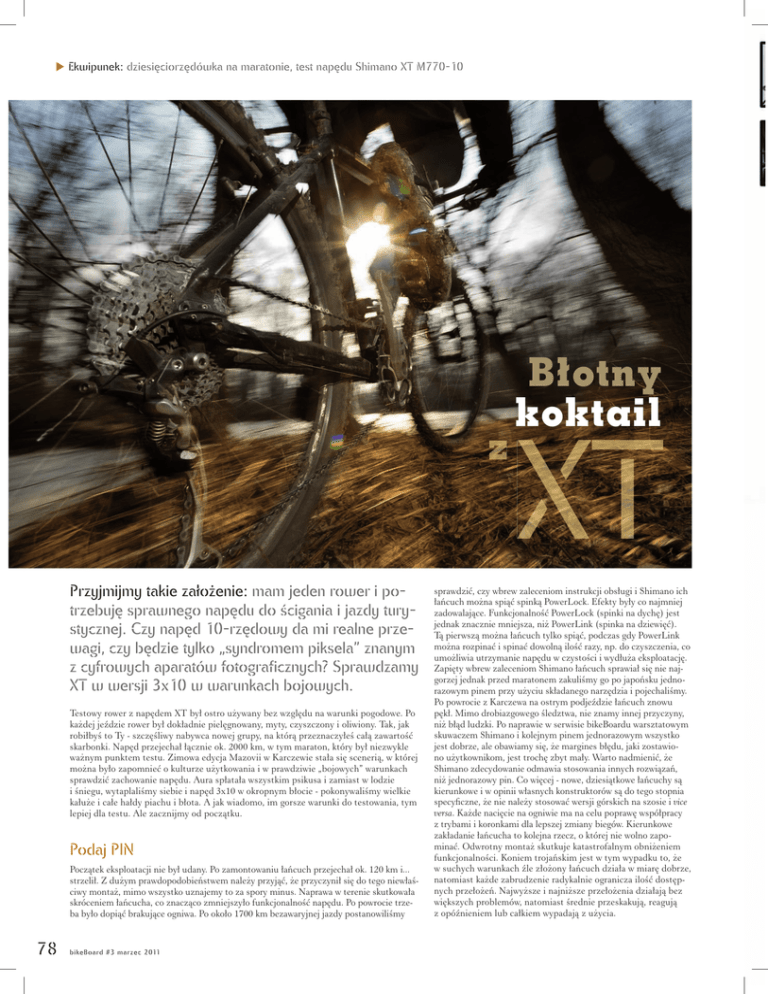 Ekwipunek: dziesięciorzędówka na maratonie, test napędu Shimano XT M770-10 Błotny koktail Przyjmijmy takie założenie: mam jeden rower i potrzebuję sprawnego napędu do ścigania i jazdy turystycznej. Czy napęd 10-rzędowy da mi realne przewagi, czy będzie tylko „syndromem piksela” znanym z cyfrowych aparatów fotograficznych? Sprawdzamy XT w wersji 3x10 w warunkach bojowych. Testowy rower z napędem XT był ostro używany bez względu na warunki pogodowe. Po każdej jeździe rower był dokładnie pielęgnowany, myty, czyszczony i oliwiony. Tak, jak robiłbyś to Ty - szczęśliwy nabywca nowej grupy, na którą przeznaczyłeś całą zawartość skarbonki. Napęd przejechał łącznie ok. 2000 km, w tym maraton, który był niezwykle ważnym punktem testu. Zimowa edycja Mazovii w Karczewie stała się scenerią, w której można było zapomnieć o kulturze użytkowania i w prawdziwie „bojowych” warunkach sprawdzić zachowanie napędu. Aura spłatała wszystkim psikusa i zamiast w lodzie i śniegu, wytaplaliśmy siebie i napęd 3x10 w okropnym błocie - pokonywaliśmy wielkie kałuże i całe hałdy piachu i błota. A jak wiadomo, im gorsze warunki do testowania, tym lepiej dla testu. Ale zacznijmy od początku. Podaj PIN Początek eksploatacji nie był udany. Po zamontowaniu łańcuch przejechał ok. 120 km i... strzelił. Z dużym prawdopodobieństwem należy przyjąć, że przyczynił się do tego niewłaściwy montaż, mimo wszystko uznajemy to za spory minus. Naprawa w terenie skutkowała skróceniem łańcucha, co znacząco zmniejszyło funkcjonalność napędu. Po powrocie trzeba było dopiąć brakujące ogniwa. Po około 1700 km bezawaryjnej jazdy postanowiliśmy 78 bi keB oar d #3 m ar zec 2011 sprawdzić, czy wbrew zaleceniom instrukcji obsługi i Shimano ich łańcuch można spiąć spinką PowerLock. Efekty były co najmniej zadowalające. Funkcjonalność PowerLock (spinki na dychę) jest jednak znacznie mniejsza, niż PowerLink (spinka na dziewięć). Tą pierwszą można łańcuch tylko spiąć, podczas gdy PowerLink można rozpinać i spinać dowolną ilość razy, np. do czyszczenia, co umożliwia utrzymanie napędu w czystości i wydłuża eksploatację. Zapięty wbrew zaleceniom Shimano łańcuch sprawiał się nie najgorzej jednak przed maratonem zakuliśmy go po japońsku jednorazowym pinem przy użyciu składanego narzędzia i pojechaliśmy. Po powrocie z Karczewa na ostrym podjeździe łańcuch znowu pękł. Mimo drobiazgowego śledztwa, nie znamy innej przyczyny, niż błąd ludzki. Po naprawie w serwisie bikeBoardu warsztatowym skuwaczem Shimano i kolejnym pinem jednorazowym wszystko jest dobrze, ale obawiamy się, że margines błędu, jaki zostawiono użytkownikom, jest trochę zbyt mały. Warto nadmienić, że Shimano zdecydowanie odmawia stosowania innych rozwiązań, niż jednorazowy pin. Co więcej - nowe, dziesiątkowe łańcuchy są kierunkowe i w opinii własnych konstruktorów są do tego stopnia specyficzne, że nie należy stosować wersji górskich na szosie i vice versa. Każde nacięcie na ogniwie ma na celu poprawę współpracy z trybami i koronkami dla lepszej zmiany biegów. Kierunkowe zakładanie łańcucha to kolejna rzecz, o której nie wolno zapominać. Odwrotny montaż skutkuje katastrofalnym obniżeniem funkcjonalności. Koniem trojańskim jest w tym wypadku to, że w suchych warunkach źle złożony łańcuch działa w miarę dobrze, natomiast każde zabrudzenie radykalnie ogranicza ilość dostępnych przełożeń. Najwyższe i najniższe przełożenia działają bez większych problemów, natomiast średnie przeskakują, reagują z opóźnieniem lub całkiem wypadają z użycia.