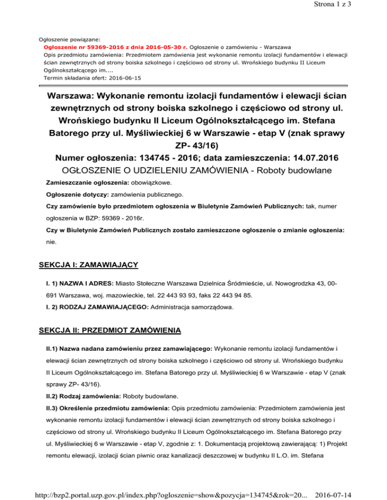 Strona 1 z 3 Ogłoszenie powiązane: Ogłoszenie nr 59369-2016 z dnia 2016-05-30 r. Ogłoszenie o zamówieniu - Warszawa Opis przedmiotu zamówienia: Przedmiotem zamówienia jest wykonanie remontu izolacji fundamentów i elewacji ścian zewnętrznych od strony boiska szkolnego i częściowo od strony ul. Wrońskiego budynku II Liceum Ogólnokształcącego im.... Termin składania ofert: 2016-06-15 Warszawa: Wykonanie remontu izolacji fundamentów i elewacji ścian zewnętrznych od strony boiska szkolnego i częściowo od strony ul. Wrońskiego budynku II Liceum Ogólnokształcącego im. Stefana Batorego przy ul. Myśliwieckiej 6 w Warszawie - etap V (znak sprawy ZP- 43/16) Numer ogłoszenia: 134745 - 2016; data zamieszczenia: 14.07.2016 OGŁOSZENIE O UDZIELENIU ZAMÓWIENIA - Roboty budowlane Zamieszczanie ogłoszenia: obowiązkowe. Ogłoszenie dotyczy: zamówienia publicznego. Czy zamówienie było przedmiotem ogłoszenia w Biuletynie Zamówień Publicznych: tak, numer ogłoszenia w BZP: 59369 - 2016r. Czy w Biuletynie Zamówień Publicznych zostało zamieszczone ogłoszenie o zmianie ogłoszenia: nie. SEKCJA I: ZAMAWIAJĄCY I. 1) NAZWA I ADRES: Miasto Stołeczne Warszawa Dzielnica Śródmieście, ul. Nowogrodzka 43, 00691 Warszawa, woj. mazowieckie, tel. 22 443 93 93, faks 22 443 94 85. I. 2) RODZAJ ZAMAWIAJĄCEGO: Administracja samorządowa. SEKCJA II: PRZEDMIOT ZAMÓWIENIA II.1) Nazwa nadana zamówieniu przez zamawiającego: Wykonanie remontu izolacji fundamentów i elewacji ścian zewnętrznych od strony boiska szkolnego i częściowo od strony ul. Wrońskiego budynku II Liceum Ogólnokształcącego im. Stefana Batorego przy ul. Myśliwieckiej 6 w Warszawie - etap V (znak sprawy ZP- 43/16). II.2) Rodzaj zamówienia: Roboty budowlane. II.3) Określenie przedmiotu zamówienia: Opis przedmiotu zamówienia: Przedmiotem zamówienia jest wykonanie remontu izolacji fundamentów i elewacji ścian zewnętrznych od strony boiska szkolnego i częściowo od strony ul. Wrońskiego budynku II Liceum Ogólnokształcącego im. Stefana Batorego przy ul. Myśliwieckiej 6 w Warszawie - etap V, zgodnie z: 1. Dokumentacją projektową zawierającą: 1) Projekt remontu elewacji, izolacji ścian piwnic oraz kanalizacji deszczowej w budynku II L.O. im. Stefana http://bzp2.portal.uzp.gov.pl/index.php?ogloszenie=show&pozycja=134745&rok=20... 2016-07-14 Strona 2 z 3 Batorego przy ul. Myśliwieckiej 6 w Warszawie - część I architektoniczno-budowlana, wykonany przez ABA Pracownia Architektoniczno Budowlana, ul. Grójecka 40a/25, Warszawa, dnia 20 listopada 2012r. Autorami opracowania są: mgr Hanna Buragiewicz, mgr inż. arch. Barbara Antoniewicz. 2) Przedmiar robót dla projektu remontu elewacji, izolacji ścian piwnic oraz kanalizacji deszczowej w budynku II L.O. im. Stefana Batorego przy ul. Myśliwieckiej 6 w Warszawie etap V - branża budowlana remont izolacji ścian piwnic, aktualizowany dnia 18 kwietnia 2016r. przez inż. Halinę Miturską głównego specjalistę WID dla Dzielnicy Śródmieście na podstawie przedmiaru wykonanego przez ABA Pracownia Architektoniczno Budowlana z dnia 16.11.2012r, 3) Przedmiar robót remontu elewacji od strony dziedzińca w budynku II L.O. im. Stefana Batorego przy ul. Myśliwieckiej 6 w Warszawie etap V - branża budowlana remont elewacji zewnętrznej aktualizowany dnia 18 kwietnia 2016r. przez inż. Halinę Miturską głównego specjalistę WID dla Dzielnicy Śródmieście na podstawie przedmiaru wykonanego przez ABA Pracownia Architektoniczno Budowlana z dnia 16.11.2012r. 2. Specyfikacje techniczne wykonania i odbioru robót budowlanych ST-WO i SST wymagania ogólne i szczegółowe dla remontu elewacji, izolacji ścian piwnic oraz kanalizacji deszczowej w budynku II L.O. im. Stefana Batorego przy ul. Myśliwieckiej 6 w Warszawie, wykonane przez ABA Pracownia Architektoniczno Budowlana, ul. Grójecka 40a/25, Warszawa, dnia 20 listopada 2012r. Autorami opracowania są: mgr Hanna Buragiewicz, mgr inż. arch. Barbara Antoniewicz, mgr inż. Elżbieta Kozińska. Ww. opracowania stanowią załącznik nr 7 do SIWZ. Zamawiający dopuszcza rozwiązania równoważne opisanym w dokumentacji projektowej oraz specyfikacji technicznej wykonania i odbioru robót. Wykonawca, który powołuje się na rozwiązania równoważne do opisanych przez Zamawiającego jest obowiązany wykazać, że oferowane przez niego produkty, urządzenia i technologie spełniają wymagania określone przez Zamawiającego. W przypadku zaoferowania innych urządzeń niż określone w SIWZ należy dołączyć do oferty karty katalogowe tych urządzeń. Szczegółowy opis przedmiotu zamówienia zawarty jest w projekcie umowy (załącznik nr 6 do SIWZ). II.4) Wspólny Słownik Zamówień (CPV): 45.45.30.00-7, 45.44.21.10-1, 45.42.10.00-4, 45.26.25.12-3, 45.32.00.00-6. SEKCJA III: PROCEDURA III.1) TRYB UDZIELENIA ZAMÓWIENIA: Przetarg nieograniczony III.2) INFORMACJE ADMINISTRACYJNE Zamówienie dotyczy projektu/programu finansowanego ze środków Unii Europejskiej: nie SEKCJA IV: UDZIELENIE ZAMÓWIENIA IV.1) DATA UDZIELENIA ZAMÓWIENIA: 13.07.2016. IV.2) LICZBA OTRZYMANYCH OFERT: 9. http://bzp2.portal.uzp.gov.pl/index.php?ogloszenie=show&pozycja=134745&rok=20... 2016-07-14 Strona 3 z 3 IV.3) LICZBA ODRZUCONYCH OFERT: 1. IV.4) NAZWA I ADRES WYKONAWCY, KTÓREMU UDZIELONO ZAMÓWIENIA: BEST BUILDINGS sp. z o.o., ul. Wojciecha Bogusławskiego 6 lok. 217, 01-923 Warszawa, kraj/woj. mazowieckie. IV.5) Szacunkowa wartość zamówienia (bez VAT): 892522,77 PLN. IV.6) INFORMACJA O CENIE WYBRANEJ OFERTY ORAZ O OFERTACH Z NAJNIŻSZĄ I NAJWYŻSZĄ CENĄ Cena wybranej oferty: 426836,79 Oferta z najniższą ceną: 426836,79 / Oferta z najwyższą ceną: 977000,00 Waluta: PLN . http://bzp2.portal.uzp.gov.pl/index.php?ogloszenie=show&pozycja=134745&rok=20... 2016-07-14