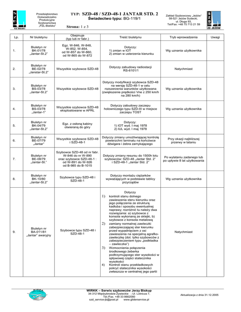 Przedsiębiorstwo Doświadczalno Produkcyjne Szybownictwa „PZL-Bielsko” TYP: SZD-48 / SZD-48-1 JANTAR STD. 2 Świadectwo typu: BG-119/1 Strona: 1 z 3 Zakład Szybowcowy „Jeżów“ 58-521 Jeżów Sudecki, ul. Długa 93, Tel/Fax: +48 75 713 21 59 Nr biuletynu Obejmuje (typ lub nr fabr.) Treść biuletynu Tryb wprowadzenia 1. Biuletyn nr BK-01/78 „Jantar-St.2” Egz. W-846, W-848, W-852, W-854, od W-857 do W-860, od W-865 do W-872 Dotyczy: 1) zmian w IOT 2) zmian w usterzenia kierunku Wg uznania użytkownika 2. Biuletyn nr BE-02/78 „Janstar-St.2” Wszystkie szybowce SZD-48 Dotyczy zabudowy radiostacji RS-6101/1 Natychmiast 3. Biuletyn nr BS-03/78 „Jantar-St.2” Wszystkie szybowce SZD-48 Dotyczy modyfikacji szybowca SZD-48 na wersję SZD-48-1 w celu rozszerzenia warunków użytkowana (zwiększenie prędkości Vne z 250 km/h na 280 km/h) Wg uznania użytkownika 4. Biuletyn nr BS-03/78 „Jantar-1” Wszystkie szybowce SZD-48 eksploatowane w APRL Dotyczy zabudowy zaczepu holowniczego typu SZD-III w miejsce zaczepu TOST Wg uznania użytkownika 5. Biuletyn nr BK-04/79 „Jantar-St.2” Egz. z osłoną kabiny otwieraną do góry Dotyczy: 1) IOT wyd. I maj 1978 2) IUL wyd. I maj 1978 6. Biuletyn nr BE-07/79 „Jantar” Wszystkie szybowce SZD-48 i SZD-48-1 Dotyczy zmiany umożliwiającej kontrolę powierzchni laminatu na końcówce dźwigara i żebra zamykającego Przy okazji najbliższej przerwy w lataniu 7. Biuletyn nr BE-08/79 „Jantar-St.” Szybowce SZD-48 od nr fabr. W-846 do nr W-890 oraz szybowce SZD-48-1 : od W-891 do W-926 od B-985 do B-1015 Dotyczy zmiany resursu do 1500h lotu szybowców: SZD-48 „Jantar Std. 2” i SZD-48-1 „Jantar Std. 2” Po wylataniu zadanego lub po upływie 8 lat użytkowania 8. Biuletyn nr BK-10/80 „Jantar-St.2” Szybowce typu SZD-48 i SZD-48-1 Dotyczy montażu ciężarków wyważających w podstawie tablicy przyrządów Wg uznania użytkownika Lp. 1) 2) 9. Biuletyn nr BA-011/81 „Jantar” awaryjny Szybowce typu SZD-48 i SZD-48-1 3) 4) Dotyczy kontroli stanu dolnego zawieszenia steru kierunku oraz jego połączenia ze strukturą kadłuba i sposobu ewentualnej naprawy; rozróżnić tu należy dwa rozwiązania: a) szybowce z konsola wykonaną ze sklejki, b) szybowce z konsola metalową zamiany normalnej zawleczki zabezpieczającej ster kierunku przed wypadnięciem z osi zawieszenia na specjalną agrafkozawleczkę (dot. tylko szybowców z zabezpieczeniem typu „podkładka – zawleczka”) Wzmocnienia połączenia środkowego żeberka podtrzymującego ster wysokości w spływowej części statecznika wysokości Kontroli stanu przekładkowych pokryć statecznika wysokości zwłaszcza w centralnej jego partii Uwagi Natychmiast WIRKK – Serwis szybowców Jerzy Biskup 34-312 Międzybrodzie Żywieckie ; Ul. Lotnicza 7, Tel./Fax. +48 33 8662080 [email protected] www.gliderservice.pl Aktualizacja z dnia 31.12.2005 Przedsiębiorstwo Doświadczalno Produkcyjne Szybownictwa „PZL-Bielsko” TYP: SZD-48 / SZD-48-1 JANTAR STD. 2 Świadectwo typu: BG-119/1 Strona: 2 z 3 Zakład Szybowcowy „Jeżów“ 58-521 Jeżów Sudecki, ul. Długa 93, Tel/Fax: +48 75 713 21 59 Nr biuletynu Obejmuje (typ lub nr fabr.) Treść biuletynu Tryb wprowadzenia Biuletyn nr BK-015/81 „Jantar” Wszystkie szybowce typu SZD-48 i SZD-48-1 do nr fabr. B-1202wł Dotyczy zabezpieczenia osłony tablicy przyrządów przed przypadkowym wypadnięciem Wprowadzić po otrzymaniu Biuletynu 11. Biuletyn nr BR-016/81 „Jantar” Szybowce SZD-48 od nr fabr. W-846 do W-890 oraz SZD-48-1 o nr fabr. W-891 do W-926, od B-985 do B-1064, od B-1095 do B-1124, od B-1135 do B-1274 Dotyczy wymiany sworzni spinających dźwignię napędową lotki w skrzydle z lotką Zmianę wprowadzić do dnia 30.09.1983r. 12. Biuletyn nr BI-017/82 „Jantar” Nr odnotowane w „Zestawieniu...” Dotyczy zestawienia dotychczas wydanych Biuletynów na szybowce typu „JANTAR”. Stan na dzień 30.04.1982r. Informacyjny 13. Biuletyn nr BK-019/83 „Jantar” Wszystkie szybowce typu SZD-48 i SZD-48-1 do nr fabr. B-1204 Dotyczy wymiany opasek mocujących naczynia wyrównawcze w tablicy przyrządów pokładowych Wg uznania użytkownika 14. Biuletyn nr BE-023/85 „Jantar-St.” Wszystkie szybowce typu: SZD-48 i SZD-48-1 Dotyczy zmiany w IUL (nie zaleca się stosowania zaczepu typu TOST EUROPA G72 w roli zaczepu przedniego) Obowiązkowo 15. Biuletyn nr BE-026/86 „Jantar-St.” Szybowce: SZD-48 od W-846 do W-890, SZD-48-1: od W-891 do W-926, od B-985 do B-1274, Dotyczy rozszerzenia resursu szybowcom SZD-48 i SZD-48-1 „Jantar Std. 2” z dotychczasowych 1500h na 3000h lotu Obowiązkowo 16. Biuletyn nr BE-027/86 „Jantar” Wszystkie szybowce typu: SZD-48 i SZD-48-1 Dotyczy rozszerzenia żywotności lin z rdzeniem metalowym w napędzie steru kierunku szybowców typu „Jantar” Obowiązkowo 17. Biuletyn nr BE-029/87 „Jantar” Wszystkie szybowce typu: SZD-48 i SZD-48-1 Dotyczy dodatkowego zabezpieczenia sworznia spinającego usterzenie wysokości ze statecznikiem kierunku przed samoczynnym wysunięciem się Wg uznania użytkownika 18. Biuletyn nr BR-032/87 „Jantar” Wszystkie szybowce typu: SZD-48 i SZD-48-1 Dotyczy kompensacji luzów w połączeniu kadłub-skrzydło (skrzydłokońcówka skrzydła)-szybowców rodziny „Jantar” Obowiązkowo w przypadku nadmiernych luzów 19. Biuletyn nr BR-033/88 „Jantar-St.2” Szybowce typu SZD-48-1 i SZD-48 o nr fabr.: od W-846 do W-926, od B-985 do B-1064, od B-1095 do B-1124, od B-1135 do B-1274 Dotyczy sprawdzenia czy nie występuje kolizja sprężyny wyważenia z podłogą kabiny oraz ewentualnej korekty długości ramienia sprężyny wyważenia Natychmiast 20. Biuletyn nr BE-035/88 „Jantar-St.3” Szybowce SZD-48-1 o nr fabr. B-1266 i B-1268 Dotyczy zmiany czasu pracy szybowców typu SZD-48-1 Wg uznania użytkownika Lp. 10. Uwagi WIRKK – Serwis szybowców Jerzy Biskup 34-312 Międzybrodzie Żywieckie ; Ul. Lotnicza 7, Tel./Fax. +48 33 8662080 [email protected] w