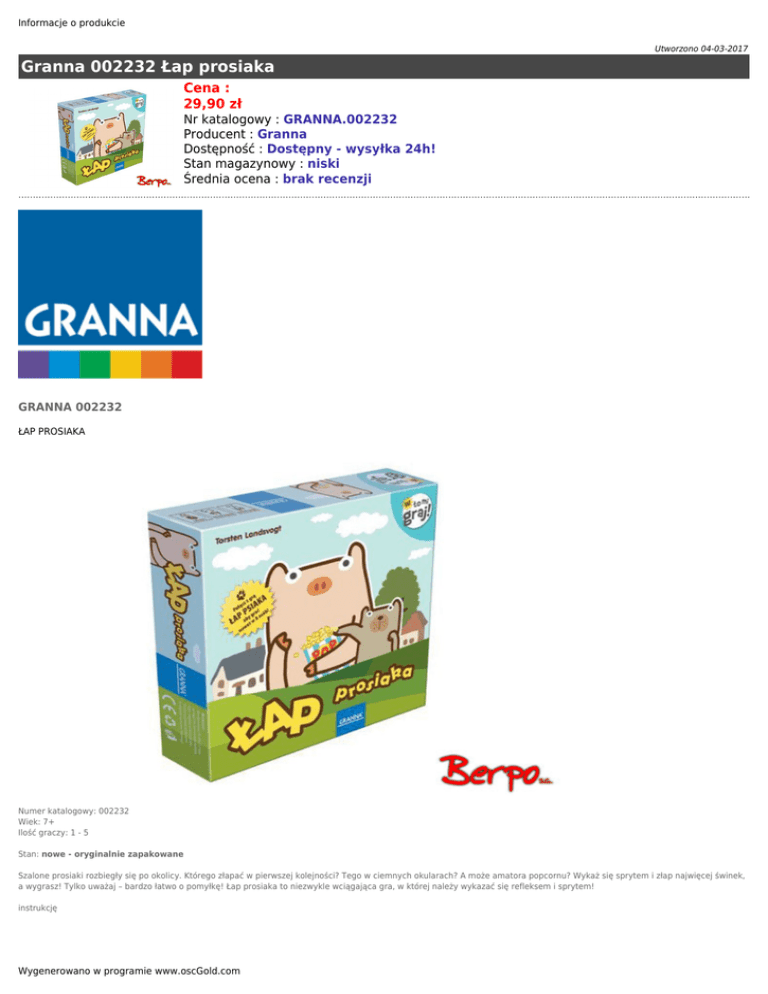 Informacje o produkcie Utworzono 04-03-2017 Granna 002232 Łap prosiaka Cena : 29,90 zł Nr katalogowy : GRANNA.002232 Producent : Granna Dostępność : Dostępny - wysyłka 24h! Stan magazynowy : niski Średnia ocena : brak recenzji GRANNA 002232 ŁAP PROSIAKA Numer katalogowy: 002232 Wiek: 7+ Ilość graczy: 1 - 5 Stan: nowe - oryginalnie zapakowane Szalone prosiaki rozbiegły się po okolicy. Którego złapać w pierwszej kolejności? Tego w ciemnych okularach? A może amatora popcornu? Wykaż się sprytem i złap najwięcej świnek, a wygrasz! Tylko uważaj – bardzo łatwo o pomyłkę! Łap prosiaka to niezwykle wciągająca gra, w której należy wykazać się refleksem i sprytem! instrukcję Wygenerowano w programie www.oscGold.com Dostępność w salonach: Ilość sztuk: Sklep - Złotniki: 1 Sklep - zlikwidowany: 0 Sklep - Szczepankowo: 1 Dostępne opcje Granna 002232 Łap prosiaka » Wiek: 8 - 11 lat, 12 lat i więcej.