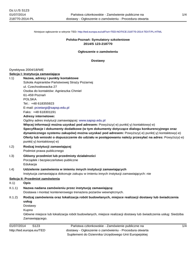 Dz.U./S S123 01/07/2014 218770-2014-PL Państwa członkowskie - Zamówienie publiczne na dostawy - Ogłoszenie o zamówieniu - Procedura otwarta 1/4 Niniejsze ogłoszenie w witrynie TED: http://ted.europa.eu/udl?uri=TED:NOTICE:218770-2014:TEXT:PL:HTML Polska-Poznań: Symulatory szkoleniowe 2014/S 123-218770 Ogłoszenie o zamówieniu Dostawy Dyrektywa 2004/18/WE Sekcja I: Instytucja zamawiająca I.1) Nazwa, adresy i punkty kontaktowe Szkoła Aspirantów Państwowej Straży Pożarnej ul. Czechosłowacka 27 Osoba do kontaktów: Agnieszka Chmiel 61-459 Poznań POLSKA Tel.: +48 618355923 E-mail: [email protected] Faks: +48 618301191 Adresy internetowe: Ogólny adres instytucji zamawiającej: www.sapsp.edu.pl Więcej informacji można uzyskać pod adresem: Powyższy(-e) punkt(-y) kontaktowy(-e) Specyfikacje i dokumenty dodatkowe (w tym dokumenty dotyczące dialogu konkurencyjnego oraz dynamicznego systemu zakupów) można uzyskać pod adresem: Powyższy(-e) punkt(-y) kontaktowy(-e) Oferty lub wnioski o dopuszczenie do udziału w postępowaniu należy przesyłać na adres: Powyższy(-e) punkt(-y) kontaktowy(-e) I.2) Rodzaj instytucji zamawiającej Podmiot prawa publicznego I.3) Główny przedmiot lub przedmioty działalności Porządek i bezpieczeństwo publiczne Edukacja I.4) Udzielenie zamówienia w imieniu innych instytucji zamawiających Instytucja zamawiająca dokonuje zakupu w imieniu innych instytucji zamawiających: nie Sekcja II: Przedmiot zamówienia II.1) Opis II.1.1) Nazwa nadana zamówieniu przez instytucję zamawiającą: Dostawa i montaż kontenerowego trenażera pożarów wewnętrznych. II.1.2) Rodzaj zamówienia oraz lokalizacja robót budowlanych, miejsce realizacji dostawy lub świadczenia usług Dostawy Kupno Główne miejsce lub lokalizacja robót budowlanych, miejsce realizacji dostawy lub świadczenia usług: Siedziba Zamawiającego. 01/07/2014 S123 http://ted.europa.eu/TED Państwa członkowskie - Zamówienie publiczne na dostawy - Ogłoszenie o zamówieniu - Procedura otwarta Suplement do Dziennika Urzędowego Unii Europejskiej 1/4 Dz.U./S S123 01/07/2014 218770-2014-PL Państwa członkowskie - Zamówienie publiczne na dostawy - Ogłoszenie o zamówieniu - Procedura otwarta 2/4 Kod NUTS PL415 II.1.3) Informacje na temat zamówienia publicznego, umowy ramowej lub dynamicznego systemu zakupów (DSZ) Ogłoszenie dotyczy zamówienia publicznego II.1.4) Informacje na temat umowy ramowej II.1.5) Krótki opis zamówienia lub zakupu Dostawa i montaż kontenerowego trenażera pożarów wewnętrznych. II.1.6) Wspólny Słownik Zamówień (CPV) 34152000 II.1.7) Informacje na temat Porozumienia w sprawie zamówień rządowych (GPA) Zamówienie jest objęte Porozumieniem w sprawie zamówień rządowych (GPA): nie II.1.8) Części To zamówienie podzielone jest na części: nie II.1.9) Informacje o ofertach wariantowych Dopuszcza się składanie ofert wariantowych: nie II.2) Wielkość lub zakres zamówienia II.2.1) Całkowita wielkość lub zakres: Szacunkowa wartość bez VAT: 858 630 PLN II.2.2) Informacje o opcjach Opcje: nie II.2.3) Informacje o wznowieniach Jest to zamówienie podlegające wznowieniu: nie II.3) Czas trwania zamówienia lub termin realizacji Rozpoczęcie 20.8.2014. Zakończenie 9.12.2014 Sekcja III: Informacje o charakterze prawnym, ekonomicznym, finansowym i technicznym III.1) Warunki dotyczące zamówienia III.1.1) Wymagane wadia i gwarancje: 25 750 PLN. III.1.2) Główne warunki finansowe i uzgodnienia płatnicze i/lub odniesienie do odpowiednich przepisów je regulujących: III.1.3) Forma prawna, jaką musi przyjąć grupa wykonawców, której zostanie udzielone zamówienie: III.1.4) Inne szczególne warunki Wykonanie zamówienia podlega szczególnym warunkom: nie III.2) Warunki udziału III.2.1) Sytuacja podmiotowa wykonawców, w tym wymogi związane z wpisem do rejestru zawodowego lub handlowego III.2.2) Zdolność ekonomiczna i finansowa Informacje i formalności konieczne do dokonania oceny spełniania wymogów: Wykonawca jest ubezpieczony od odpowiedzialności cywilnej w zakresie prowadzonej działalności. Minimalny poziom ewentualnie wymaganych standardów: Wymagane ubezpieczenie na kwotę min. 1 000 000 PLN. 01/07/2014 S123 http://ted.europa.eu/TED Państwa członkowskie - Zamówienie publiczne na dostawy - Ogłoszenie o zamówieniu - Procedura otwarta Suplement do Dziennika Urzędowego Unii Europejskiej 2/4 Dz.U./S S123 01/07/2014 218770-2014-PL Państwa członkowskie - Zamówienie publiczne na dostawy - Ogłoszenie o zamówieniu - Procedura otwarta III.2.3) Kwalifikacje techniczne III.2.4) Informacje o zamówieniach zastrzeżonych III.3) Specyficzne warunki dotyczące zamówień na usługi III.3.1) Informacje dotyczące określonego zawodu III.3.2) Osoby odpowiedzialne za wykonanie usługi 3/4 Sekcja IV: Procedura IV.1) Rodzaj procedury IV.1.1) Rodzaj procedury Otwarta IV.1.2) Ograniczenie liczby wykonawców, którzy zostaną zaproszeni do składania ofert lub do udziału IV.1.3) Zmniejszenie liczby wykonawców podczas negocjacji lub dialogu IV.2) Kryteria udzielenia zamówienia IV.2.1) Kryteria udzielenia zamówienia Najniższa cena IV.2.2) Informacje na temat aukcji elektronicznej Wykorzystana będzie aukcja elektroniczna: nie IV.3) Informacje administracyjne IV.3.1) Numer referencyjny nadany sprawie przez instytucję zamawiającą: ST-IV.2370.16.2014 IV.3.2) Poprzednie publikacje dotyczące tego samego zamówienia nie IV.3.3) Warunki otrzymania specyfikacji, dokumentów dodatkowych lub dokumentu opisowego Termin składania wniosków dotyczących uzyskania dokumentów lub dostępu do dokumentów: 6.8.2014 Dokumenty odpłatne: nie IV.3.4) Termin składania ofert lub wniosków o dopuszczenie do udziału w postępowaniu 7.8.2014 - 09:00 IV.3.5) Data wysłania zaproszeń do składania ofert lub do udziału zakwalifikowanym kandydatom IV.3.6) Języki, w których można sporządzać oferty lub wnioski o dopuszczenie do udziału w postępowaniu polski. 
