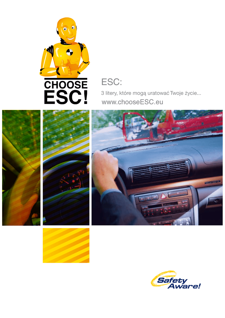 ESC: 3 litery, które mogą uratować Twoje życie... Wybierz ESC - Trzy litery, które mogą uratować Twoje życie... Elektroniczna Kontrola Stabilności (Electronic Stability Control – w skrócie ESC) – jest systemem bezpieczeństwa pojazdu, który może Ci pomóc uniknąć zderzenia poprzez zmniejszenie ryzyka poślizgu. Codziennie, prowadząc samochód, napotykasz wiele sytuacji, w których potencjalnie możesz wpaść w poślizg: na drogę niespodziewanie wybiegnie dziecko, nagle otworzą się drzwi zaparkowanego samochodu, lub samochód nagle zacznie zmieniać pas ruchu, ...... To właśnie wtedy, gdy zaskoczy Cię coś niespodziewanego, zagrożenie jest największe. Nagle musisz przeciwdziałać niebezpieczeństwu… tracisz kontrolę nad samochodem... samochód wpada w poślizg. Wtedy właśnie ESC może pospieszyć na ratunek! System ESC uruchamia się, gdy kierowca traci kontrolę nad samochodem. ESC ocenia ryzyko poślizgu we wczesnym stadium i wykorzystuje hamulce pojazdu do bezpiecznego skierowania go ponownie na tor jazdy. Do czego jest mi potrzebny system ESC? Poślizg jest przyczyną co najmniej 40% wypadków drogowych ze skutkiem śmiertelnym. Badania wskazują, że ESC może zredukować liczbę wypadków wynikających z poślizgu aż o 80%. Jak działa ESC? ESC działa poprzez szereg inteligentnych czujników wykrywających utratę kontroli. 25 razy na minutę ESC porównuje działania kierującego samochodem z rzeczywistym kierunkiem jazdy. Jeśli te czynniki nie są zsynchronizowane i samochód wpada w niekontrolowany poślizg, ESC interweniuje poprzez wyhamowanie odpowiedniego koła. ESC współpracuje z komputerowym systemem hamowania zapobiegającym blokowaniu kół, w celu korygowania nadsterowności (gdy ślizga się tył samochodu) lub podsterowności (gdy przyczepność tracą koła przednie). W ten sposób ESC pomaga przywrócić sterowność auta, utrzymując je na linii kierunku obranego przez kierowcę. Czy ESC różni się od systemu hamowania zapobiegającego blokowaniu kół (ABS) i systemu kontroli trakcji pojazdu (TCS)? ESC zawiera wszystkie elementy ABS i TCS, z dodatkowym systemem kontroli stabilności. Poprzez zapobieganie blokowaniu kół, ABS utrzymuje sterowność pojazdu wtedy, gdy zachodzi konieczność gwałtownego hamowania. TCS zapobiega poślizgowi kół podczas przyspieszania i zapewnia optymalną trakcję pojazdu. Podczas gdy ABS i TCS kontrolują ruch wzdłuż – zgodny z kierunkiem jazdy, ESC pomaga w kontrolowaniu ruchu na boki, prowadzącego do poślizgu. Czy ESC ma jeszcze inne nazwy? Tak. ESC występuje pod różnymi nazwami: może się nazywać ESP (Electronic Stability Programme – Elektroniczny Program Stabilności), DSC (Dynamic Stability Control – Dynamiczna Kontrola Stabilności), VSA (Vehicle Stability Assist – Wspomaganie Stabilności Pojazdu), VSC (Vehicle Stability Control – Kontrola Stabilności Pojazdu). Czy mam uruchamiać ESC podczas uruchamiania silnika? Nie. ESC jest włączony i aktywny zawsze gdy uruchomiony jest silnik. Niektórzy producenci instalują w swych pojazdach przełącznik ESC. W większości przypadków po wciśnięciu tego przycisku TCS zostaje odłączony. Fakt ten jest sygnalizowany przez kontrolkę znajdującą się na tablicy rozdzielczej. Dezaktywacja TCS przydaje się niekiedy w szczególnych sytuacjach na drodze, gdy potrzebny jest poślizg, np. na śniegu. Czy mogę zainstalować ESC w samochodzie już kupionym? Nie, ESC nie może być instalowany dodatkowo. Dlatego też, upewnij się co do słuszności swej decyzji już na samym początku – przy zakupie kolejnego samochodu: “Wybierz ESC!” Czy jeżdżąc autem z systemem ESC muszę zmienić sposób prowadzenia? Nie, ESC wspomaga kierowanie pojazdem w krytycznych sytuacjach poślizgowych. Nie wymaga żadnych zmian w stylu kierowania autem. Zawsze należy prowadzić ostrożnie i z uwagą. Co mam zatem zrobić w kwestii ESC? W Europie ESC jest dostępny jest jako wyposażenie standardowe aut wyższej klasy. W autach średniej wielkości i małych, dostępny jest jako opcja. Następnym razem pomyśl o ESC przy zakupie auta. Spytaj dealera o auto wyposażone w ESC. Nigdy nie wiesz, kiedy może zdarzyć się wypadek, nie ryzykuj więc życiem swoim ani swojej rodziny. Wybierz ESC! Gdzie znajdę więcej informacji na ten temat? Odwiedź naszą stronę internetową www.chooseESC.eu “Wybierz ESC!” (Choose ESC!) jest publiczną kampanią informacyjną wspieraną przez Komisję Europejską, eSafetyAware! i European New Car Assessment Program Euro NCAP (Europejski Program Oceny Nowych Samochodów).