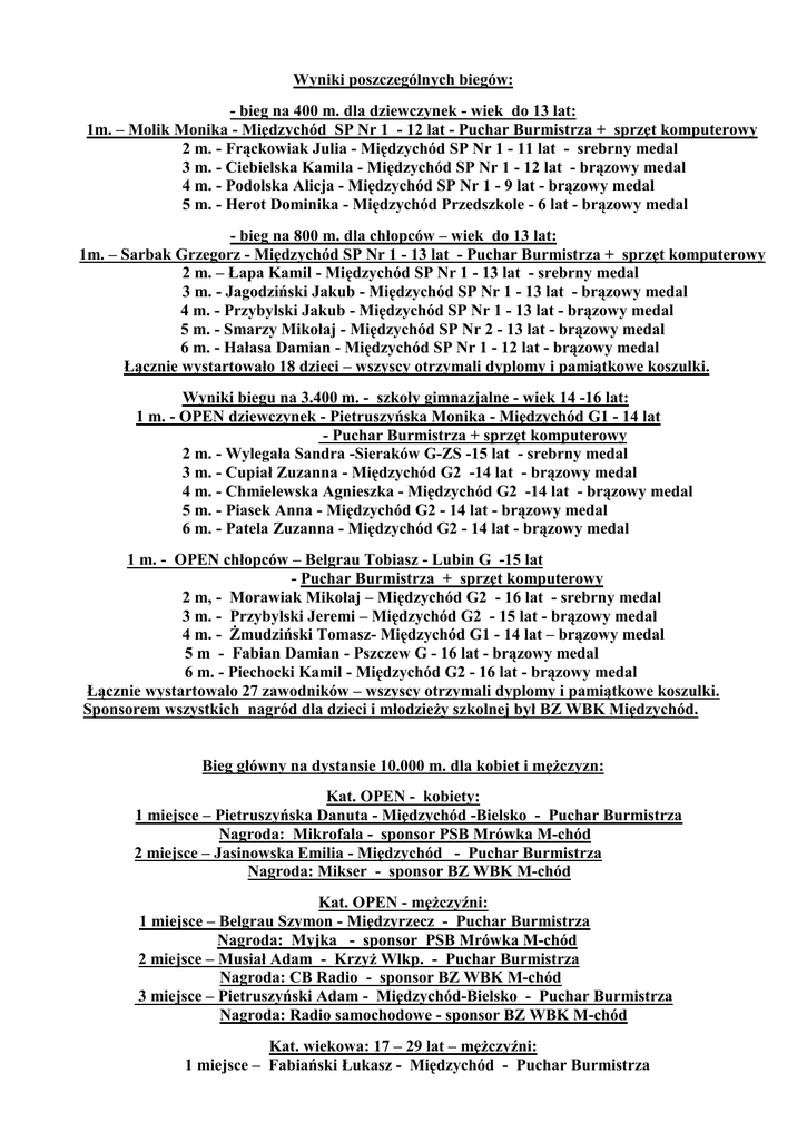 Wyniki poszczególnych biegów: - bieg na 400 m. dla dziewczynek - wiek do 13 lat: 1m. – Molik Monika - Międzychód SP Nr 1 - 12 lat - Puchar Burmistrza + sprzęt komputerowy 2 m. - Frąckowiak Julia - Międzychód SP Nr 1 - 11 lat - srebrny medal 3 m. - Ciebielska Kamila - Międzychód SP Nr 1 - 12 lat - brązowy medal 4 m. - Podolska Alicja - Międzychód SP Nr 1 - 9 lat - brązowy medal 5 m. - Herot Dominika - Międzychód Przedszkole - 6 lat - brązowy medal - bieg na 800 m. dla chłopców – wiek do 13 lat: 1m. – Sarbak Grzegorz - Międzychód SP Nr 1 - 13 lat - Puchar Burmistrza + sprzęt komputerowy 2 m. – Łapa Kamil - Międzychód SP Nr 1 - 13 lat - srebrny medal 3 m. - Jagodziński Jakub - Międzychód SP Nr 1 - 13 lat - brązowy medal 4 m. - Przybylski Jakub - Międzychód SP Nr 1 - 13 lat - brązowy medal 5 m. - Smarzy Mikołaj - Międzychód SP Nr 2 - 13 lat - brązowy medal 6 m. - Hałasa Damian - Międzychód SP Nr 1 - 12 lat - brązowy medal Łącznie wystartowało 18 dzieci – wszyscy otrzymali dyplomy i pamiątkowe koszulki. Wyniki biegu na 3.400 m. - szkoły gimnazjalne - wiek 14 -16 lat: 1 m. - OPEN dziewczynek - Pietruszyńska Monika - Międzychód G1 - 14 lat - Puchar Burmistrza + sprzęt komputerowy 2 m. - Wylegała Sandra -Sieraków G-ZS -15 lat - srebrny medal 3 m. - Cupiał Zuzanna - Międzychód G2 -14 lat - brązowy medal 4 m. - Chmielewska Agnieszka - Międzychód G2 -14 lat - brązowy medal 5 m. - Piasek Anna - Międzychód G2 - 14 lat - brązowy medal 6 m. - Patela Zuzanna - Międzychód G2 - 14 lat - brązowy medal 1 m. - OPEN chłopców – Belgrau Tobiasz - Lubin G -15 lat - Puchar Burmistrza + sprzęt komputerowy 2 m, - Morawiak Mikołaj – Międzychód G2 - 16 lat - srebrny medal 3 m. - Przybylski Jeremi – Międzychód G2 - 15 lat - brązowy medal 4 m. - Żmudziński Tomasz- Międzychód G1 - 14 lat – brązowy medal 5 m - Fabian Damian - Pszczew G - 16 lat - brązowy medal 6 m. - Piechocki Kamil - Międzychód G2 - 16 lat - brązowy medal Łącznie wystartowało 27 zawodników – wszyscy otrzymali dyplomy i pamiątkowe koszulki. Sponsorem wszystkich nagród dla dzieci i młodzieży szkolnej był BZ WBK Międzychód. Bieg główny na dystansie 10.000 m. dla kobiet i mężczyzn: Kat. OPEN - kobiety: 1 miejsce – Pietruszyńska Danuta - Międzychód -Bielsko - Puchar Burmistrza Nagroda: Mikrofala - sponsor PSB Mrówka M-chód 2 miejsce – Jasinowska Emilia - Międzychód - Puchar Burmistrza Nagroda: Mikser - sponsor BZ WBK M-chód Kat. OPEN - mężczyźni: 1 miejsce – Belgrau Szymon - Międzyrzecz - Puchar Burmistrza Nagroda: Myjka - sponsor PSB Mrówka M-chód 2 miejsce – Musiał Adam - Krzyż Wlkp. - Puchar Burmistrza Nagroda: CB Radio - sponsor BZ WBK M-chód 3 miejsce – Pietruszyński Adam - Międzychód-Bielsko - Puchar Burmistrza Nagroda: Radio samochodowe - sponsor BZ WBK M-chód Kat. wiekowa: 17 – 29 lat – mężczyźni: 1 miejsce – Fabiański Łukasz - Międzychód - Puchar Burmistrza 2 miejsce – Rusin Radosław - Wronki - Puchar Burmistrza 3 miejsce – Majchrzak Karol - Lewice - Puchar Burmistrza Kat. wiekowa: 30 – 39 lat – mężczyźni: 1 miejsce – Helak Karol - Krzyż Wlkp. - Puchar Burmistrza 2 miejsce - Łuczak Maciej - Międzychód - Puchar Burmistrza 3 miejsce – Gotfrydziak Szymon - Międzychód - Puchar Burmistrza Kat. wiekowa: 40 – 49 lat – mężczyźni: 1 miejsce – Szulczyk Sławomir - Międzychód - Puchar Burmistrza 2 miejsce – Orywał Piotr - Poznań - Puchar Burmistrza 3 miejsce – Agaciak Roman - Międzychód - Puchar Burmistrza Kat. wiekowa: 50 – 59 lat – mężczyźni: 1 miejsce – Pietruszyński Gerard – Międzychód-Bielsko - Puchar Burmistrza 2 miejsce – Kuliński Bogdan - Głogów - Puchar Burmistrza 3 miejsce – Rybarczyk Marek - Krzyż Wlkp. - Puchar Burmistrza Kat. wiekowa: 60 – 69 lat – mężczyźni: 1 miejsce – Rybicki Janusz - Police - Puchar Burmistrza 2 miejsce – Liszewski Zygmunt - Szczecin - Puchar Burmistrza Kat. wiekowa: 70 lat i starsi – mężczyźni: 1 miejsce – Wrona Józef –Wieleń – Puchar Burmistrza Nagroda specjalna dla najstarszego zawodnik - 74 lata - Grill – sponsor BZ WBK M-chód W biegu głównym na dystansie 10.000 m. pobiegło 32 biegaczy w tym 2 kobiety – wszyscy otrzymali dyplomy i pamiątkowe koszulki oraz posiłek. Łącznie we wszystkich biegach uczestniczyło 77 biegaczy w tym 20 biegaczek z następujących miejscowości: Szczecina, Polic, Krzyża Wlkp., Wielenia, Poznania, Głogowa , Strzelec Krajeńskich, Międzyrzecza, Drezdenka, Lwówka, Małogoszczy, Kłodawy, Wronek, Lubina, Kwilcza, Kamionny, Lewic, Sierakowa , Muchocina, Bielska i Międzychodu. Fundatorem okolicznościowych koszulek z logo był MOSTiR sp. z o.o. Międzychód. Fundatorem pucharów, medali i dyplomów był Urząd Miasta i Gminy w Międzychodzie a głównymi sponsorami nagród rzeczowych Bank Zachodni WBK Oddział w Międzychodzie oraz PSB Mrówka w Międzychodzie. Otwarcia imprezy i wręczenia pucharów, medali , dyplomów i nagród rzeczowych po jej zakończeniu dokonali: Z-ca Burmistrza Międzychodu Krzysztof Michalski w towarzystwie Dyrektora BZ WBK O/Międzychód Agnieszki Środeckiej. Organizatorzy VIII Biegu Świętojańskiego serdecznie dziękują za okazaną pomoc przy organizacji biegu następującym osobom i instytucjom : - Pani Krystynie Grzesiak – za społeczną opiekę medyczną na trasie biegu - Panu Sławomirowi Troszczyńskiemu – za prowadzenie gastronomii na Stadionie - Banku Zachodniemu WBK w Międzychodzie – za ufundowane nagrody rzeczowe - PSB Mrówka w Międzychodzie – za ufundowane nagrody rzeczowe - Powiatowej Komendzie Policji w Międzychodzie – za zabezpieczenie ul. Sokoła - Powiatowej Straży Pożarnej i Ochotniczej Straż Pożarnej w Międzychodzie – za pomoc strażaków w zabezpieczeniu trasy biegu i zabezpieczenie wybiegu ze Stadionu - SP ZOZ w Międzychodzie – za bezpłatną karetkę pogotowia. Imprez