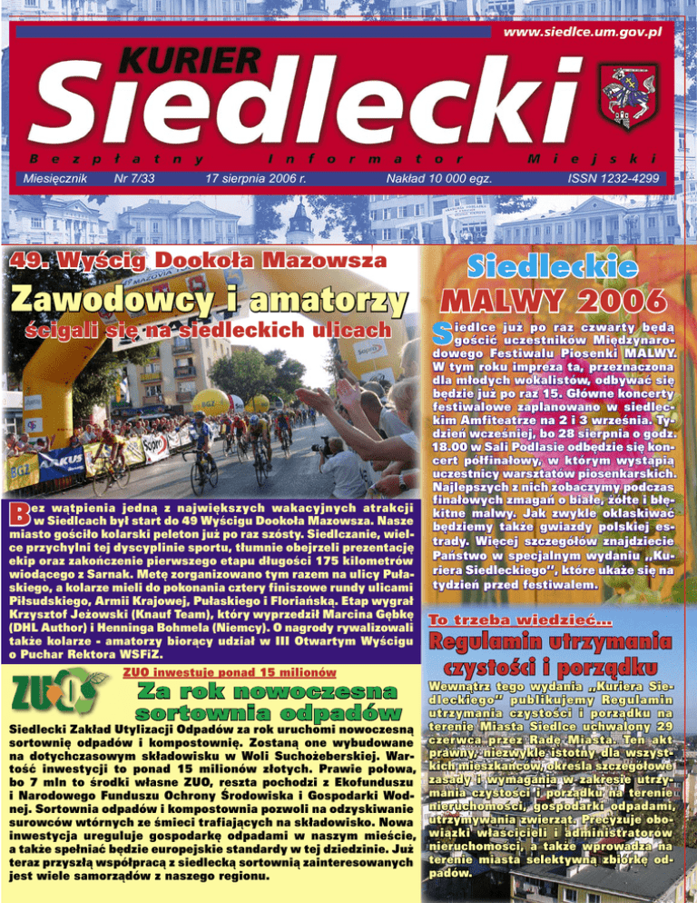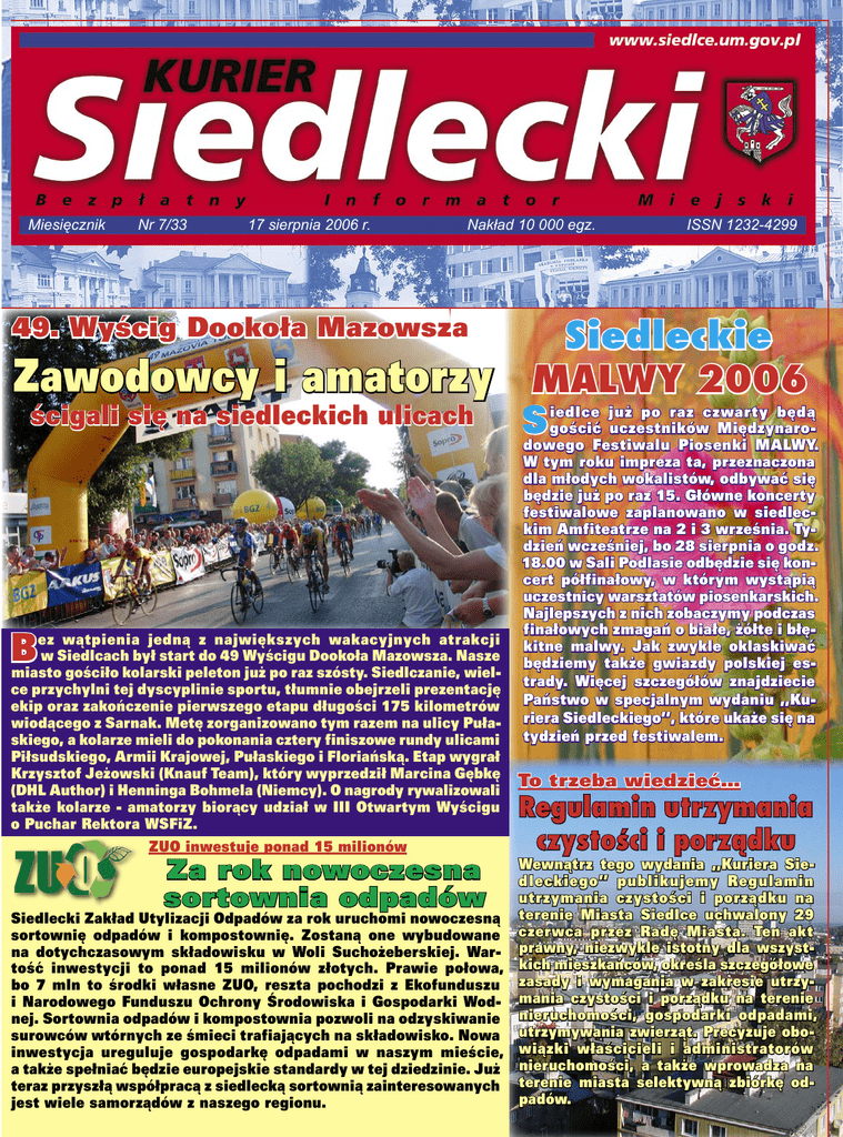 Miesięcznik Nr 7/33 17 sierpnia 2006 r. Nakład 10 000 egz. 49. Wyścig Dookoła Mazowsza Zawodowcy i amatorzy ścigali się na siedleckich ulicach B ez wątpienia jedną z największych wakacyjnych atrakcji w Siedlcach był start do 49 Wyścigu Dookoła Mazowsza. Nasze miasto gościło kolarski peleton już po raz szósty. Siedlczanie, wielce przychylni tej dyscyplinie sportu, tłumnie obejrzeli prezentację ekip oraz zakończenie pierwszego etapu długości 175 kilometrów wiodącego z Sarnak. Metę zorganizowano tym razem na ulicy Pułaskiego, a kolarze mieli do pokonania cztery finiszowe rundy ulicami Piłsudskiego, Armii Krajowej, Pułaskiego i Floriańską. Etap wygrał Krzysztof Jeżowski (Knauf Team), który wyprzedził Marcina Gębkę (DHL Author) i Henninga Bohmela (Niemcy). O nagrody rywalizowali także kolarze - amatorzy biorący udział w III Otwartym Wyścigu o Puchar Rektora WSFiZ. ZUO inwestuje ponad 15 milionów Za rok nowoczesna sortownia odpadów ISSN 1232-4299 Siedleckie MALWY 2006 S iedlce już po raz czwarty będą gościć uczestników Międzynarodowego Festiwalu Piosenki MALWY. W tym roku impreza ta, przeznaczona dla młodych wokalistów, odbywać się będzie już po raz 15. Główne koncerty festiwalowe zaplanowano w siedleckim Amfiteatrze na 2 i 3 września. Tydzień wcześniej, bo 28 sierpnia o godz. 18.00 w Sali Podlasie odbędzie się koncert półfinałowy, w którym wystąpią uczestnicy warsztatów piosenkarskich. Najlepszych z nich zobaczymy podczas finałowych zmagań o białe, żółte i błękitne malwy. Jak zwykle oklaskiwać będziemy także gwiazdy polskiej estrady. Więcej szczegółów znajdziecie Państwo w specjalnym wydaniu „Kuriera Siedleckiego”, które ukaże się na tydzień przed festiwalem. To trzeba wiedzieć… Regulamin utrzymania czystości i porządku Wewnątrz tego wydania „Kuriera Siedleckiego” publikujemy Regulamin utrzymania czystości i porządku na Siedlecki Zakład Utylizacji Odpadów za rok uruchomi nowoczesną terenie Miasta Siedlce uchwalony 29 sortownię odpadów i kompostownię. Zostaną one wybudowane czerwca przez Radę Miasta. Ten akt na dotychczasowym składowisku w Woli Suchożeberskiej. War- prawny, niezwykle istotny dla wszysttość inwestycji to ponad 15 milionów złotych. Prawie połowa, kich mieszkańców, określa szczegółowe bo 7 mln to środki własne ZUO, reszta pochodzi z Ekofunduszu zasady i wymagania w zakresie utrzyi Narodowego Funduszu Ochrony Środowiska i Gospodarki Wod- mania czystości i porządku na terenie nej. Sortownia odpadów i kompostownia pozwoli na odzyskiwanie nieruchomości, gospodarki odpadami, surowców wtórnych ze śmieci trafiających na składowisko. Nowa utrzymywania zwierząt. Precyzuje oboinwestycja ureguluje gospodarkę odpadami w naszym mieście, wiązki właścicieli i administratorów a także spełniać będzie europejskie standardy w tej dziedzinie. Już nieruchomości, a także wprowadza na teraz przyszłą współpracą z siedlecką sortownią zainteresowanych terenie miasta selektywną zbiórkę odpadów. jest wiele samorządów z naszego regionu. INFORMACJE Amerykańskie złoto dla Caro Dance C ztery złote medale, jeden srebrny i brązowy zdobyli na Mistrzostwach Świata Jazz Dance i Modern Dance, które odbywały się 20 i 21 lipca w Bostonie. Ich występ wywołał prawdziwy szok u miejscowej Polonii, która ze łzami w oczach czterokrotnie wysłuchała Mazurka Dąbrowskiego. Oli Pruszko i Adzie Patłaszyńskiej. Drugie złoto i Mistrzostwo Świata dla Polski wytańczył Brajan Poniatowski w kategorii Jazz Dance solo dorośli, a trzeci tytuł zdobyły ponownie Ola Pruszko i Ada Patłaszyńska tym razem w kategorii Modern Dance Duety Juniorzy. Kropkę nad i postawił duet Iza Orzełowska i Brajan Poniatowski zdobywając złoty medal i Mistrzostwo Świata w kategorii modern duety dorośli. Warto odnotować także srebrny medal Brajana Poniatowskiego w kategorii modern solo dorośli, brązowy medal Izy Orzełowskiej i Brajana w jazz duetach dorosłych oraz piąte miejsce mini jazz dance dorosłych. Polonia bostońska licznie zgromadzona w Park Plaza, oniemiała z zachwytu. Gratulacjom, zdjęciom i autografom nie było końca. Całą reprezentację nasi rodacy zaprosili do najlepszej restauracji w centrum Bostonu Maggiano’s, gdzie gościły największe sławy Ameryki. Kolejne dni po mistrzostwach tancerze spędzili u polskich rodzin w Bostonie. Młodzi tancerze z CKiS zachwycili formą taneczną i kondycją fizyczną. W tym roku czeka ich jeszcze kilka prestiżowych imprez międzynarodowych na starym kontynencie.Wyniki Caro Dance udowodniły, że można tworzyć kulturę na światowym poziomie, na bazie młodych, zdolnych i ambitnych ludzi, bez względu na to czy pochodzi z dużego czy małego miasta. Ważne, żeby ludzie byli kreatywni i poszukujący. Ważne jest aby rodzice, szkoła, miasto, dawali siłę i wiarę w siebie i swoje możliwości, a wtedy można wszystko - nawet przywieść złote medale z Ameryki do Siedlec. Taneczny Jazz i Modern Dance to najbardziej prestiżowe kategorie wśród tancerzy na wszystkich kontynentach. Te style zrodziły się na musicalowych scenach Broadway’u. Dla tancerzy Caro Dance była to więc wyprawa do „paszczy lwa” i „kolebki musicalu”. Impreza, jak na amerykański show, przystało odbyła się we wspaniałej reprezentacyjnej Scott Folwer i tancerze Caro Dance sali balowej Hotelu Boston gólnych przygotowań do mistrzostw w Park Plaza. Tutaj zawsze zamieszkują odwiedzający miasto prezy- Bostonie. Tuż przed samymi mistrzodenci Stanów Zjednoczonych. Do stolicy stwami odbył się 14 dniowy obóz przygostanu Massachusets przyjechało 700 tan- towawczy. W pierwszym tygocerzy z całego świata. Mistrzostwa stały dniu tancerze przygotowywali na znakomitym poziomie artystycznym. się według standardowego sysPrzez dwa dni prezentacje zachwycały bo- temu treningowego. W drugim stońską publiczność i profesjo