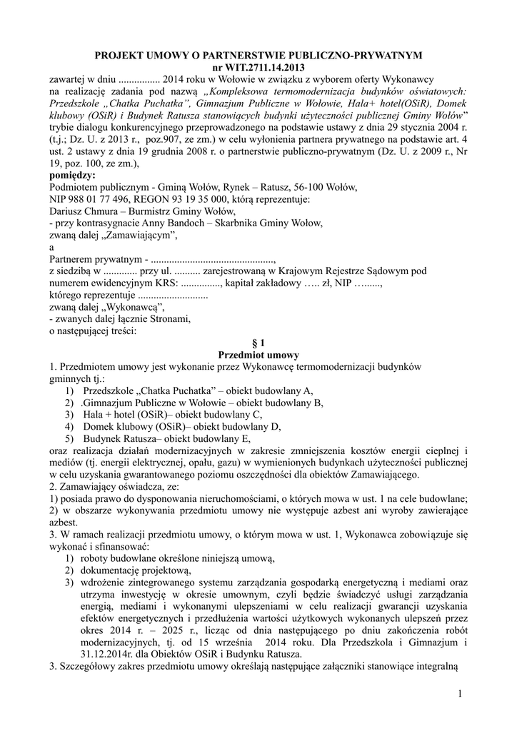 PROJEKT UMOWY O PARTNERSTWIE PUBLICZNO-PRYWATNYM nr WIT.2711.14.2013 zawartej w dniu ................ 2014 roku w Wołowie w związku z wyborem oferty Wykonawcy na realizację zadania pod nazwą „Kompleksowa termomodernizacja budynków oświatowych: Przedszkole „Chatka Puchatka”, Gimnazjum Publiczne w Wołowie, Hala+ hotel(OSiR), Domek klubowy (OSiR) i Budynek Ratusza stanowiących budynki użyteczności publicznej Gminy Wołów” trybie dialogu konkurencyjnego przeprowadzonego na podstawie ustawy z dnia 29 stycznia 2004 r. (t.j.; Dz. U. z 2013 r., poz.907, ze zm.) w celu wyłonienia partnera prywatnego na podstawie art. 4 ust. 2 ustawy z dnia 19 grudnia 2008 r. o partnerstwie publiczno-prywatnym (Dz. U. z 2009 r., Nr 19, poz. 100, ze zm.), pomiędzy: Podmiotem publicznym - Gminą Wołów, Rynek – Ratusz, 56-100 Wołów, NIP 988 01 77 496, REGON 93 19 35 000, którą reprezentuje: Dariusz Chmura – Burmistrz Gminy Wołów, - przy kontrasygnacie Anny Bandoch – Skarbnika Gminy Wołow, zwaną dalej „Zamawiającym”, a Partnerem prywatnym - ..............................................., z siedzibą w ............. przy ul. .......... zarejestrowaną w Krajowym Rejestrze Sądowym pod numerem ewidencyjnym KRS: ..............., kapitał zakładowy ….. zł, NIP …......, którego reprezentuje ........................... zwaną dalej „Wykonawcą”, - zwanych dalej łącznie Stronami, o następującej treści: §1 Przedmiot umowy 1. Przedmiotem umowy jest wykonanie przez Wykonawcę termomodernizacji budynków gminnych tj.: 1) Przedszkole „Chatka Puchatka” – obiekt budowlany A, 2) .Gimnazjum Publiczne w Wołowie – obiekt budowlany B, 3) Hala + hotel (OSiR)– obiekt budowlany C, 4) Domek klubowy (OSiR)– obiekt budowlany D, 5) Budynek Ratusza– obiekt budowlany E, oraz realizacja działań modernizacyjnych w zakresie zmniejszenia kosztów energii cieplnej i mediów (tj. energii elektrycznej, opału, gazu) w wymienionych budynkach użyteczności publicznej w celu uzyskania gwarantowanego poziomu oszczędności dla obiektów Zamawiającego. 2. Zamawiający oświadcza, ze: 1) posiada prawo do dysponowania nieruchomościami, o których mowa w ust. 1 na cele budowlane; 2) w obszarze wykonywania przedmiotu umowy nie występuje azbest ani wyroby zawierające azbest. 3. W ramach realizacji przedmiotu umowy, o którym mowa w ust. 1, Wykonawca zobowiązuje się wykonać i sfinansować: 1) roboty budowlane określone niniejszą umową, 2) dokumentację projektową, 3) wdrożenie zintegrowanego systemu zarządzania gospodarką energetyczną i mediami oraz utrzyma inwestycję w okresie umownym, czyli będzie świadczyć usługi zarządzania energią, mediami i wykonanymi ulepszeniami w celu realizacji gwarancji uzyskania efektów energetycznych i przedłużenia wartości użytkowych wykonanych ulepszeń przez okres 2014 r. – 2025 r., licząc od dnia następującego po dniu zakończenia robót modernizacyjnych, tj. od 15 września 2014 roku. Dla Przedszkola i Gimnazjum i 31.12.2014r. dla Obiektów OSiR i Budynku Ratusza. 3. Szczegółowy zakres przedmiotu umowy określają następujące załączniki stanowiące integralną 1 część niniejszej umowy: 1) Oferta Wykonawcy wraz z harmonogramem – Załącznik nr 1, 2) Program funkcjonalno-użytkowy – Załącznik nr 2, 3) Specyfikacja Istotnych Warunków Zamówienia – Załącznik nr 3, 4) Metodologia – Załącznik nr 4. 4. Wykonawca zobowiązuje się wykonać przedmiot niniejszej umowy z najwyższą starannością, zgodnie z zasadami wiedzy technicznej i sztuki budowlanej, obowiązującymi przepisami i polskimi normami oraz na warunkach wskazanych w ofercie Wykonawcy. 5. W ramach realizacji niniejszej umowy Wykonawca zobowiązuje się wykonać, dla każdego z wymienionych w ust. 1 budynków oświatowych, roboty budowlane w zakresie wyszczególnionym w programie funkcjonalno – użytkowym. 6. Wykonawca w całości poniesie nakłady na wykonanie przedmiotu umowy. 7. Wykonawca oświadcza, że: 1) dysponuje wiedzą i doświadczeniem, a także odpowiednim potencjałem technicznym oraz personelem zdolnym do prawidłowego wykonania przedmiotu niniejszej umowy, 2) znajduje się w sytuacji ekonomicznej i finansowej umożliwiającej prawidłowe wykonanie przedmiotu niniejszej umowy, 3) nie zalega z opłacaniem podatków i składek na ubezpieczenia zdrowotne i społeczne, 4) nie znajduje się w stanie likwidacji oraz, że nie jest prowadzone wobec niego postępowanie upadłościowe lub naprawcze. § 2. Zadania Stron 1. Realizacja przedmiotu niniejszej umowy jest oparta na podziale zadań i ryzyk pomiędzy Stronami umowy. 2. Do zadań Zamawiającego należy: 1) wprowadzenie i protokolarne przekazanie Wykonawcy każdego obiektu objętego niniejszą umową, 2) zapewnienie na swój koszt nadzoru inwestorskiego, 3) bieżąca kontrola realizacji przedsięwzięcia przez Wykonawcę, 4) odebranie przedmiotu umowy po sprawdzeniu jego należytego wykonania, 5) terminowa zapłata wynagrodzenia za wykonane i odebrane prace przy uzyskaniu gwarantowanego poziomu oszczędności. 3. Wykonawca zobowiązuje się do realizacji przedmiotu umowy za wynagrodzeniem oraz poniesienia w całości wydatków na jego realizację a Zamawiający zobowiązuje się do współdziałania w uzyskaniu gwarantowanych oszczędności energii. 4. Do zadań Wykonawcy należy: 1) zapoznanie się z terenem działań inwestycyjnych, 2) wykonanie przedmiotu niniejszej umowy zgodnie z zatwierdzoną do realizacji dokumentacją techniczną. W przypadku konieczności wprowadzenia zmian do dokumentacji z tytułu jej wad, błędów rachunkowych lub wprowadzenia innych rozwiązań, Wykonawca dokona zmian we własnym zakresie i na własny koszt w terminie uzgodnionym przez Strony i za pisemną zgodą Zamawiającego. Bez uprzedniej zgody Zamawiającego wyrażonej na piśmie wykonywane mogą być jedynie prace niezbędne ze względu na bezpieczeństwo lub konieczność zapobieżenia awarii,