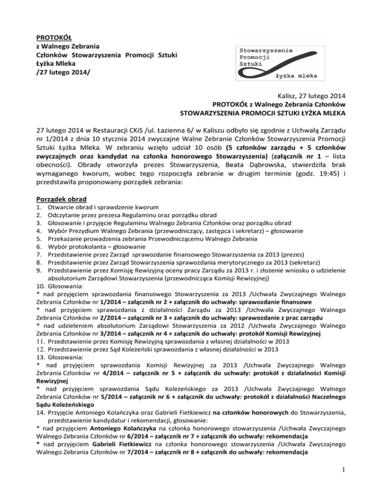 PROTOKÓŁ z Walnego Zebrania Członków Stowarzyszenia Promocji Sztuki Łyżka Mleka /27 lutego 2014/ Kalisz, 27 lutego 2014 PROTOKÓŁ z Walnego Zebrania Członków STOWARZYSZENIA PROMOCJI SZTUKI ŁYŻKA MLEKA 27 lutego 2014 w Restauracji CKiS /ul. Łazienna 6/ w Kaliszu odbyło się zgodnie z Uchwałą Zarządu nr 1/2014 z dnia 10 stycznia 2014 zwyczajne Walne Zebranie Członków Stowarzyszenia Promocji Sztuki Łyżka Mleka. W zebraniu wzięło udział 10 osób (5 członków zarządu + 5 członków zwyczajnych oraz kandydat na członka honorowego Stowarzyszenia) (załącznik nr 1 – lista obecności). Obrady otworzyła prezes Stowarzyszenia, Beata Dąbrowska, stwierdziła brak wymaganego kworum, wobec tego rozpoczęła zebranie w drugim terminie (godz. 19:45) i przedstawiła proponowany porządek zebrania: Porządek obrad 1. 2. 3. 4. 5. 6. 7. 8. 9. Otwarcie obrad i sprawdzenie kworum Odczytanie przez prezesa Regulaminu oraz porządku obrad Głosowanie i przyjęcie Regulaminu Walnego Zebrania Członków oraz porządku obrad Wybór Prezydium Walnego Zebrania (przewodniczący, zastępca i sekretarz) – głosowanie Przekazanie prowadzenia zebrania Przewodniczącemu Walnego Zebrania Wybór protokolanta – głosowanie Przedstawienie przez Zarząd sprawozdanie finansowego Stowarzyszenia za 2013 (prezes) Przedstawienie przez Zarząd Stowarzyszenia sprawozdania merytorycznego za 2013 (sekretarz) Przedstawienie przez Komisję Rewizyjną oceny pracy Zarządu za 2013 r. i złożenie wniosku o udzielenie absolutorium Zarządowi Stowarzyszenia (przewodnicząca Komisji Rewizyjnej) 10. Głosowania: * nad przyjęciem sprawozdania finansowego Stowarzyszenia za 2013 /Uchwała Zwyczajnego Walnego Zebrania Członków nr 1/2014 – załącznik nr 2 + załącznik do uchwały: sprawozdanie finansowe * nad przyjęciem sprawozdania z działalności Zarządu za 2013 /Uchwała Zwyczajnego Walnego Zebrania Członków nr 2/2014 – załącznik nr 3 + załącznik do uchwały: sprawozdanie z prac zarządu * nad udzieleniem absolutorium Zarządowi Stowarzyszenia za 2012 /Uchwała Zwyczajnego Walnego Zebrania Członków nr 3/2014 – załącznik nr 4 + załącznik do uchwały: protokół Komisji Rewizyjnej 11. Przedstawienie przez Komisję Rewizyjną sprawozdania z własnej działalności w 2013 12. Przedstawienie przez Sąd Koleżeński sprawozdania z własnej działalności w 2013 13. Głosowania: * nad przyjęciem sprawozdania Komisji Rewizyjnej za 2013 /Uchwała Zwyczajnego Walnego Zebrania Członków nr 4/2014 – załącznik nr 5 + załącznik do uchwały: protokół z działalności Komisji Rewizyjnej * nad przyjęciem sprawozdania Sądu Koleżeńskiego za 2013 /Uchwała Zwyczajnego Walnego Zebrania Członków nr 5/2014 – załącznik nr 6 + załącznik do uchwały: protokół z działalności Naczelnego Sądu Koleżeńskiego 14. Przyjęcie Antoniego Kolańczyka oraz Gabrieli Fietkiewicz na członków honorowych do Stowarzyszenia, przedstawienie kandydatur i rekomendacji, głosowanie: * nad przyjęciem Antoniego Kolańczyka na członka honorowego stowarzyszenia /Uchwała Zwyczajnego Walnego Zebrania Członków nr 6/2014 – załącznik nr 7 + załącznik do uchwały: rekomendacja * nad przyjęciem Gabrieli Fietkiewicz na członka honorowego stowarzyszenia /Uchwała Zwyczajnego Walnego Zebrania Członków nr 7/2014 – załącznik nr 8 + załącznik do uchwały: rekomendacja 1 15. Przedstawienie przez Zarząd Stowarzyszenia planu działań na 2013. 16. Dyskusja nad planem i propozycje członków stowarzyszenia 17. Głosowanie i przyjęcie uchwały nr 8/2014 o zatwierdzeniu planu działań stowarzyszenia w 2014 załącznik nr 9+ załącznik do uchwały: ramowy plan działań na 2014 rok. 18. Dyskusja nad wysokością składki członkowskiej w roku 2013. 19. Głosowanie i przyjęcie uchwały nr 9/2014 o zatwierdzeniu wysokością składki członkowskiej w 2014 załącznik nr 10 20. Wolne wnioski 21. Zamknięcie zebrania Proponowany porządek zebrania poddano głosowaniu – przyjęto go jednogłośnie. Przebieg zebrania 27 lutego 2014 w Restauracji CKiS /ul. Łazienna 6/ w Kaliszu odbyło się zgodnie z Uchwałą Zarządu nr 1/2014 z dnia 10 stycznia 2014 zwyczajne Walne Zebranie Członków Stowarzyszenia Promocji Sztuki Łyżka Mleka. Obrady otworzyła prezes Stowarzyszenia, Beata Dąbrowska, stwierdziła brak wymaganego kworum, wobec tego rozpoczęła zebranie w drugim terminie (godz. 19:45) i przedstawiła proponowany porządek zebrania: 1. Beata Dąbrowska, powitała zebranych i otworzyła zebranie W zebraniu wzięło udział 10 osób (5 członków zarządu + 5 członków zwyczajnych oraz kandydat na członka honorowego Stowarzyszenia) (załącznik nr 1 – lista obecności). Stwierdziła brak wymaganego kworum, wobec tego rozpoczęła zebranie w drugim terminie (godz. 19:45) 2. Prezes odczytała treść Regulaminu Walnego Zebrania uchwalonego 7 grudnia 2010 /Uchwała Zwyczajnego Walnego Zebrania Członków nr 1/2010 w sprawie przyjęcia Regulaminu Walnego Zebrania., załącznik nr 3 do protokołu z Walnego Zebrania Członków 7.12.2010/ 3. Prezes ogłosiła głosowanie jawne nad przyjęciem Regulaminu Walnego Zebrania. Regulamin przyjęto jednogłośnie. 4. Prezes ogłosiła wybór Prezydium: przewodniczącego, zastępcy i sekretarza Walnego Zebrania. Na przewodniczącego zaproponowano Jerzego Szukalskiego, na zastępcę Magdalenę Krytkowską, na sekretarza Pawła Madaja. Kandydaci wyrazili wolę udziału w pracach prezydium. Głosowanie odbyło się jawnie przez podniesienie rąk. Głosowano łącznie nad wszystkimi kandydatami. Kandydatury zostały przyjęte jednogłośnie. 5. Beata Dąbrowska przekazała przewodniczenie zebrania Jerzemu Szukalskiemu. 6. Przewodniczący Zebrania zaproponował na protokolanta Annę Tabakę. W wyniku głosowania jawnego jednogłośnie wybrano na protokolanta Annę Tabakę. 7. Przewodniczący Zebrania oddał głos Beacie Dąbrowskiej, która w imieniu zarządu przedstawi