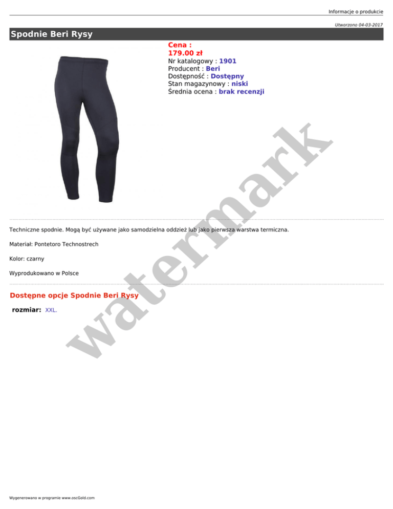 Informacje o produkcie Utworzono 04-03-2017 Spodnie Beri Rysy Cena : 179.00 zł er m ar k Nr katalogowy : 1901 Producent : Beri Dostępność : Dostępny Stan magazynowy : niski Średnia ocena : brak recenzji Techniczne spodnie. Mogą być używane jako samodzielna oddzież lub jako pierwsza warstwa termiczna. Materiał: Pontetoro Technostrech Kolor: czarny Wyprodukowano w Polsce w rozmiar: XXL. at Dostępne opcje Spodnie Beri Rysy Wygenerowano w programie www.oscGold.com