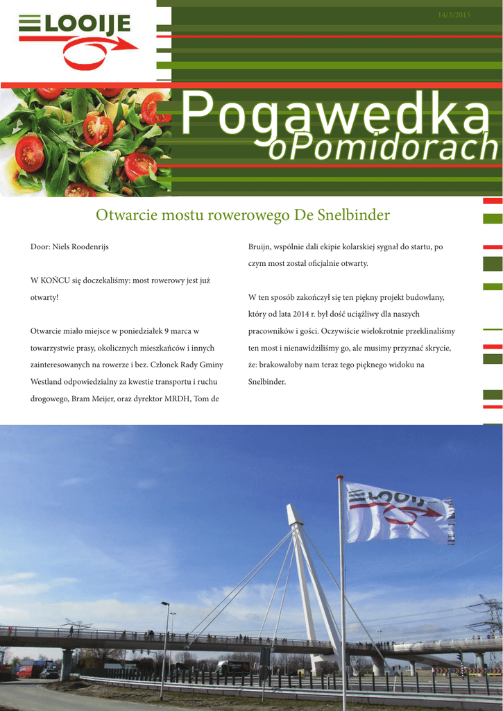 14/3/2015 Otwarcie mostu rowerowego De Snelbinder Door: Niels Roodenrijs Bruijn, wspólnie dali ekipie kolarskiej sygnał do startu, po czym most został oficjalnie otwarty. W KOŃCU się doczekaliśmy: most rowerowy jest już otwarty! W ten sposób zakończył się ten piękny projekt budowlany, który od lata 2014 r. był dość uciążliwy dla naszych Otwarcie miało miejsce w poniedziałek 9 marca w pracowników i gości. Oczywiście wielokrotnie przeklinaliśmy towarzystwie prasy, okolicznych mieszkańców i innych ten most i nienawidziliśmy go, ale musimy przyznać skrycie, zainteresowanych na rowerze i bez. Członek Rady Gminy że: brakowałoby nam teraz tego pięknego widoku na Westland odpowiedzialny za kwestie transportu i ruchu Snelbinder. drogowego, Bram Meijer, oraz dyrektor MRDH, Tom de PROCES NA OKU:Międzysadzenie Nastepne tygodnie sa dla nas bardzo waznym okresem na szklarni.W tym okresie sadzimy nowe planty miedzy te ktore juz wczesniej zostaly posadzone. Nasz specjalista od upraw Ramon Hekesen opowie nam teraz dokladnie w jaki sposob to sie odbywa. W przypadku międzysadzenia sadzimy młode rośliny, kiedy Również dla działu ochrony roślin tygodnie te są pełne starsze są jeszcze w szklarni. Pięć dni przed sadzeniem wyzwań. Jeśli obciążenie szkodnikami starszych roślin przed ogławiamy starsze rośliny, aby nie rosły już na wysokość, międzysadzeniem jest zbyt wysokie, istnieje duże ryzyko, że a następnie obrywamy maksymalnie liście (zostaje do 7 szkodniki szybko rozwiną się na młodej, wrażliwej jeszcze liści), a odległości między haczykami są zacieśniane, aby roślinie. W tygodniach poprzedzających międzysadzenie dopuścić odpowiednią ilość światła do dolnych partii szklarni. poprzez kontrole i, w razie potrzeby, zwalczanie dążymy do Podwieszane są również nowe linki. tego, aby szkodniki i choroby nie miały szans na rozwój. Dzień sadzenia i późniejsze dni są zawsze pełne pracy, nowe Pierwsze trzy tygodnie do momentu, w którym nowa roślina rośliny trzeba bowiem podwiązać do linki i usunąć widoczne wzrasta ponad starszą, są najtrudniejsze. Ponieważ w szklarni pąki pachwinowe, aby zapewnić odpowiednią wytrzymałość znajdują się równocześnie dwie uprawy, roślin jest nieco więcej roślinie i nie dopuścić do rozwoju dodatkowych gałązek. pod względem objętościowym, co utrudnia wszystkie prace. Rośliny kontroluje się także pod kątem uszkodzeń i w Mimo to, ponieważ musimy zapewnić optymalną jakość pracy, razie potrzeby wymienia. Jest to możliwe do dwóch dni od co zawsze jest dla nas bardzo ważną kwestią, czynności, takie momentu posadzenia, ponieważ w innym razie rośliny są już jak uszczykiwanie, podwiązywanie, przycinanie, obrywanie ukorzenione w macie. liści, w tych warunkach zabierają więcej czasu. Wszystko to trzeba robić między pozostałymi standardowymi pracami! Po około 9 tygodniach zbierane są ostatnie grona ze starszych roślin i rośliny te są usuwane. Pozostają same nowe rośliny. Z punktu widzenia technologii upraw po zasadzeniu Dążymy do tego, aby w tym samym tygodniu zbierać ostatnie wyzwaniem jest pozwolenie roślinie na odpowiedni pomidory ze starych roślin i pierwsze pomidory z nowych wzrost i uzyskanie równowagi. Mikroklimat, woda itp. są roślin. W ten sposób nie dochodzi do zastoju produkcji, a dostosowywane w komputerze do potrzeb młodych roślin, nasi klienci mogą cieszyć się nieprzerwanymi dostawami podczas gdy starsze rośliny pozostają w szklarni jeszcze przez pomidorów. 9 tygodni. Fil Filmy na potrzeby KIDK (Kom in de Kas) Door: Niels Roodenrijs W ubiegłych tygodniach mogliście natknąć się gdzieniegdzie na kamerzystę Roberta. Specjalnie na potrzeby wydarzenia Kom in de Kas pracuje on nad stworzeniem kilku filmów o naszej firmie. Filmy te będą pokazywane 30 000 gości, którzy odwiedzą firmę Looije podczas tego wydarzenia. W tej serii filmowej chcemy zaprezentować ludziom, jaką Filmy zaprezentuje była drogę pokonują nasze pomidorki, zanim trafią do sklepu. W gwiazda popularnej holenderskiej opery mydlanej Bas Muijs. związku z tym powstanie film o szklarni, o zużyciu energii Chcesz dostać autograf? Zapisz sobie więc w kalendarzu datę w szklarni, o składowaniu pomidorków, o pakowalni oraz o 21 marca (sobota). Prezenter odwiedzi wtedy firmę Looije w spedycji. Jak widać, to bardzo dużo pracy! związku z nagraniami. W firmie Looije mówi się głównie po niderlandzku, ale wokół siebie słyszymy również wiele innych języków. Słowa podane w poniższej tabeli są często używane w naszej firmie, w szczególności w pakowalni i w naszych szklarniach. Ten słownik pomoże Wam nieco podszlifować swój niderlandzki, polski i angielski. Kto wie, może niebawem będziecie w stanie zwracać się do swoich kolegów w 3 językach. Nederlands Engels Pools Heftruck Forklift truck Wózek widłowy Schoonmaken Clean Sprzątać Loods Warehouse Magazyn Expeditie Shipping Spedycja Opslag Storage Skład Voorraad Stock Zapasy Partij(en) Batch(es) Partia (partie) Oogstdatum Harvest date Data zbioru Productiedag Production date Dzień produkcji Verpakken Pack Pakowanie Kantoor Office Biuro Printen Print Drukowanie Stickers Stickers Naklejki czy wiesz, ze... kas roku wydarzenie „Kom in de tym ...nasza firma będzie gościć w ...przybędzie na nie od 30 000 2015”? do 35 000 gości? sterkowicza w biurze? ...Robbert ma własny kącik maj tworzyć idealny duet Excela? ...Cynthia i Chakir wydają się ic do pracy w szklarniach? ...wciąż poszukujemy uczenn wy Snelbinder? ...9 marca otwarto most rowero rają, bo cały czas biega? ...podeszwy Rona szybko się ście 748 kg produktów? ...w lutym zapakowaliśmy 656 ań? y różnych elementów opakow ...użyliśmy do tego +/- 4 milion z ?...Mervyn dobrze radzi sobie ...Kasia Cichowska kupiła dom niemieckim poczuciem smaku? ...w naszym zakładzie w Burger veen pracuje stażystka