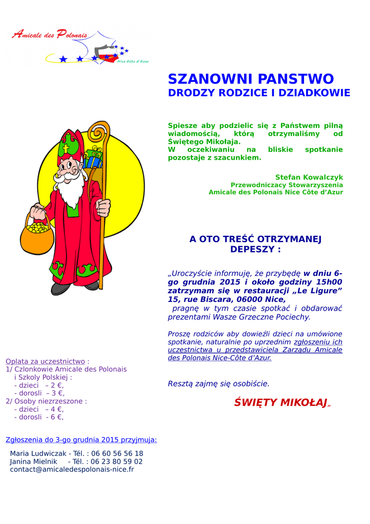 SZANOWNI PANSTWO DRODZY RODZICE I DZIADKOWIE Spiesze aby podzielic się z Państwem pilną wiadomością, którą otrzymaliśmy od Świętego Mikołaja. W oczekiwaniu na bliskie spotkanie pozostaje z szacunkiem. Stefan Kowalczyk Przewodniczacy Stowarzyszenia Amicale des Polonais Nice Côte d’Azur A OTO TREŚĆ OTRZYMANEJ DEPESZY : „Uroczyście informuję, że przybędę w dniu 6go grudnia 2015 i około godziny 15h00 zatrzymam się w restauracji „Le Ligure” 15, rue Biscara, 06000 Nice, pragnę w tym czasie spotkać i obdarować prezentami Wasze Grzeczne Pociechy. Oplata za uczestnictwo : 1/ Czlonkowie Amicale des Polonais i Szkoly Polskiej : - dzieci – 2 €, - dorosli – 3 €, 2/ Osoby niezrzeszone : - dzieci – 4 €, - dorosli - 6 €, Zgłoszenia do 3-go grudnia 2015 przyjmuja: Maria Ludwiczak - Tél. : 06 60 56 56 18 Janina Mielnik - Tél. : 06 23 80 59 02 [email protected] Proszę rodziców aby dowieźli dzieci na umówione spotkanie, naturalnie po uprzednim zgłoszeniu ich uczestnictwa u przedstawiciela Zarządu Amicale des Polonais Nice-Côte d’Azur. Resztą zajmę się osobiście. ŚWIĘTY MIKOŁAJ„