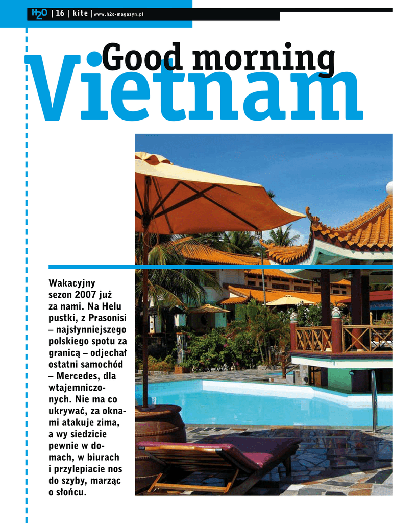 | 16 | kite |www.h2o-magazyn.pl Vietnam Good morning Wakacyjny sezon 2007 już za nami. Na Helu pustki, z Prasonisi – najsłynniejszego polskiego spotu za granicą – odjechał ostatni samochód – Mercedes, dla wtajemniczo nych. Nie ma co ukrywać, za oknami atakuje zima, a wy siedzicie pewnie w do mach, w biurach i przylepiacie nos do szyby, marząc o słońcu. www.h2o-magazyn.pl Wietnam to naprawdę bardzo fajna miejscówka. Ludzie są tu przyjaźni, a poza tym jest stosunkowo tanio. | kite | 17 | Co sprytniejsi zaglądają w oferty biur podróży i szukają: Brazylia, Mauritius, Egipt... a co powiecie na Wietnam, Kraj Południa i pięknych wschodów słońca? Znany głównie z filmów wojennych, takich jak „Czas Apokalipsy” czy „Pluton”, dziś przedstawia się nieco inaczej. Ponad 2000 km zróżnicowanej linii brzegowej pełnej zatok i wysepek, tętniące życiem miasta, tajemnicze świątynie i orientalna kuchnia. To był nasz plan na ten sezon zimowy. Chcieliśmy robić to, co najbardziej kochamy, łapać fale i latać na kite’cie. Pomysł na Wietnam narodził się w mojej głowie już parę lat temu, gdy pewna młoda Rosjanka przyjechała z tego kraju koleją transsyberyjską do Polski na kurs IKO. Popytaliśmy, gdzie trzeba, przewertowaliśmy Internet, znaleźliśmy pracę w jednej ze szkółek w Mui Ne i już trzy tygodnie po powrocie z Helu siedzieliśmy w samolocie do HCMC. HCMC, czyli Sajgon, to największe miasto Wietnamu. Tam też wylądował nasz samolot lecący na trasie z Warszawy przez Frankfurt. Po ponad 20 godzinach podróży, podekscytowani wysiedliśmy z samolotu i podążyliśmy korytarzami lotniska. Bez problemu przeszliśmy odprawę i odebraliśmy nasze bagaże. Na lotnisku, w specjalnie wydzielonym do tego miejscu, zamówiliśmy taksówkę. Sajgońscy taksówkarze to bardzo uczciwi i pomocni ludzie, za kurs płacisz z góry ustaloną cenę 5 dol., a oni zawożą cię tam, gdzie potrzeba. Nasz taksówkarz z uśmiechem na ustach zapakował 40 kg quiver do luksusowej Toyoty i usadził nas na tylnym siedzeniu. Nie ma nic nieprawdziwego w potocznym znaczeniu słowa Sajgon – to, co spotkało nas na ulicach HCMC, było istnym Sajgonem. Gdy tylko wyjechaliśmy z terenu lotniska, zewsząd otoczyła nas masa skuterów i rowerów. To nawet nie była masa, po prostu zalała nas fala jednośladów. W samym mieście żyje 6 milionów ludzi i większość z nich korzysta z tego właśnie środka lokomocji. Sajgon podzielony jest na 12 dzielnic, a tylko pięć z nich znajdujących się w centrum nosi nazwy. Udaliśmy się do Dong Khoi – dzielnicy typowo turystycznej, gdzie po przyjeździe można za dosłownie parę dolarów znaleźć pokój z klimatyzacją. Druga tego typu dzielnica, Pham Ngu Lao, jest bardziej ekskluzywna, a co za tym idzie – droższa. Tu na wybrednych turystów czekają 5-gwiazdkowe hotele. Nasz hotel był 6-piętrowym budynkiem wtłoczonym swoją wąską fasadą w inne mu podobne budowle. Zameldowano nas na 4. piętrze. Zapakowaliśmy się we dwoje do niedużej windy, a uprzejmi Wietnamczycy podali nam nasze bagaże. Niestety, mała winda nie chciała być już dla nas tak miła i postanowiła, że zatrzyma się między piętrami. Okazaliśmy się dużo za ciężcy – wysiadł prąd, w ciemnościach słychać było tylko tupot stóp na schodach... Zwiedzanie Sajgonu na szczęście odbyło się już bez takich przygód. Nauczyliśmy się poruszać między falami skuterów i rowerów. Nasze kroki | 18 | kite |www.h2o-magazyn.pl W październiku i listopadzie możemy oczekiwać wiatru raczej do 18 węzłów w środku dnia i umiarkowanych fal foto: Adam i Dorota Borys skierowaliśmy na targ, popularne miejsce wśród turystów, gdzie za kilka dolarów można kupić kilogramy suszonych krewetek i nie tylko. Znajdują się tu również stragany z niezupełnie oryginalną odzieżą, stoiska z pamiątkami, takimi jak popularne w Wietnamie stożkowe, słomiane kapelusze, oraz miniknajpki. Jeszcze tego samego dnia wsiedliśmy do autobusu i odjechaliśmy na południe do oddalonego o 200 km od Sajgonu Mui Ne. Mui Ne – czyli Przylądek Schronienia. Jeszcze pięć lat temu stał tu jeden hotel, a siedem lat wstecz nie było nawet prądu. Etienne Wan Do, współwłaściciel Windchimes, jednej z pięciu miejscowych szkółek, po raz pierwszy przyjechał tutaj w 2001 r. Jak sam wspomina, istniała tu wtedy jedna szkółka proponująca do wyboru dwie deski i kilka żagli. Teraz jest to jeden z najbardziej popularnych spotów w tej części kontynentu. Plaże Mui Ne ciągną się na długości 20 kilometrów. Szerokie, z jasnym piaskiem, ocienione palmami. Zagląda tu wielu Wietnamczyków, Europejczyków oraz Rosjan. Sezon trwa od listopada do kwietnia. Temperatura powietrza to 28 stopni niezmiennie każdego dnia, cieplutka woda, a wiatr wieje codziennie już od rana. Warunki wiatrowe w dużej mierze zależą od pory roku. W październiku i listopadzie możemy oczekiwać wiatru raczej do 18 węzłów w środku dnia i umiarkowanych fal. Grudzień i początek www.h2o-magazyn.pl | kite | 19 | stycznia jest okresem, kiedy wieje najmocniej i zarazem mamy największe fale, zarówno wiatrowe, jak i oceaniczne, czyli tzw. Swell. To też idealny okres na surfing. Od połowy stycznia fale zaczynają zanikać. Wieje regularnie 18–25 węzłów. Na przełomie marca i kwietnia wiatr zaczyna słabnąć. Niezależnie od miesiąca działa on tutaj na zasadzie termiki. Rano będzie słabszy, by wzrastać stopniowo do maksimum ok. 15 po południu, po czym słabnie. Jak w takim razie dobrać latawiec? Jeśli będziemy chcieli pływać cały dzień, potrzebujemy latawce z zakresu 8–12 m. Jednakże zabierając tylko 12-metrowego kite’a, będziemy w stanie popływać kilka godzin każdego dnia. Jeżeli znudzi nam się już spot, możemy wynająć jeepa zakupu prawdziwego zabytku – Hondy 67. To cacko o pojemności 50 cm3 i 4 biegach służy nam dzielnie w codziennych pod
