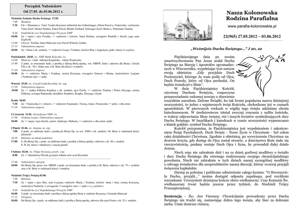 Porządek Nabożeństw Od 27.05. do 03.06.2012 r. Niedziela Zesłanie Ducha Świętego 27.05. 7:00 Różaniec 7:30 Für + Ehemann u. Vater Teodor Kosytorz anlässlich des Geburtstages, Eltern Paweł u. Franciszka, vermissten Vater Józef, Mutter Paulina, Enkel Paweł, Bruder Gerhard, Schwager Józef, Beata u. Patentante Paulina 9:30 10:00 15:00 17:15 18:00 Godzinki ku czci Niepokalanego Poczęcia NMP Za + męża i ojca Ewalda, ++ rodziców i teściów, brata Stefana, szwagrów Rudolfa i Józefa, jego syna Zygfryda Chrzest: Paulina Anna Mańczyk oraz Paweł Walenty Garbas Nabożeństwo majowe Za + brata z ok. urodzin, ++ rodziców Łucję i Teodora, teściów Ritę i Augustyna, pokr i dusze w czyśćcu Poniedziałek 28.05. św. NMP Matki Kościoła, św. 13:00 Msza św. i ślub: Adriana Krupińska - Adam Woźniczka 15:00 Z podz. za otrzymane łaski, z prośbą o dalszą Bożą opiekę, wst. MBNP, łaski i zdrowie dla Beaty i Józefa Fila z ok.. 50 r. ślubu oraz o bł. Boże dla dzieci i wnuków 17:30 Nabożeństwo majowe 18:00 Za ++ rodziców Marię i Teodora, siostrę Krystynę, szwagrów Ernesta i Ottona, siostrzeńców Lucjana i Norberta oraz ++ pokr. Wtorek 29.05. św. Urszuli Ledóchowskiej, dz. wsp. 17:30 Nabożeństwo majowe 18:00 Za ++ matkę Elżbietę Kandora z ok. urodzin, ojca Pawła, ++ rodziców Paulinę i Piotra Drzyzga, siostrę Elżbietę, szwagra Rajmunda, dziadków Kandora, Krupka, Drzyzga i Zyzik Środa 30.05. 7:30 Za + Franciszkę 2 r. śmierci, ++ rodziców Emanuela i Teresę, Annę i Franciszka ++ pokr. z obu stron 17:30 Nabożeństwo majowe I Czwartek 31.05. Nawiedzenie NMP, św, 17:00 Godzina święta i Nabożeństwo majowe 18:00 Za ++ męża i ojca Józefa, synów Andrzeja i Huberta, ++ rodziców z obu stron i pokr. I Piątek 01.06. św. Justyna, m. wsp. 7:00 Z podz. za odebrane łaski z prośbą do Bożej Op. za wst. NSM z ok. urodzin i bł. Boże w rodzinach dzieci (deutsch) 16:30 Różaniec za młode pokolenie 17:00 1. Do Bożej Op. z podz. za odebrane łaski z prośbą o dalszą opiekę i zdrowie z ok. 86 r. urodzin 2. W int. dzieci i młodzieży z naszej parafii I Sobota 02.06. św. Filipa Nereusza, prezb., wsp. 8:00 Za ++ Stanisławę Olczak jej męża Adama oraz syna Ryszarda 17:00 18:00 Nabożeństwo maryjne Do Bożej Op. przez wst. MBNP z podz. za otrzymane łaski, z prośbą o bł. Boże, zdrowie z ok. 75 r. urodzin oraz o bł. Boże w rodzinach dzieci i wnuków Niedziela Trójcy Świętej 03.06. 7:00 Różaniec 7:30 Za + męża i ojca Otto, syna Lucjana, rodziców Marię i Teodora, teśćiów Annę i Jana, siostrę Krystynę, siostrzeńca Norberta, 2 szwagierki, 5 szwagrów oraz ++ pokr.( w j. polskim ) 9:30 10:00 17:15 18:00 Godzinki ku czci Niepokalanego Poczęcia NMP Z podz. za otrzymane łaski z prośbą o dalszą opiekę Bożą w rodzinie Krystyny i Gerarda Mańczyk Nieszpory Do Bożej Op. z podz. za odebrane łaski z prośbą o Bożą opiekę, zdrowie dla syna Piotra z ok. 52 r. urodzin Nasza Kolonowska Rodzina Parafialna www.parafia-kolonowskie.pl 22(965) 27.05.2012 – 03.06.2012 „Weźmijcie Ducha Świętego…” J 20, 22 Pięćdziesiątego dnia po swoim zmartwychwstaniu Pan Jezus zesłał Ducha Świętego na Maryję i Apostołów zgromadzonych w Wieczerniku, wypełniając tym samym swoją obietnicę: „Gdy przyjdzie Duch Pocieszyciel, którego Ja wam poślę od Ojca, Duch Prawdy, który od Ojca pochodzi, On będzie świadczył o Mnie”. W dniu Pięćdziesiątnicy Kościół, ożywiony Duchem Świętym, rozpoczyna przepowiadanie radosnej nowiny o zbawieniu wszystkim narodom. Zielone Świątki, bo tak brzmi popularna nazwa dzisiejszej uroczystości, to jedno z najstarszych świąt Kościoła, obchodzone już w czasach apostolskich. W pierwszych wiekach w wigilię tego święta udzielano chrztu katechumenom. W średniowieczu istniał zwyczaj rzucania z sufitu kościoła, w trakcie odprawiania Mszy świętej, róż i innych kwiatów symbolizujących dary Ducha Świętego. W bazylikach i katedrach w czasie uroczystości wypuszczano z klatek gołębie: symbol Ducha Świętego. Kościół przypomina, że Pięćdziesiątnica jest wypełnieniem i zakończeniem Świąt Paschalnych. Duch Święty - Nowe Życie w Chrystusie - był celem całej działalności Chrystusa. Zgodnie z obietnicą, po wywyższeniu Chrystusa na drzewie krzyża, gdy dostęp do Ojca został otwarty, a dziecięctwo Boże stało się rzeczywistością, posłany zostaje Duch Ojca i Syna, by prowadził dalej dzieło Jezusa. Niech więc nie zabraknie dziś i na co dzień gorliwej modlitwy o światło i dary Ducha Świętego dla wiernego realizowania swojego chrześcijańskiego powołania. Niech nie zabraknie w tych dniach naszej szczególnej modlitwy o odwagę świadectwa dla neoprezbiterów naszej diecezji, którzy wczoraj przyjęli święcenia kapłańskie. Dzisiaj za pobożne i publiczne odmówienie całego hymnu: "O Stworzycielu Duchu, przyjdź...” można dostąpić odpustu zupełnego, pod zwykłymi warunkami. Uroczystość dzisiejsza kończy okres wielkanocny. Czas Komunii Św. wielkanocnej trwać będzie jeszcze przez tydzień, do Niedzieli Trójcy Przenajświętszej. Sentencja - Św. Jan Vianney: Chrześcijanin prowadzony przez Ducha Świętego nie trudzi się, zostawiając dobra tego świata, aby biec za dobrami nieba. Umie dostrzec różnicę. 22/2012 Bractwo św. Józefa zostało erygowane 1 maja w Jemielnicy. Jeśli mężczyzna, po 18 roku życia chce zapisać się i należeć do Bractwa, to w naszej kancelarii parafialnej do 20 czerwca, można otrzymać deklarację. Zobowiązania członków Bractwa św. Józefa: podejmowanie nieustannej wewnętrznej pracy nad sobą codzienna modlitwa (w wyznaczonym dniu roku kalendarzowego) w intencji rodzin w ogóle, a w szczególności rodzin zagrożonych rozbiciem oraz osób chorych i konających częste przystępowanie do sakramentu pokuty i pojednania chętne uczestnictwo w życiu parafii i zaangażowanie społeczne świadczenie 