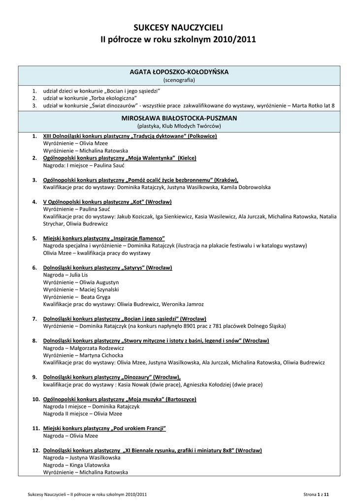 SUKCESY NAUCZYCIELI II półrocze w roku szkolnym 2010/2011 AGATA ŁOPOSZKO-KOŁODYOSKA (scenografia) 1. 2. 3. udział dzieci w konkursie „Bocian i jego sąsiedzi” udział w konkursie „Torba ekologiczna” udział w konkursie „Świat dinozaurów” - wszystkie prace zakwalifikowane do wystawy, wyróżnienie – Marta Rotko lat 8 MIROSŁAWA BIAŁOSTOCKA-PUSZMAN (plastyka, Klub Młodych Twórców) 1. 2. XIII Dolnośląski konkurs plastyczny „Tradycją dyktowane” (Polkowice) Wyróżnienie – Olivia Mzee Wyróżnienie – Michalina Ratowska Ogólnopolski konkurs plastyczny „Moja Walentynka” (Kielce) Nagroda: I miejsce – Paulina Saud 3. Ogólnopolski konkurs plastyczny „Pomóż ocalid życie bezbronnemu” (Kraków), Kwalifikacje prac do wystawy: Dominika Ratajczyk, Justyna Wasilkowska, Kamila Dobrowolska 4. V Ogólnopolski konkurs plastyczny „Kot” (Wrocław) Wyróżnienie – Paulina Saud Kwalifikacje prac do wystawy: Jakub Koziczak, Iga Sienkiewicz, Kasia Wasilewicz, Ala Jurczak, Michalina Ratowska, Natalia Strychar, Oliwia Budrewicz 5. Miejski konkurs plastyczny „Inspiracje flamenco” Nagroda specjalna i wyróżnienie – Dominika Ratajczyk (ilustracja na plakacie festiwalu i w katalogu wystawy) Olivia Mzee – kwalifikacja pracy do wystawy 6. Dolnośląski konkurs plastyczny „Satyrys” (Wrocław) Nagroda – Julia Lis Wyróżnienie – Oliwia Augustyn Wyróżnienie – Maciej Szynalski Wyróżnienie – Beata Gryga Kwalifikacje prac do wystawy: Oliwia Budrewicz, Weronika Jamroz 7. Dolnośląski konkurs plastyczny „Bocian i jego sąsiedzi” (Wrocław) Wyróżnienie – Dominika Ratajczyk (na konkurs napłynęło 8901 prac z 781 placówek Dolnego Śląska) 8. Dolnośląski konkurs plastyczny „Stwory mityczne i istoty z baśni, legend i snów” (Wrocław) Nagroda – Małgorzata Rodzewicz Wyróżnienie – Martyna Cichocka Kwalifikacje prac do wystawy: Olivia Mzee, Justyna Wasilkowska, Ala Jurczak, Michalina Ratowska, Oliwia Budrewicz 9. Dolnośląski konkurs plastyczny „Dinozaury” (Wrocław), kwalifikacje prac do wystawy : Kasia Nowak (dwie prace), Agnieszka Kołodziej (dwie prace) 10. Ogólnopolski konkurs plastyczny „Moja muzyka” (Bartoszyce) Nagroda I miejsce – Dominika Ratajczyk Nagroda II miejsce – Olivia Mzee 11. Miejski konkurs plastyczny „Pod urokiem Francji” Nagroda – Olivia Mzee 12. Dolnośląski konkurs plastyczny „XI Biennale rysunku, grafiki i miniatury 8x8” (Wrocław) Nagroda – Justyna Wasilkowska Nagroda – Kinga Ulatowska Wyróżnienie – Michalina Ratowska Sukcesy Nauczycieli – II półrocze w roku szkolnym 2010/2011 Strona 1 z 11 Wyróżnienie – Dominika Ratajczyk Kwalifikacje prac do wystawy: Kamila Dobrowolska (2 prace), Oliwia Budrewicz (5 prac), Martyna Cichocka (3 prace), Ala Jurczak (5 prac), Dominika Ratajczyk (8 prac), Justyna Wasilkowska (3 prace), Kinga Ulatowska (3 prace), Michalina Ratowska (3 prace) 13. Ogólnopolski konkurs plastyczny „Świętokrzyski czar” Michalina Ratowska – wyróżnienie 14. Miejski konkurs plastyczny „Dobre strony” (Wrocław) Wyróżnienie – Klaudia Marusarz Wyróżnienie – Oliwia Mzee Wyróżnienie – Dawid Banach 15. Miejski konkurs plastyczny „Moja super rodzina” (Wrocław) Wyróżnienie: Dawid Banach, Oliwia Budrewicz, Iga Sienkiewicz, Weronika Jamroz, Małgorzata Rodziewicz W oczekiwaniu na rozstrzygnięcie konkursu; Międzynarodowy konkurs plastyczny „Mój region w Europie” ŁĄCZNIE 29 LAUREATÓW NAGRÓD I WYRÓŻNIEO ORAZ 55 KWALIFIKACJI PRAC DO WYSTAW W 14 KONKURSACH O ZASIĘGU MIEJSKIM, WOJEWÓDZKIM I OGÓLNOPOLSKIM. JACEK CHOMIAK (sekcja pływacka) 1. 2. 3. 4. 5. 6. 7. 8. 01/03 Liga klas VI-II edycja 05/04 Liga klas VI III edycja 06/04 Memoriał Romana Chomiaka 13/05 Liga klas V- III edycja 14-15/05 Zawody z okazji Dnia Olimpijczyka 20/05 Wrocławska Olimpiada Młodzieży 03/06 Liga klas V- IV edycja 09/06 Liga klas VI- IV edycja Wszyscy nasi zawodnicy biorący udział w powyższych zawodach uzyskali rekordy życiowe oraz wiele czołowych miejsc na podium. Na wyróżnienie zasługują Katarzyna Miernikiewicz, Liliana Szurlej, Laura Bartnicka, Aleksandra Miernikiewicz, Dominik Sobótka, JUSTYNA DORLET (judo) 1. 19.03.2011- „I Mistrzostwa "Zabawa z Judo" Święta Katarzyna ( udział i organizacja). - 23 medale (Im x5, II m x10, III m x8). 2. 09.04.2011 – „Mistrzostwa Dolnego Śląska Młodzików i Młodziczek” Sobótka (udział) - II m – Barbara Mendruo - III m – Oskar Szymaoski 3. 07.05.2011- „4. Wrocławska Olimpiada Młodzieży” (udział) -I m- Mendruo Barbara, - II m- Jaworowski Jakub, - III m- Szymaoski Oskar, - III m- Kordyalik Wojciech, - III m- Selezniow Konrad, - V m- Tomasiewicz Damian. 4. 12.05.2011 - „Turniej Judo Dzieci” Wrocław (SP NR 3 ul. Bobrza) (udział i organizacja). - I m x 8, II m x 5, III m x 7 5. 21.05.2011 - XIII Turniej O Puchar Prezydenta Miasta Nowa Sól (udział) - II m-Barbara Mendruo, - V m- Kamil Skowron, - V Jakub Jaworowski Sukcesy Nauczycieli – II półrocze w roku szkolnym 2010/2011 Strona 2 z 11 Agnieszka Gębicka (grafika warsztatowa) Udział w konkursach: 1. udział w ogólnopolskim konkursie „Kot”/organizator: Zespół 'Centrum Edukacji Kulturalnej Dzieci i Młodzieży' - udział prac wysłanych w wystawie 2. Dolnośląski Konkurs Plastyczny 'Tradycją dyktowane'/ organizator: MDK Polkowice - wyróżnienie: Julia Sieraoska 3. udział w konkursie 'Stwory mityczne'/ organizator: MDK Śródmieście - wyróżnienie: Hania Grześkowiak - udział prac wysłanych w wystawie 4. udział w konkursie 'Bocian i jego sąsiedzi'/ organizator: Polskie Towarzystwo Przyjaciół Przyrody 'Pro – Natura’ Wrocław - wyróżnienie: Olga Grześkowiak 5. udział w konkursie 'Przyroda w kolorach'/ organizator MDK Kraków - udział prac w wystawie: Marta Jakubowska, Julia Kunysz 6. udział w konkursie 'Ekologiczny samochód marzeo'/ organizator: MCK Legnica - wyróżnienie: Milena Wróbel 7. XI W