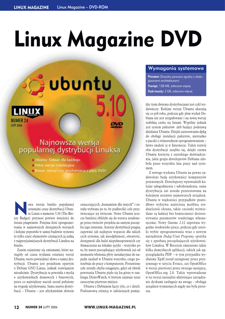 LINUX MAGAZINE Linux Magazine – DVD-ROM Linux Magazine DVD Wymagania systemowe Procesor: Dowolny procesor zgodny z obsługiwanymi architekturami. Pamięć: 128 MB, zalecane więcej Dysk twardy: 2 GB, zalecane więcej N owa wersja bardzo popularnej ostatnimi czasy dystrybucji Ubuntu Linux o numerze 5.10 (The Breezy Badger) przynosi powiew świeżości do świata pingwinów. Potężna ilość oprogramowania w najnowszych dostępnych wersjach i kolejne poprawki w samej budowie systemu to tylko część elementów czyniących ją jedną z najprzyjaźniejszych dystrybucji Linuksa na biurko. Zanim zajmiemy się zmianami, które nastąpiły od czasu wydania ostatniej wersji Ubuntu, warto powiedzieć słowo o samej dystrybucji. Ubuntu jest projektem opartym o Debian GNU/Linux, jednak rozwijanym niezależnie. Dystrybucja ta powstała z myślą o użytkownikach domowych i biurowych, przez co największy nacisk został położony na wygodę użytkowania. Sama nazwa dystrybucji – Ubuntu – jest afrykańskim słowem 12 NUMER 24 LUTY 2006 oznaczających „humanizm dla innych” i została wybrana po to, by podkreślić cele przyświecające jej twórcom. Nowe Ubuntu jeszcze bardziej zbliżyło się do wzorca ustalonego przez twórców projektu na samym początku jego istnienia. Autorzy dystrybucji pragną zapewnić jak najlepsze wsparcie dla takich cech systemu, jak nieodpłatność, otwartość, dostępność dla ludzi niepełnosprawnych czy tłumaczenia na lokalne języki – wszystko po to, by nawet początkujący użytkownik już od momentu włożenia płyty instalacyjnej do napędu znalazł w Ubuntu wszystko, czego potrzebuje do pracy z komputerem. Postawione cele zostały chyba osiągnięte, gdyż od chwili powstania Ubuntu pięło się ku górze w rankingu DistroWatch, w którym zajmuje teraz zaszczytne pierwsze miejsce. Ubuntu z Debianem łączy tyle, co i dzieli. Podstawową różnicą w założeniach pomię- WWW.LINUX-MAGAZINE.PL dzy tymi dwiema dystrybucjami jest cykl wydawniczy. Kolejne wersje Ubuntu ukazują się co pół roku, podczas gdy plan wydań Debiana nie jest uregulowany i na nową wersję stabilną czeka się latami. Wspólny jednak jest system pakietów .deb będący podstawą działania Ubuntu. Dzięki zastosowaniu dpkg do obsługi instalacji pakietów, nietrudno o paczki z różnorodnym oprogramowaniem – łatwo znaleźć je w Internecie. Także rozwój obu dystrybucji zazębia się, dzięki czemu Ubuntu korzysta z szerokiego doświadczenia, jakie grupa deweloperów Debiana zdobyła przez wszystkie lata pracy nad systemem. Z nowego wydania Ubuntu na pewno zadowoleni będą użytkownicy komputerów przenośnych. Deweloperzy wprowadzili kolejne udogodnienia i udoskonalenia, sama dystrybucja zaś została przetestowana na kolejnym zestawie najnowszych urządzeń. Ubuntu w większości przypadków prawidłowo wykrywa najwyższą możliwą rozdzielczość ekranu, także czcionki wyświetlane są ładniej bez konieczności dostosowywania parametrów renderingu własnoręcznie. Nowy Gnome 2.12 zapewnia wygodne środowisko pracy, podczas gdy szeroki wybór oprogramowania wraz z nowym narzędziem Dodaj/Usuń Programy spotyka się z aprobatą początkujących użytkowników Linuksa. W Breezym zmieniono także kilka domyślnych aplikacji, takich jak np. przeglądarka PDF – w tym przypadku wysłużony Xpdf został zastąpiony przez przyjemnego w użyciu Evince, zaś OpenOffice w wersji pierwszej przez swojego następcę, OpenOffice.org 2.0. Także wprowadzone w tej wersji narzędzie ułatwiające zarządzanie dyskami zasługuje na uwagę – obsługa urządzeń wymiennych nigdy nie była prostsza. Linux Magazine – DVD-ROM Biurko Ubuntu zaraz po instalacji systemu Podsumowanie Większość zmian wprowadzonych w nowej wersji Ubuntu nie należy do gatunku tych, które nazywamy rewolucyjnymi. Znajdziemy wiele poprawek błędów, udogodnień, zmian i ulepszeń – większość z nich szybko zauważymy w codziennej pracy. Dystrybucja od pierwszych kliknięć sprawia wrażenie dopracowanej i przemyślanej w swojej LINUX MAGAZINE Nowe narzędzie zarządzania oprogramowa- OpenOffice, kompletne biuro w domu – niem – czyż nie jest proste? w Ubuntu w najnowszej wersji prostocie. Właśnie tego nowicjusz oczekuje od systemu, którego nie zna. Warto jednak zaznaczyć, że Ubuntu równie dobrze jak na biurku sprawdza się w zastosowaniach serwerowych. Przecząc zasadzie „jeżeli coś jest do wszystkiego, to jest do niczego” Ubuntu jest wyborem wartym rozważenia niezależnie od zastosowań, w których chcemy skorzystać z dobrodziejstw Linuksa. Na płycie DVD dołączonej do czasopisma zamieściliśmy najnowsze Ubuntu w wersji instalacyjnej, oraz – jako dodatek – również w wersji Live. Oznacza to, że używając jednej płyty, możemy najpierw wypróbować Ubuntu nie wykonując żadnych operacji na dysku twardym, a następnie – jeśli dystrybucja się nam spodoba – zainstalować go. ■ WWW.LINUX-MAGAZINE.PL NUMER 24 LUTY 2006 13