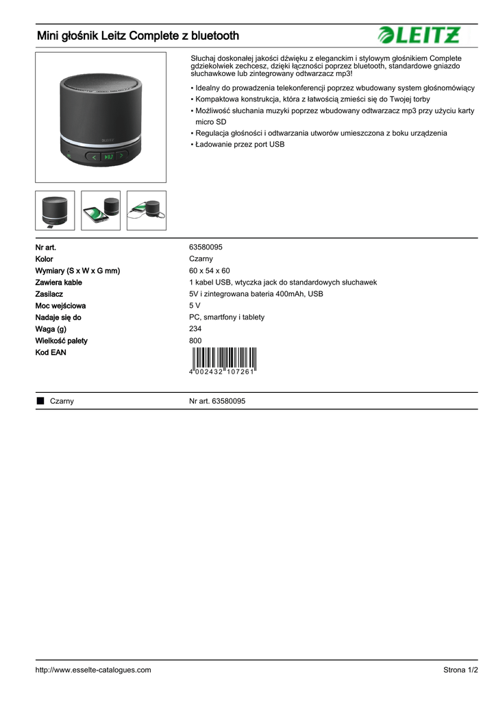 Mini głośnik Leitz Complete z bluetooth Słuchaj doskonałej jakości dźwięku z eleganckim i stylowym głośnikiem Complete gdziekolwiek zechcesz, dzięki łączności poprzez bluetooth, standardowe gniazdo słuchawkowe lub zintegrowany odtwarzacz mp3! ▪ Idealny do prowadzenia telekonferencji poprzez wbudowany system głośnomówiący ▪ Kompaktowa konstrukcja, która z łatwością zmieści się do Twojej torby ▪ Możliwość słuchania muzyki poprzez wbudowany odtwarzacz mp3 przy użyciu karty micro SD ▪ Regulacja głośności i odtwarzania utworów umieszczona z boku urządzenia ▪ Ładowanie przez port USB Nr art. 63580095 Kolor Czarny Wymiary (S x W x G mm) 60 x 54 x 60 Zawiera kable 1 kabel USB, wtyczka jack do standardowych słuchawek Zasilacz 5V i zintegrowana bateria 400mAh, USB Moc wejściowa 5V Nadaje się do PC, smartfony i tablety Waga (g) 234 Wielkość palety 800 Kod EAN 4 002432 107261 Czarny http://www.esselte-catalogues.com Nr art. 63580095 Strona 1/2 http://www.esselte-catalogues.com Strona 2/2