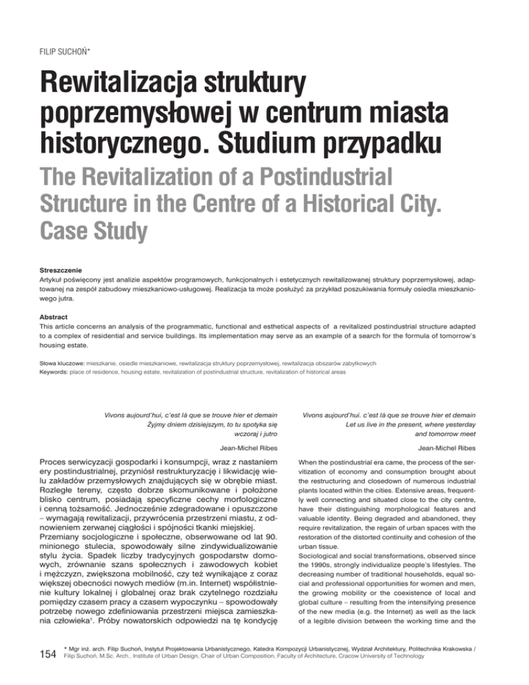 FILIP SUCHOŃ* Rewitalizacja struktury poprzemysłowej w centrum miasta historycznego. Studium przypadku The Revitalization of a Postindustrial Structure in the Centre of a Historical City. Case Study Streszczenie Artykuł poświęcony jest analizie aspektów programowych, funkcjonalnych i estetycznych rewitalizowanej struktury poprzemysłowej, adaptowanej na zespół zabudowy mieszkaniowo-usługowej. Realizacja ta może posłużyć za przykład poszukiwania formuły osiedla mieszkaniowego jutra. Abstract This article concerns an analysis of the programmatic, functional and esthetical aspects of a revitalized postindustrial structure adapted to a complex of residential and service buildings. Its implementation may serve as an example of a search for the formula of tomorrow’s housing estate. Słowa kluczowe: mieszkanie, osiedle mieszkaniowe, rewitalizacja struktury poprzemysłowej, rewitalizacja obszarów zabytkowych Keywords: place of residence, housing estate, revitalization of postindustrial structure, revitalization of historical areas Vivons aujourd’hui, c’est là que se trouve hier et demain Żyjmy dniem dzisiejszym, to tu spotyka się wczoraj i jutro Vivons aujourd’hui. c’est là que se trouve hier et demain Let us live in the present, where yesterday and tomorrow meet Jean-Michel Ribes Jean-Michel Ribes Proces serwicyzacji gospodarki i konsumpcji, wraz z nastaniem ery postindustrialnej, przyniósł restrukturyzację i likwidację wielu zakładów przemysłowych znajdujących się w obrębie miast. Rozległe tereny, często dobrze skomunikowane i położone blisko centrum, posiadają specyficzne cechy morfologiczne i cenną tożsamość. Jednocześnie zdegradowane i opuszczone – wymagają rewitalizacji, przywrócenia przestrzeni miastu, z odnowieniem zerwanej ciągłości i spójności tkanki miejskiej. Przemiany socjologiczne i społeczne, obserwowane od lat 90. minionego stulecia, spowodowały silne zindywidualizowanie stylu życia. Spadek liczby tradycyjnych gospodarstw domowych, zrównanie szans społecznych i zawodowych kobiet i mężczyzn, zwiększona mobilność, czy też wynikające z coraz większej obecności nowych mediów (m.in. Internet) współistnienie kultury lokalnej i globalnej oraz brak czytelnego rozdziału pomiędzy czasem pracy a czasem wypoczynku – spowodowały potrzebę nowego zdefiniowania przestrzeni miejsca zamieszkania człowieka1. Próby nowatorskich odpowiedzi na tę kondycję When the postindustrial era came, the process of the servitization of economy and consumption brought about the restructuring and closedown of numerous industrial plants located within the cities. Extensive areas, frequently well connecting and situated close to the city centre, have their distinguishing morphological features and valuable identity. Being degraded and abandoned, they require revitalization, the regain of urban spaces with the restoration of the distorted continuity and cohesion of the urban tissue. Sociological and social transformations, observed since the 1990s, strongly individualize people’s lifestyles. The decreasing number of traditional households, equal social and professional opportunities for women and men, the growing mobility or the coexistence of local and global culture – resulting from the intensifying presence of the new media (e.g. the Internet) as well as the lack of a legible division between the working time and the 154 * Mgr inż. arch. Filip Suchoń, Instytut Projektowania Urbanistycznego, Katedra Kompozycji Urbanistycznej, Wydział Architektury, Politechnika Krakowska / Filip Suchoń, M.Sc. Arch., Institute of Urban Design, Chair of Urban Composition, Faculty of Architecture, Cracow University of Technology społeczeństwa i jednostki, z którymi można się spotkać obecnie są widoczne – architektura jest bardziej otwarta i elastyczna, nie narzuca programu, a jedynie tworzy dla niego ramy, gdyż odpowiedź na bieżące i przyszłe zapotrzebowanie może być rozmaita, a przy tym trudna do przewidzenia2. Odchodzi się również od dużych, homogenicznych zespołów na rzecz struktur mniejszych, posiadających natomiast własną odrębność i tożsamość3. Zerwanie z konwencjami i erupcja swobody wywołuje zarazem tęsknotę za dawnym porządkiem i tradycyjnymi modelami życia, stąd również powroty budynków będących świadomymi imitacjami stylistycznych trendów z przeszłości4. Migracja mieszkańców ze stref podmiejskich do centrów miast staje się nobilitującym trendem wobec wciąż jeszcze silnej eksurbanizacji (ang. urban sprawl). Za przykład inwestycji, wymagającej od projektanta równoczesnego wzięcia pod uwagę problematyki rewitalizacji poprzemysłowego terenu w centrum miasta historycznego i problematyki tworzenia posiadającego własną tożsamość środowiska zamieszkania, posłużyć może obecnie realizowana budowa zespołu zabudowy mieszkaniowo-usługowej na terenie dawnego Browaru Goetzów przy ul. Lubicz w Krakowie5. Dawne przedmieście Wesoła i wchodząca w jego skład jurydyka Lubicz zostały przyłączone do Krakowa w 1800 r. W latach 1844–1847 w niedalekim sąsiedztwie powstała linia kolejowa i dworzec, co miało niebagatelny wpływ na wzrost atrakcyjności tych terenów. Browar u zbiegu ul. Lubicz i dzisiejszej ul. Strzeleckiej został zbudowany w roku 1840, stopniowo modernizowany i rozbudowywany w kolejnych latach, funkcjonował ze zmiennym szczęściem aż do schyłku lat 90. XX wieku. W roku 1995 najcenniejsze elementy zespołu zostały objęte ochroną konserwatorską6. Niestety, po zaprzestaniu działalności browaru nieużytkowane i nieogrzewane, opustoszałe zabudowania ulegały postępującej degradacji. Do niedawna obszar „Browar Lubicz” był opuszczonym terenem postindustrialnym, porośniętym dzikimi samosiewami drzew i krzewów. Na terenie zespołu znajdowały się zarówno obiekty zabytkowe – obiekty przedstawiające wysoką kulturową wartość historyczno-arch