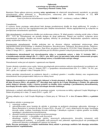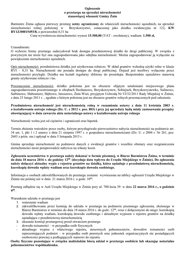 Ogłoszenie o przetargu na sprzedaż nieruchomości stanowiącej własność Gminy Żnin Burmistrz Żnina ogłasza pierwszy przetarg ustny ograniczony do właścicieli nieruchomości sąsiednich, na sprzedaż nieruchomości rolnej położonej w Brzyskorzystwi, oznaczonej jako działka ewidencyjna nr 122, KW BY1Z/00015493/8, o powierzchni 0,31 ha Cena wywoławcza nieruchomości wynosi 15.500,00 (VAT - zwolniony), wadium: 1.500 zł, Uzasadnienie: O wyborze formy przetargu zadecydował brak dostępu przedmiotowej działki do drogi publicznej. W związku z powyższym nie może być ona zagospodarowana jako odrębna nieruchomość. Można zagospodarować ją wyłącznie na powiększenie nieruchomości sąsiednich. Opis nieruchomości: przedmiotowa działka jest użytkowana rolniczo. W skład gruntów wchodzą użytki rolne w klasie RVI – 0,31 ha. Nieruchomość nie posiada dostępu do drogi publicznej. Dojazd jest możliwy wyłącznie przez nieruchomości przyległe. Działka ma kształt regularny zbliżony do prostokąta. Bezpośrednie sąsiedztwo stanowią grunty użytkowane rolniczo i las. Przeznaczenie nieruchomości: działka położona jest na obszarze objętym ustaleniami miejscowego planu zagospodarowania przestrzennego w obrębach Dochanowo, Brzyskorzystew, Sobiejuch, Brzyskorzystewko, Sulinowo, Sarbinowo, Słabomierz, Słębowo, Jaroszewo, Żnin-Wieś, przyjętym Uchwałą Nr VI/32/2011 Rady Miejskiej w Żninie, z dnia 23 lutego 2011 r. , zgodnie z którym położona jest na obszarze gruntów rolnych przeznaczonych pod zalesienie. Przedmiotowa nieruchomość jest nieruchomością rolną w rozumieniu ustawy z dnia 11 kwietnia 2003 r. o kształtowaniu ustroju rolnego (Dz. U. z 2012 r. poz. 803) i przy jej sprzedaży będą miały zastosowanie przepisy obowiązującej w dniu zawarcia aktu notarialnego ustawy o kształtowaniu ustroju rolnego Nieruchomość wolna jest od ciężarów i ograniczeń oraz hipotek. Termin złożenia wniosków przez osoby, którym przysługiwało pierwszeństwo nabycia nieruchomości na podstawie art. 34 ust. 1, pkt 1 i 2 ustawy z dnia 21 sierpnia 1997 r. o gospodarce nieruchomościami (Dz. U. z 2004 r. Nr 261, poz. 2603 z późn. zm.) upłynął w dniu 5 listopada 2015 r. Gmina sprzedaje nieruchomość na podstawie danych z ewidencji gruntów i wszelkie obmiary oraz rozgraniczenia nieruchomości może przeprowadzić nabywca na własny koszt. Zgłoszenia uczestnictwa w przetargu należy dokonać w formie pisemnej, w Biurze Burmistrza Żnina, w terminie do dnia 18 marca 2016 r. do godziny 1200 (decyduje data wpływu do Urzędu Miejskiego w Żninie). Do zgłoszenia należy dołączyć aktualny wypis z rejestru gruntów na działkę, która sąsiaduje z przedmiotową nieruchomością, kserokopię dowodu wpłaty wadium oraz kserokopie dowodu osobistego. Informacja o osobach zakwalifikowanych do przetargu zostanie wywieszona na tablicy ogłoszeń Urzędu Miejskiego w Żninie nie później niż w dniu 21 marca 2016 r. o godz. 1000. Przetarg odbędzie się w Auli Urzędu Miejskiego w Żninie przy ul. 700-lecia 39 w dniu 22 marca 2016 r., o godzinie 900. Warunkiem udziału w przetargu jest 1. wniesienie wadium 2. zakwalifikowanie przez komisję do udziału w przetargu na podstawie pisemnego zgłoszenia, złożonego w Biurze Burmistrza w terminie do dnia 18 marca 2016 r. do godz. 1200, wraz z dołączonymi do niego: kserokopią dowodu wpłaty wadium, kserokopią dowodu osobistego i aktualnym wypisem z rejestru gruntów na działkę sąsiadująca z przedmiotową nieruchomością 3. okazanie komisji przetargowej przed otwarciem przetargu - dowodu tożsamości – w przypadku osób fizycznych - aktualnego wypisu z właściwego rejestru, stosownych pełnomocnictw, dowodów tożsamości osób reprezentujących podmiot – w przypadku osób prawnych oraz jednostek organizacyjnych nie posiadających osobowości prawnej a podlegających wpisowi do rejestru. Osoby fizyczne pozostające w związku małżeńskim biorą udział w przetargu osobiście lub okazując notarialne pełnomocnictwo współmałżonka. Wpłaty wadium w pieniądzu, w wysokości 1.500 zł należy dokonać na konto Urzędu Miejskiego w Żninie w Banku Spółdzielczym „PAŁUKI” Nr 49 8181 0000 0001 2742 2000 0002. Wadium należy wpłacić najpóźniej do dnia 18 marca 2016 r. Za datę wniesienia wadium uważa się datę wpływu środków pieniężnych na rachunek Urzędu Miejskiego w Żninie. Wadium wpłacone przez uczestnika przetargu, który wygrał przetarg zaliczone zostanie na poczet ceny nabycia. Pozostała część ceny nabycia płatna jest nie później niż w dniu zawarcia umowy przenoszącej własność, w sposób umożliwiający sprawdzenie wpływu środków na rachunek zbywcy przed podpisaniem umowy. Wadium nie podlega zwrotowi, jeżeli osoba ustalona jako nabywca nie przystąpi bez usprawiedliwienia do zawarcia umowy sprzedaży w miejscu i terminie podanym przez sprzedawcę w zawiadomieniu. Koszty notarialne i sądowe ponosi nabywca nieruchomości. Wadium wniesione przez uczestników, którzy nie wygrali przetargu zostanie zwrócone w ciągu 3 dni od dnia zamknięcia przetargu. Zastrzega się prawo odwołania przetargu z ważnych powodów. Dodatkowe informacje dotyczące przetargu można uzyskać w Urzędzie Miejskim w Żninie (pokój nr 23), tel. 052 30313-01 w. 123 lub 160. Burmistrz Żnina Robert Luchowski