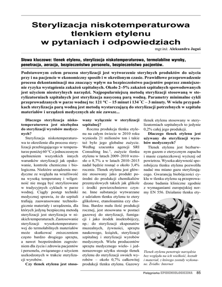 Sterylizacja niskotemperaturowa tlenkiem etylenu w pytaniach i odpowiedziach mgr.inż. Aleksandra Jaguś Słowa kluczowe: tlenek etylenu, sterylizacja niskotemperaturowa, termolabilne wyroby, penetracja, aeracja, bezpieczeństwo personelu, bezpieczeństwo pacjentów. Podstawowym celem procesu sterylizacji jest wytworzenie sterylnych produktów do użycia przy i na pacjencie w ekonomiczny sposób i w określonym czasie. Prawidłowe przeprowadzenie procesu dekontaminacji ma znaczący wpływ na bezpieczeństwo pacjentów poprzez zmniejszenie ryzyka wystąpienia zakażeń szpitalnych. Około 2–5% zakażeń szpitalnych spowodowanych jest użyciem niesterylnych narzędzi. Najpopularniejszą metodą sterylizacji stosowaną w sterylizatorniach szpitalnych jest sterylizacja nasyconą parą wodną. Parametry minimalne cykli przeprowadzanych w parze wodnej to: 121 °C – 15 minut i 134 °C – 3 minuty. W wielu przypadkach sterylizacja parą wodną jest metodą wystarczającą do sterylizacji potrzebnych w szpitalu materiałów i urządzeń medycznych ale nie zawsze... Dlaczego sterylizacja niskotemperaturowa jest niezbędna do sterylizacji wyrobów medycznych? Sterylizacja niskotemperaturowa to określenie dla procesu sterylizacji przebiegającego w temperaturze poniżej 60 °C z jednoczesnym spełnieniem wszystkich innych warunków sterylizacji jak opakowanie, kontrola chemiczna i biologiczna. Niektóre urządzenia medyczne ze względu na wrażliwość na wysoką temperaturę i wilgotność nie mogą być sterylizowane w tradycyjnych cyklach w parze wodnej. Ciągły postęp techniki medycznej sprawia, że do szpitali trafiają zaawansowane technologicznie materiały i urządzenia, dla których jedyną bezpieczną metodą sterylizacji jest sterylizacja w niskich temperaturach. Zastosowanie sterylizacji wysokotemperaturowej do termolabilnych materiałów może skutkować zniszczeniem często bardzo drogiego sprzętu, a nawet bezpośrednim zagrożeniem dla życia i zdrowia pacjentów i personelu, związanego z użyciem uszkodzonych w trakcie sterylizacji wyrobów. Czy tlenek etylenu jest stoso- wany wyłącznie w sterylizacji szpitalnej? Roczna produkcja tlenku etylenu na całym świecie w 2010 roku wyniosła 21 milionów ton i takie też było jego globalne zużycie. Według szacunku agencji SRI Consulting Inc.1, zużycie tlenku etylenu w latach 2009–2010 wzrosło o 8,7% a w latach 2010–2015 nadal będzie rosnąć o około 3,4% rocznie. Tlenek etylenu jest głównie stosowany jako produkt pośredni do produkcji chemikaliów przemysłowych takich jak glikole i środki powierzchniowo czynne. Inne substancje wytwarzane z udziałem tlenku etylenu to etery glikolowe, etanoloamina czy cholina. Bardzo mała ilość produkcji rocznej, jest stosowana w postaci gazowej do sterylizacji, fumigacji i jako środek insektobójczy, np.: do sterylizacji eksponatów muzealnych, żywności, sprzętu naukowego, książek, sterylizacji szpitalnej i sterylizacji wyrobów medycznych. Wielu producentów sprzętu medycznego wielo- i jednorazowego użytku stosuje tlenek etylenu do sterylizacji swoich wyrobów – około 0,7% całkowitej produkcji tlenku etylenu. Gazowy tlenek etylenu stosowany w sterylizatorniach szpitalnych to jedynie 0,2% całej jego produkcji. Dlaczego tlenek etylenu jest używany do sterylizacji wyrobów medycznych? Tlenek etylenu jest bezbarwnym gazem o eterycznym zapachu i masie cząsteczkowej wyższej od powietrza. Wysoka aktywność sporobójcza tlenku etylenu pozwoliła nadać mu miano gazu sterylizującego. Gwarancją biobójczości cyklu w tlenku etylenu są przeprowadzone badania kliniczne zgodnie z wymaganiami europejskiej normy EN 556. Działanie tlenku ety- Tlenek etylenu penetruje narzędzia bez względu na ich wielkość, kształt i materiał, z którego zostały wykonane. Źródło: Internet Pielęgniarka EPIDEMIOLOGICZNA 85 Tlenek etylenu – proces alkilacji bardziej wybiórczy niż oksydacja (H2O2) © 3M 2009. All Right Reserved. lenu polega na uszkadzaniu błony komórkowej i nukleoidu mikroorganizmu, co powoduje śmierć komórki. Podstawą takiego działania jest zachodząca przy udziale tlenku etylenu chemiczna reakcja alkilacji, która jest przyjazna dla sterylizowanych narzędzi w odróżnieniu od utleniającego działania nadtlenku wodoru czy kwasu nadoctowego. Właściwość ta przekłada się na wydłużenie czasu użytkowania sterylizowanych narzędzi. Kolejną ważną cechą tlenku etylenu jest jego wysoka zdolność penetracji. Tlenek etylenu penetruje tworzywa sztuczne, gumy, plastiki. Penetruje narzędzia i materiały bez względu na ich wielkość i kształt – nie ma ograniczeń dotyczących średnicy i długości przewodów. Cechy te powodują, że sterylizacja tlenkiem etylenu jest podstawową technologią sterylizacji materiałów i wyrobów medycznych wrażliwych na wysoką temperaturę i wilgotność. Dlaczego sterylizacja tlenkiem etylenu jest stosowana do sterylizacji termolabilnych wyrobów medycznych? Podstawowe cykle w tlenku etylenu to cykl w 55 °C i 37 °C. Dla wrażliwych na temperaturę materiałów i urządzeń medycznych to warunki pozwalające na skuteczną a zarazem bezpieczną sterylizację, dodatkowo żadne tworzywa sztuczne nie zmieniają struktury 86 Pielęgniarka EPIDEMIOLOGICZNA chemicznej pod wpływem tlenku etylenu. Oznacza to, że poddając procesowi sterylizacji w EO narzędzie medyczne zbudowane z gumy, metalu i szkła mamy pewność, że wszystkie elementy urządzenia pozostaną po procesie sterylizacji w niezmienionym stanie, co zagwarantuje nam bezpieczne działanie urządzenia. Czy sterylizacja tlenkiem etylenu będzie dostępna w przyszłości? Zgodnie z Protokołem Montrealskim tlenek etylenu nie uszkadza warstwy ozonowej. Protokół Montrealski, artykuł 2F dotyczy wycofania z użycia hydroksyfreonów, które będą stopniowo wycofywane począwszy od 1 stycznia 2004 roku, a całkowite wycofanie nastąpi 1 stycznia 2020 roku. N