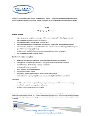 „Pollena" Przedsiębiorstwo Chemii Gospodarczej, Spółka z ograniczoną odpowiedzialnością Sp.k.producent kosmetyków i produktów chemii gospodarczej poszukuje kandydatów na stanowisko: CHEMIK Miejsce pracy: Ostrzeszów Główne zadania: opracowywanie receptur nowych produktów kosmetycznych i chemii gospodarczej opracowywanie dokumentacji rejestracyjnej testowanie nowych surowców w formulacjach opracowywanie nowych technologii wytwarzania produktów, nadzór nad procesem analiza rynku, śledzenie nowych trendów oraz przepisów prawa dotyczących kosmetyków, produktów chemii gospodarczej wykonywanie analiz fizykochemicznych surowców i wyrobów gotowych opracowywanie nowych metod analizy Oczekiwania wobec kandydata: wykształcenie wyższe chemiczne, preferowana specjalizacja: surfaktanty umiejętność analitycznego myślenia i wyciągania konstruktywnych wniosków samodzielność, dokładność i precyzja w działaniu umiejętność pracy w zespole chęć ciągłego poszerzania wiedzy optymizm i otwarty umysł znajomość języka angielskiego w stopniu komunikatywnym doświadczenie w pracy na podobnym stanowisku będzie dodatkowym atutem Oferujemy: stabilne zatrudnienie bezpośrednio przez pracodawcę na podstawie umowy o pracę możliwość zdobycia cennego doświadczenia praca w młodym, dynamicznym zespole Osoby zainteresowane ofertą pracy prosimy o przysłanie CV i listu motywacyjnego na adres: [email protected]. Z wybranymi kandydatami skontaktujemy się osobiście. W CV prosimy o zamieszczenie następującej klauzuli: „Wyrażam zgodę na przetwarzanie moich danych osobowych dla potrzeb procesu rekrutacji, zgodnie z ustawą z dnia 29.08.1997 r. o ochronie danych osobowych (tj. Dz.U. z 2002 nr 101, poz.926”