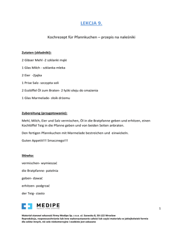 LEKCJA 9. Kochrezept für Pfannkuchen – przepis na naleśniki Zutaten (składniki): 2 Gläser Mehl -2 szklanki mąki 1 Glas Milch - szklanka mleka 2 Eier -2jajka 1 Prise Salz- szczypta soli 2 Esslöffel Öl zum Braten- 2 łyżki oleju do smażenia 1 Glas Marmelade- słoik drżemu Zubereitung (przygotowanie): Mehl, Milch, Eier und Salz vermischen, Öl in die Bratpfanne geben und erhitzen, einen Kochlöffel Teig in die Pfanne geben und von beiden Seiten anbraten. Den fertigen Pfannkuchen mit Marmelade bestreichen und einwickeln. Guten Appetit!!! Smacznego!!! Słówka: vermischen- wymieszać die Bratpfanne- patelnia geben- dawać erhitzen- podgrzać der Teig- ciasto 1 Materiał stanowi własność firmy Medipe Sp. z o.o. ul. Szewska 8, 50-122 Wrocław Reprodukcja, rozpowszechnianie lub inne wykorzystywanie całości lub części materiału w jakiejkolwiek formie dla celów innych, niż cele niekomercyjne i osobiste jest zakazane von beiden Seiten- z dwóch stron anbraten- usmażyć fertig- gotowy bestreichen- posmarować und-i einwickeln- zawijać Przysłowia: Den Letzten beißen die Hunde - Ostatnich gryzą psy. Alte Liebe rostet nicht - Stara miłość nie rdzewieje. 2 Materiał stanowi własność firmy Medipe Sp. z o.o. ul. Szewska 8, 50-122 Wrocław Reprodukcja, rozpowszechnianie lub inne wykorzystywanie całości lub części materiału w jakiejkolwiek formie dla celów innych, niż cele niekomercyjne i osobiste jest zakazane