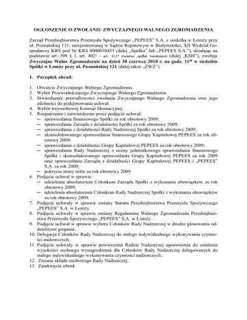 OGŁOSZENIE O ZWOŁANIU ZWYCZAJNEGO WALNEGO ZGROMADZENIA Zarząd Przedsiębiorstwa Przemysłu Spożywczego „PEPEES” S.A. z siedzibą w Łomży przy ul. Poznańskiej 121, zarejestrowanej w Sądzie Rejonowym w Białymstoku, XII Wydział Gospodarczy KRS pod Nr KRS 0000038455 (dalej „Spółka” lub „PEPEES S.A.”), działając na podstawie art. 399 § 1, art. 402¹ i art. 402² Kodeksu spółek handlowych (dalej „KSH”), zwołuje Zwyczajne Walne Zgromadzenie na dzień 30 czerwca 2010 r. na godz. 1100 w siedzibie Spółki w Łomży przy ul. Poznańskiej 121 (dalej także „ZWZ”). 1. Porządek obrad: 1. Otwarcie Zwyczajnego Walnego Zgromadzenia. 2. Wybór Przewodniczącego Zwyczajnego Walnego Zgromadzenia. 3. Stwierdzenie prawidłowości zwołania Zwyczajnego Walnego Zgromadzenia oraz jego zdolności do podejmowania uchwał. 4. Wybór trzyosobowej Komisji Skrutacyjnej. 5. Rozpatrzenie i zatwierdzenie przez podjęcie uchwał: ─ sprawozdania finansowego Spółki za rok obrotowy 2009; ─ sprawozdania Zarządu z działalności Spółki za rok obrotowy 2009; ─ sprawozdania z działalności Rady Nadzorczej Spółki za rok obrotowy 2009; ─ skonsolidowanego sprawozdania finansowego Grupy Kapitałowej PEPEES za rok obrotowy 2009; ─ sprawozdania z działalności Grupy Kapitałowej PEPEES za rok obrotowy 2009; ─ sprawozdania Rady Nadzorczej z oceny jednostkowego sprawozdania finansowego Spółki i skonsolidowanego sprawozdania Grupy Kapitałowej PEPEES za rok 2009 oraz sprawozdania Zarządu z działalności Grupy Kapitałowej PEPEES i „PEPEES” S.A. za rok 2009; ─ pokrycia straty netto za rok obrotowy 2009. 6. Podjęcie uchwał w sprawie: ─ udzielenia absolutorium Członkom Zarządu Spółki z wykonania obowiązków za rok obrotowy 2009; ─ udzielenia absolutorium Członkom Rady Nadzorczej Spółki z wykonania obowiązków za rok obrotowy 2009. 7. Podjęcie uchwały w sprawie zmiany Statutu Przedsiębiorstwa Przemysłu Spożywczego „PEPEES” S.A. w Łomży. 8. Podjęcie uchwały w sprawie zmiany Regulaminu Walnego Zgromadzenia Przedsiębiorstwa Przemysłu Spożywczego „PEPEES” S.A. w Łomży. 9. Podjęcie uchwał w sprawie wyboru Członków Rady Nadzorczej w drodze głosowania oddzielnymi grupami. 10. Delegacja Członków Rady Nadzorczej do stałego indywidualnego wykonywania czynności nadzorczych. 11. Podjęcie uchwały w sprawie powierzenia Radzie Nadzorczej uprawnienia do ustalenia wysokości osobnego wynagrodzenia dla Członków Rady Nadzorczej delegowanych do stałego indywidualnego wykonywania czynności nadzorczych. 12. Zmiana składu osobowego Rady Nadzorczej. 13. Zamknięcie obrad. 2. Proponowane zmiany Statutu W związku z zamierzoną zmianą Statutu Przedsiębiorstwa Przemysłu Spożywczego „PEPEES” Spółka Akcyjna, stosownie do art. 402 § 2 KSH, poniżej powołane zostają dotychczas obowiązujące postanowienia oraz treść projektowanych zmian Statutu: Dotychczasowe brzmienie art.23.2 Statutu Spółki: „Rada Nadzorcza oraz akcjonariusze reprezentujący co najmniej 10% kapitału akcyjnego mogą żądać umieszczenia poszczególnych spraw w porządku obrad Walnego Zgromadzenia”. Proponowane brzmienia art. 23.2 Statutu Spółki: „Rada Nadzorcza oraz akcjonariusze reprezentujący co najmniej 5 % kapitału akcyjnego mogą żądać umieszczenia poszczególnych spraw w porządku obrad Walnego Zgromadzenia”. Dotychczasowe brzmienie art.24 Statutu Spółki: „Walne Zgromadzenia odbywają się w Warszawie lub w miejscu siedziby Spółki.” Proponowane brzmienia art. 24 Statutu Spółki: „Walne Zgromadzenia odbywają się w miejscu siedziby Spółki.” 3. Prawa Akcjonariuszy Zgodnie z art. 401 § 1 KSH, Akcjonariuszowi lub Akcjonariuszom Spółki reprezentującym co najmniej jedną dwudziestą kapitału zakładowego przysługuje prawo żądania umieszczenia określonych spraw w porządku obrad ZWZ. Żądanie to, zawierające uzasadnienie lub projekt uchwały dotyczącej proponowanego punktu porządku obrad, powinno być złożone Zarządowi PEPEES S.A. nie później niż 21 dni przed wyznaczonym terminem ZWZ, tj. do dnia 9 czerwca 2010 roku. Żądanie to może zostać złożone w postaci elektronicznej na adres poczty elektronicznej Spółki: [email protected] bądź w formie pisemnej na adres: Zarząd Przedsiębiorstwa Przemysłu Spożywczego „PEPEES” S.A. ul. Poznańska 121, 18-402 Łomża. Jeżeli żądanie spełnia wymagania prawa, Zarząd Spółki jest obowiązany niezwłocznie, jednak nie później niż na 18 dni przed wyznaczonym terminem ZWZ, tj. do dnia 12 czerwca 2010 roku ogłosić zmiany w porządku obrad, wprowadzone na żądanie Akcjonariuszy. Ogłoszenie następuje w sposób właściwy dla zwołania Walnego Zgromadzenia. Ponadto, na podstawie art. 401 § 4 KSH, Akcjonariusz lub Akcjonariusze Spółki reprezentujący co najmniej jedną dwudziestą kapitału zakładowego mogą przed terminem ZWZ zgłaszać projekty uchwał dotyczące spraw wprowadzonych do porządku obrad Zwyczajnego Walnego Zgromadzenia lub spraw, które mają zostać wprowadzone do porządku obrad. Zgłoszenie to może być dokonane w postaci elektronicznej na adres poczty elektronicznej Spółki: [email protected] bądź w formie pisemnej na adres: Zarząd Przedsiębiorstwa Przemysłu Spożywczego „PEPEES” S.A. ul. Poznańska 121, 18-402 Łomża. Jeżeli zgłoszenie spełnia wymagania prawa i opisane poniżej wymogi formalne, Spółka niezwłocznie ogłasza projekty uchwał na stronie internetowej Spółki. Akcjonariusze lub ich pełnomocnicy wykonujący którekolwiek z powyższych uprawnień są zobowiązani załączyć do powyższych żądań/ zgłoszeń dokumenty i informacje wymagane przez Spółkę jako załączniki do zawiadomienia o udzieleniu pełnomocnictwa w postaci elektronicznej (zobacz wymogi opisane w punkcie 5) oraz zaświadczenie lub świadectwo depozytowe wydane przez podmiot prowadzący rachunek papierów wartościowych na którym z