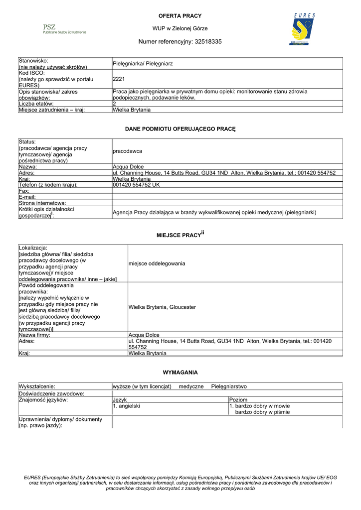 OFERTA PRACY WUP w Zielonej Górze Numer referencyjny: 32518335 Stanowisko: (nie należy używać skrótów) Kod ISCO: (należy go sprawdzić w portalu EURES) Opis stanowiska/ zakres obowiązków: Liczba etatów: Miejsce zatrudnienia – kraj: Pielęgniarka/ Pielęgniarz 2221 Praca jako pielęgniarka w prywatnym domu opieki: monitorowanie stanu zdrowia podopiecznych, podawanie leków. 2 Wielka Brytania DANE PODMIOTU OFERUJĄCEGO PRACĘ Status: (pracodawca/ agencja pracy tymczasowej/ agencja pośrednictwa pracy) Nazwa: Adres: Kraj: Telefon (z kodem kraju): Fax: E-mail: Strona internetowa: Krótki opis działalności gospodarczeji: pracodawca Acqua Dolce ul. Channing House, 14 Butts Road, GU34 1ND Alton, Wielka Brytania, tel.: 001420 554752 Wielka Brytania 001420 554752 UK Agencja Pracy działająca w branży wykwalifikowanej opieki medycznej (pielęgniarki) MIEJSCE PRACYii Lokalizacja: [siedziba główna/ filia/ siedziba pracodawcy docelowego (w przypadku agencji pracy tymczasowej)/ miejsce oddelegowania pracownika/ inne – jakie] Powód oddelegowania pracownika: [należy wypełnić wyłącznie w przypadku gdy miejsce pracy nie jest główną siedzibą/ filią/ siedzibą pracodawcy docelowego (w przypadku agencji pracy tymczasowej)] Nazwa firmy: Adres: Kraj: miejsce oddelegowania Wielka Brytania, Gloucester Acqua Dolce ul. Channing House, 14 Butts Road, GU34 1ND Alton, Wielka Brytania, tel.: 001420 554752 Wielka Brytania WYMAGANIA Wykształcenie: Doświadczenie zawodowe: Znajomość języków: wyższe (w tym licencjat) Język 1. angielski medyczne Pielęgniarstwo Poziom 1. bardzo dobry w mowie bardzo dobry w piśmie Uprawnienia/ dyplomy/ dokumenty (np. prawo jazdy): EURES (Europejskie Służby Zatrudnienia) to sieć współpracy pomiędzy Komisją Europejską, Publicznymi Służbami Zatrudnienia krajów UE/ EOG oraz innych organizacji partnerskich, w celu dostarczania informacji, usług pośrednictwa pracy i poradnictwa zawodowego dla pracodawców i pracowników chcących skorzystać z zasady wolnego przepływu osób Inne istotne wymagania: Wykształcenie conajmniej na pozimomie licencjatu w zakresie pielęgniarstwa. Osoba ubiegająca się o to stanowisko będzie musiała potwierdzić znajomość jezyka angielskiego poprzez przystąpienie do testu językowego IELTS ( więcej informacji o teście na stronie:https://www.nmc.org.uk/registration/joining-the-register/trained-outside-theeueea/ielts/). Osoba zatrudniona na tym stanowisku musi mieć wpis do NMC (Rada Pielęgniarstwa i Położnictwa w Wielkiej Brytanii) i posiadać tak zwany numer PIN (numer rejestracyjny-przyznawany indywidualnie) lub być w trakcie oczekiwania na numer PIN. Staż ogółem: 1.0 WYNAGRODZENIE I WARUNKI ZATRUDNIENIA Wysokość pensji brutto: Wysokość pensji netto: Waluta, w jakiej wypłacana jest pensja: Rodzaj stawki wynagrodzenia: (godzinowa/ tygodniowa/ miesięczna/ roczna/ inna) Premie: Dodatkowe świadczenia (zakwaterowanie, wyżywienie, koszty związane ze zmianą miejsca zamieszkania, koszty podróży itp.): Nazwa firmy, z którą zostanie podpisana umowa: Rodzaj umowy: (umowa o pracę, umowa zlecenia, wolontariat, praktyka zawodowa/ staż, praca zdalna, agencja pracy tymczasowej, inne): Wymiar czasu pracy (praca na pełen etat/ część etatu): Czas trwania umowy: (nieokreślony/ określony) 14,00 Liczba godzin tygodniowo: Zmiany i praca w dni wolne: Data rozpoczęcia: Inne informacje: 40,00 Praca według grafiku. Funt szterling Czasowy ze stawką godzinową Dla osób oczekujących na numer PIN stawka wynosi 9,50 GBP brutto na godzinę, po uzyskaniu numeru PIN wzrasta do 14 GBP brutto na godzinę. Pracodawca pomaga w znalezieniu zakwaterowania. Pracodawca zapewnia odbiór osoby zatrudnionej z lotniska i transport do miejsca docelowego. Acqua Dolce umowa o pracę pełen etat Data wygaśnięcia umowy (w przypadku umowy na czas określony): nieokreślony Praca według grafiku. SPOSÓB SKŁADANIA WNIOSKU Wymagane dokumenty (list motywacyjny, CV itp.): Język, w którym muszą być sporządzone przedkładane dokumenty: Do kogo należy wysłać dokumenty: (do pracodawcy/ doradcy EURES) Gdzie należy wysłać dokumenty: (adres, adres e-mail, nr faksu z kodem kraju itp.) Dane teleadresowe doradcy EURES lub przedstawiciela pracodawcy: (nazwisko, adres, telefon, fax, e-mail itp.) Aplikowanie poprzez stronę internetową. angielski do pracodawcy https://jobsearch.direct.gov.uk/GetJob.aspx?JobID=32518335 Grace O'Brien Candidate Administrator Acqua Dolce Limited T: 00441420 554752 E: [email protected] In: www.acquadolce.co.uk DODATKOWE INFORMACJE WAŻNOŚĆ 2016-07-13 Data publikacji: Termin przedkładania podań o pracę / 2016-12-31 zakończenia ważności oferty: EURES (Europejskie Służby Zatrudnienia) to sieć współpracy pomiędzy Komisją Europejską, Publicznymi Służbami Zatrudnienia krajów UE/ EOG oraz innych organizacji partnerskich, w celu dostarczania informacji, usług pośrednictwa pracy i poradnictwa zawodowego dla pracodawców i pracowników chcących skorzystać z zasady wolnego przepływu osób Uprzejmie informujemy, że skontaktujemy się wyłącznie z wybranymi kandydatami. UWAGA: 1. Umowa z zagranicznym pracodawcą jest zawierana, co do zasady, zgodnie z prawem kraju zatrudnienia. Oznacza to, że wszystkie roszczenia odnośnie warunków, które obejmuje umowa, można kierować wyłącznie do odpowiedniego sądu w kraju zatrudnienia. Publiczne służby zatrudnienia (EURES) nie mogą pośredniczyć ani reprezentować pracownika w sądzie kraju zatrudnienia w przypadku sporu z pracodawcą. 2. Publiczne służby zatrudnienia (EURES) dokładają wszelkich starań, aby zapewnić rzetelność i wiarygodność ofert pracy zgłoszonych w lokalnym urzędzie pracy. Należy wyjaśnić, że oferta pracy została zgłoszona przez stronę trzecią i EURES nie odpowiada za ewentualne rozbieżności między warunkami pracy określonymi w ofercie pracy i warunkami oferowanymi przez potencjalnego pracodawcę. 